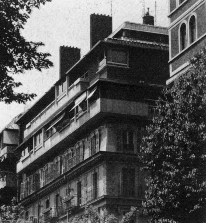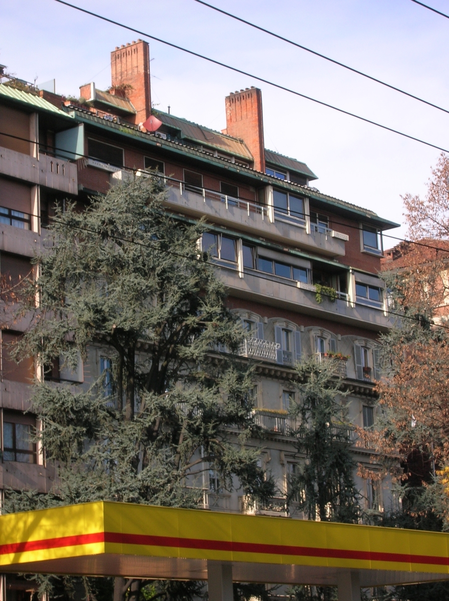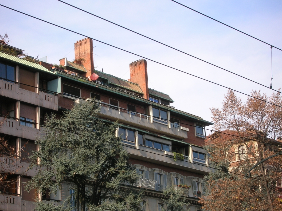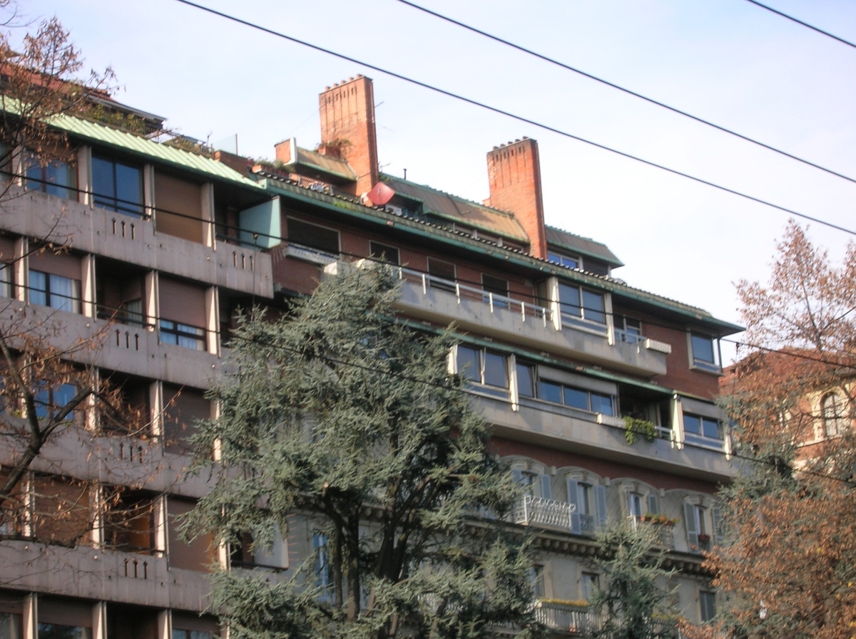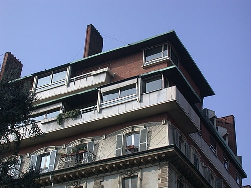 Alla sostanziale verticalità del grande edificio risponde, al di sopra del cornicione dentellato da archetti, un articolato susseguirsi di fasce di parapetti e di finestre a nastro sapientemente interrotte da sporti e setti verticali sormontati da una breve falda di tetto in rame.