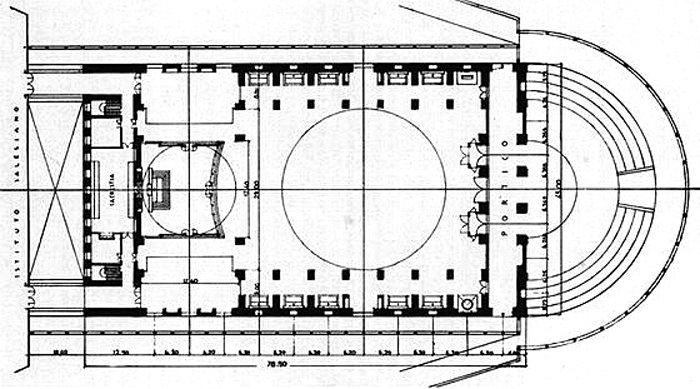 La chiesa fu progettata assieme alla piazza per conferire all’intero sistema un carattere unitario. Questo senso di unità è ottenuto attraverso l‘ordine gigante delle facciate residenziali, che unifica nel disegno due piani e consente alle abitazioni una relazione diretta con il tamburo principale della chiesa. Dal punto di vista tipologico le residenze riprendono le indicazioni della piazza porticata contenute nel piano particolareggiato del 1942.