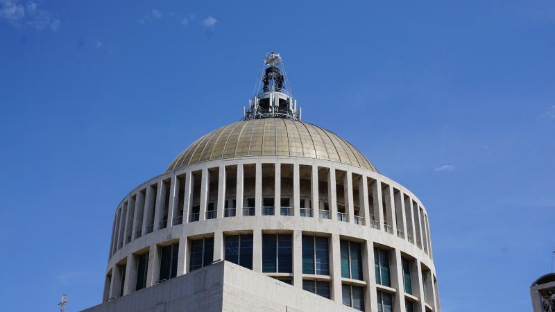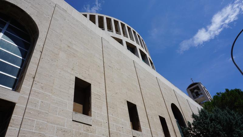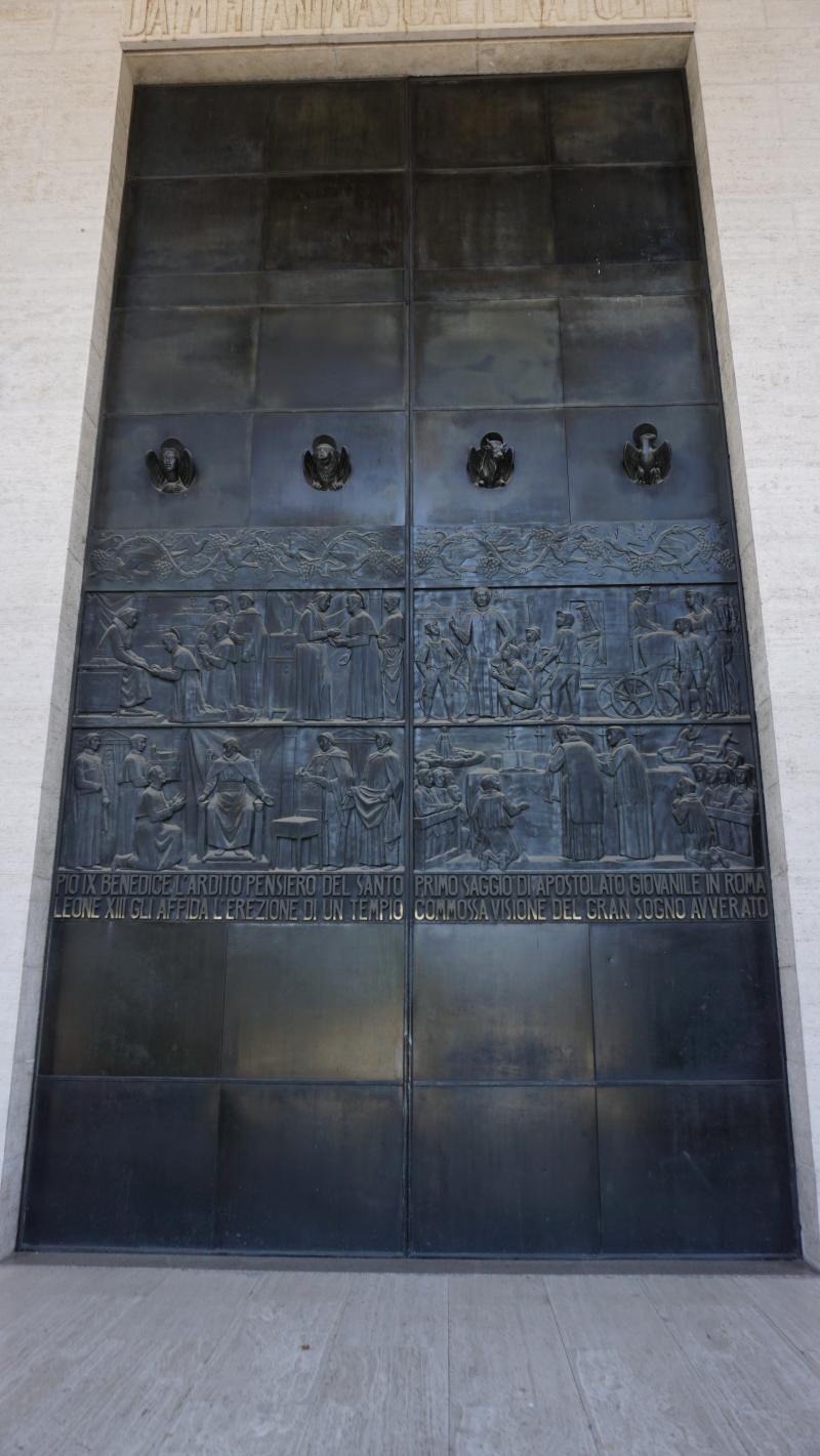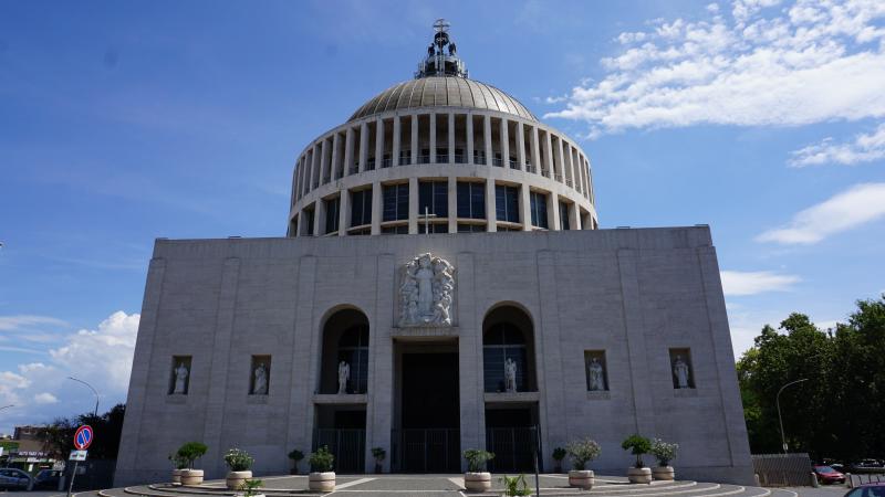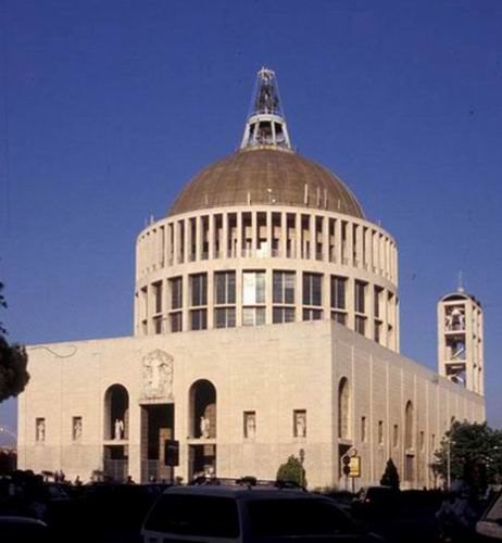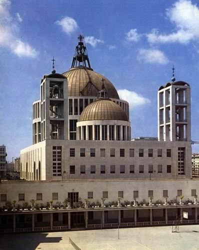 La basilica fu costruita agli inizi degli anni cinquanta del Novecento dal noto architetto siciliano Gaetano Rapisardi, che vinse il concorso indetto dalla Pontificia Commissione per l’Arte Sacra per conto dei Salesiani. L’impianto della chiesa è quasi primitivo: su un basamento rettangolare alto 20 m poggiano due cupole, la più piccola in corrispondenza dell’altare e la maggiore al centro, alta circa 47 m.