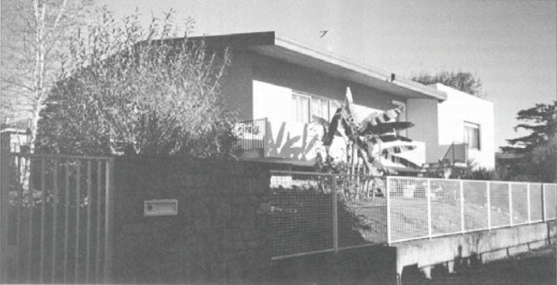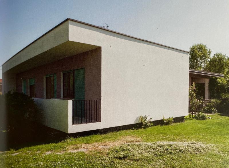 «L’edificio, a un piano e mezzo fuori terra, ha struttura portante in calcestruzzo, tamponamenti in laterizio e finiture in intonaco decorato con una delicata e raffinata combinazione di sfumature pastello nei toni rosa, azzurro, violetto e beige rimasta immutata nel tempo grazie all’attenzione e alla cura dei proprietari. L’articolazione volumetrica dell’edificio appare ispirata ai modelli dell’architettura internazionale di ascendenza razionalista, resi forse più vicini al gusto della committenza grazie all’adozione di una copertura a falde. Si tratta di una delle più significative realizzazioni sviluppate su progetto dall’Ufficio Consulenza Case Dipendenti Olivetti (UCCD), braccio operativo della Direzione dei Servizi Sociali dell’azienda che forniva assistenza tecnica in termini di progettazione, direzione lavori, consulenza per l’acquisto di terreni, ai dipendenti interessati alla costruzione o all’adattamento della propria abitazione e per cui sviluppò circa 400 progetti, molti dei quali realizzati. L’attività dell’Ufficio, che operò dal 1954 al 1968 sotto la direzione di Emilio Aventino Tarpino, contribuì a elevare la qualità dell’ambiente costruito di Ivrea e del Canavese divulgando, con adattamenti formali e costruttivi che lo rendevano accettabile presso un pubblico più ampio, lo spirito innovativo promosso dalla Olivetti nelle realizzazioni commissionate negli stessi anni ai suoi consulenti più famosi. L’importanza attribuita dall’azienda all’azione dell’UCCD è testimoniata dalla richiesta effettuata a Figini e Pollini, Albini e Helg, Mario Fiorentino e allo stesso Tarpino di elaborare soluzioni tipologiche da utilizzarsi come modelli per lo sviluppo dei progetti dell’Ufficio, che provvide ad applicarli su larga scala». (Patrizia Bonifazio, Enrico Giacopelli, Il paesaggio futuro. Letture e norme per il patrimonio dell'architettura moderna a Ivrea, Umberto Allemandi & C., Torino 2007, p. 67)
