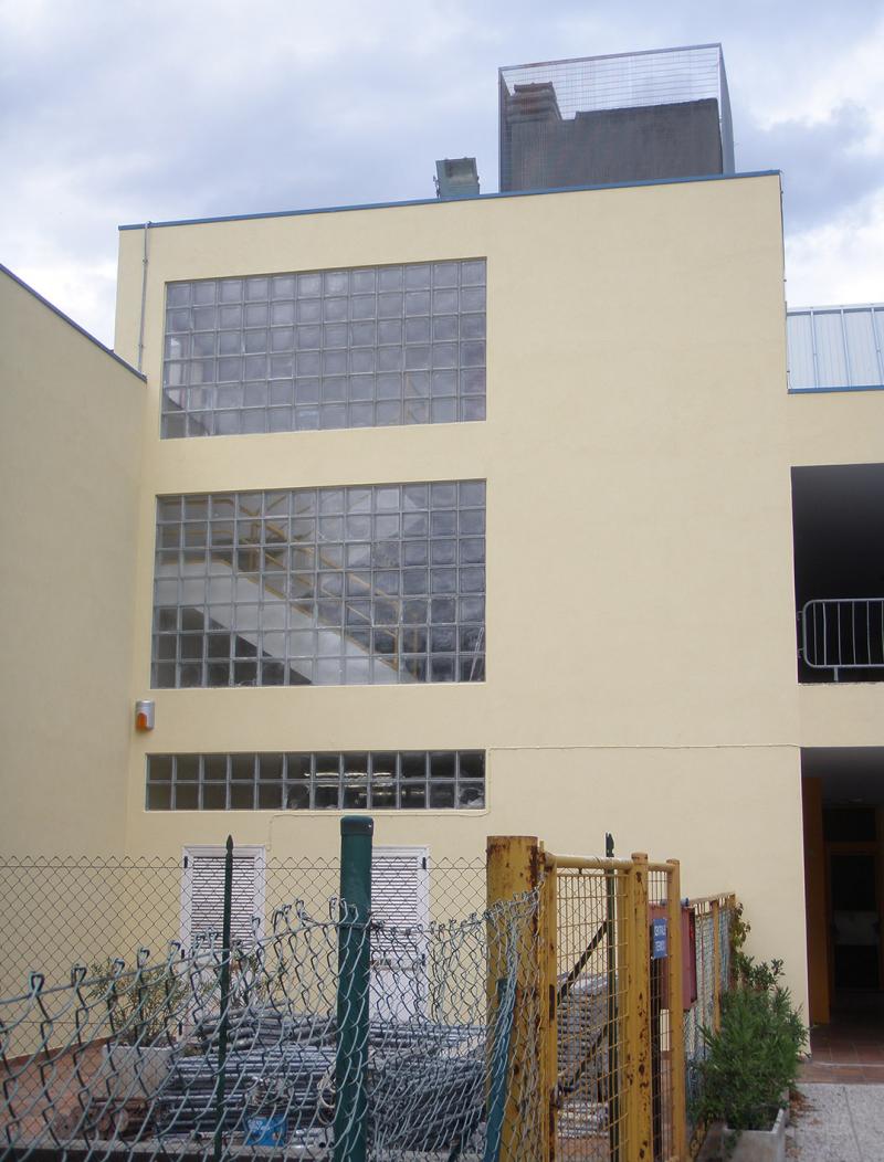 L’insediamento ricalca la struttura ortogonale viaria circostante e organizza le varie parti del complesso scolastico in elementi ben definiti e giustapposti: la palestra, i collegamenti verticali e le due ali contenenti le aule affacciate sul corridoio centrale illuminato zenitalmente. Il portico continuo, qui evidentemente inutile in un contesto molto più piccolo, è sostituito con un passaggio semi-coperto grazie ad una grande trave reticolare spaziale che lascia intuire la doppia altezza del volume retrostante e che collega le aule alla palestra. Al piano terra, il portico connette direttamente le aree aperte di servizio antistanti (il parcheggio, un piccolo parco e un’arena segnata da un muro in cemento armato semicircolare) alle corte verde restrostante. (MP)