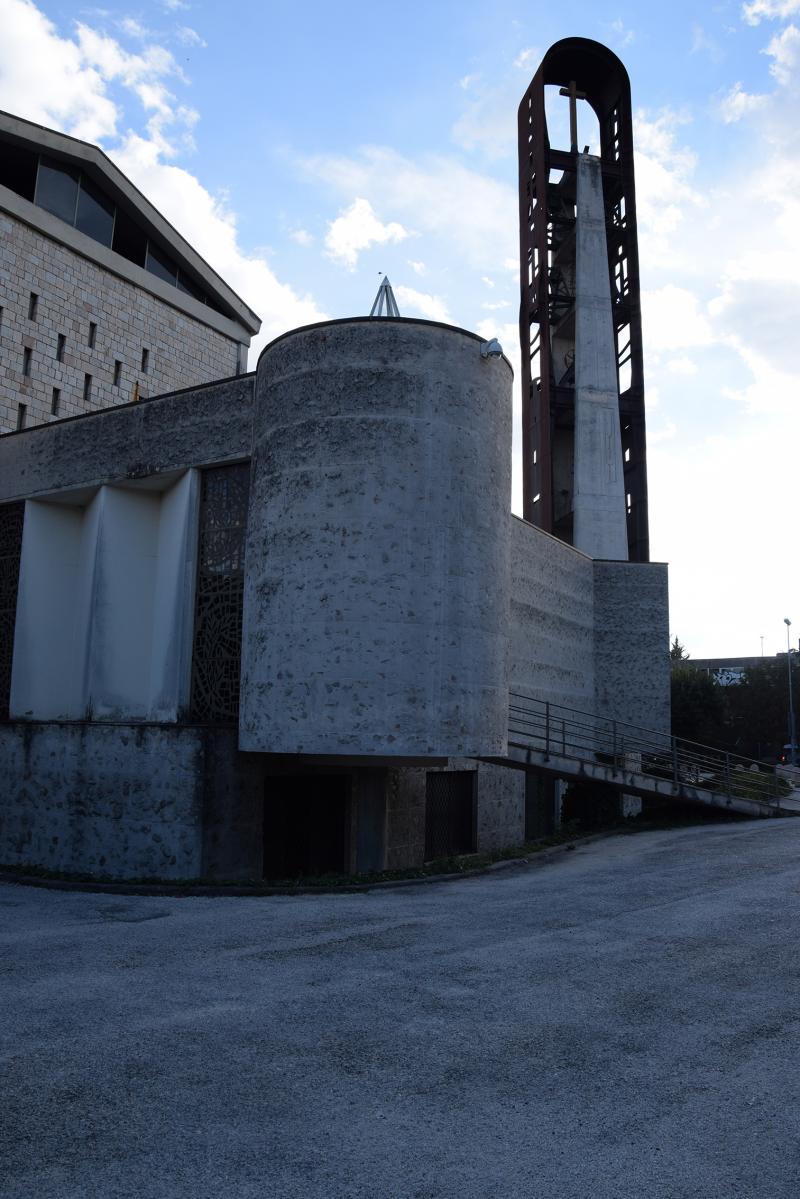 Il complesso si colloca su un lotto triangolare rivolto verso il centro abitato e affacciato lungo una delle strade di collegamento principali; al vertice del lotto è collocata la casa canonica, posta in continuità con la chiesa alla quale si affianca il campanile. Il volume è inoltre composto da una piattaforma laterale che ospita i locali destinati alle attività pastorali, e si caratterizza per la presenza di verde attrezzato che costituisce il collegamento con il polo didattico posto lateralmente. Dal punto di vista planimetrico, l’edificio si compone di due parti: quella risalente al dopoguerra ha una forma esagonale e presenta un’abside rettangolare aggettante nella parte terminale, mentre la seconda parte, relativa all’ampliamento, è composta da un parallelepipedo che si interseca con la preesistenza e che costituisce la nuova facciata della chiesa. L’area del presbiterio, mantenuta nella sua posizione originaria, è rialzata su tre gradini e ospita l’ambone, collocato a sinistra, mentre a destra si trova il fonte battesimale. L’ingresso nei tre lati della controfacciata presenta un volume cavo da cui si accede anche alla cappella laterale.