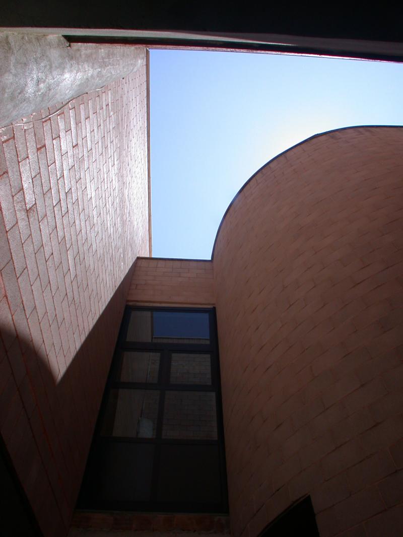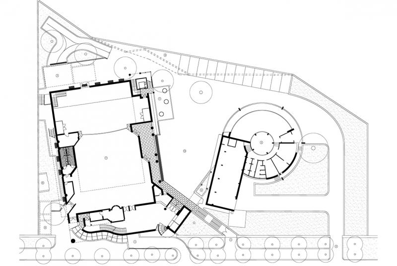 Una corte esterna attrezzata e la copertura del teatro allestita come area per spettacoli completano l’insieme dei volumi fortemente caratterizzati dal trattamento delle facciate in cemento colorato in pasta su cui affiorano le membrature strutturali in calcestruzzo a vista. In posizione arretrata e riparata rispetto alla strada, la biblioteca si sviluppa attorno a uno spazio circolare, con livelli sfalsati affacciati su una doppia altezza centrale, coperta da un grande lucernario. Ampie vetrate garantiscono la continuità visiva con gli spazi verdi circostanti.