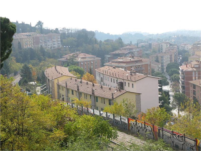 L’intervento di Venturino Ventura, parte del piano INA-CASA che interessa l’intero territorio nazionale dal 1949 al 1963, si inserisce in un contesto di espansione non regolamentata del tessuto urbano della città di Perugia verso sud, lungo l’asse di via dei Filosofi.