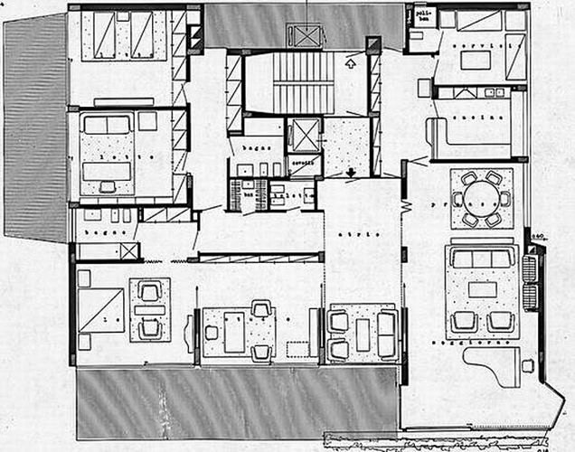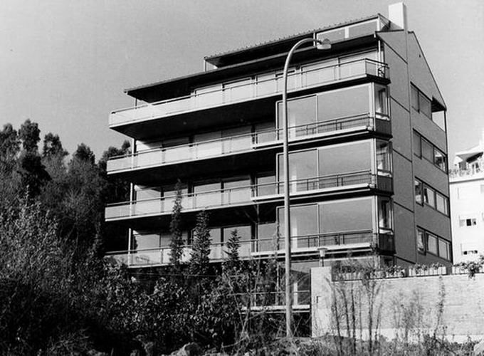 Essi scandiscono 5 fasce longitudinali di dimensione variabile in cui sono ricavati gli ambienti: le stanze da letto ed i servizi sui bordi, soggiorno e cucina nelle intermedie e collegamenti verticali nella centrale. L’edificio ha una sezione inclinata determinata dall'arretramento progressivo delle logge a sbalzo che di contro definisce un affaccio a monte della collina dei soggiorni. L’edificio ospita 10 alloggi, due grandi nel piano tipo e una coppia di duplex negli ultimi due livelli.