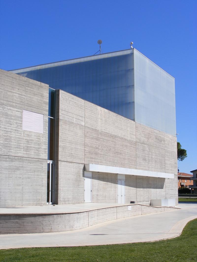 - Materiale di facciata: calcestruzzo armato a vista, rivestimento della torre scenica con pannelli di policarbonato alveolare retroilluminato