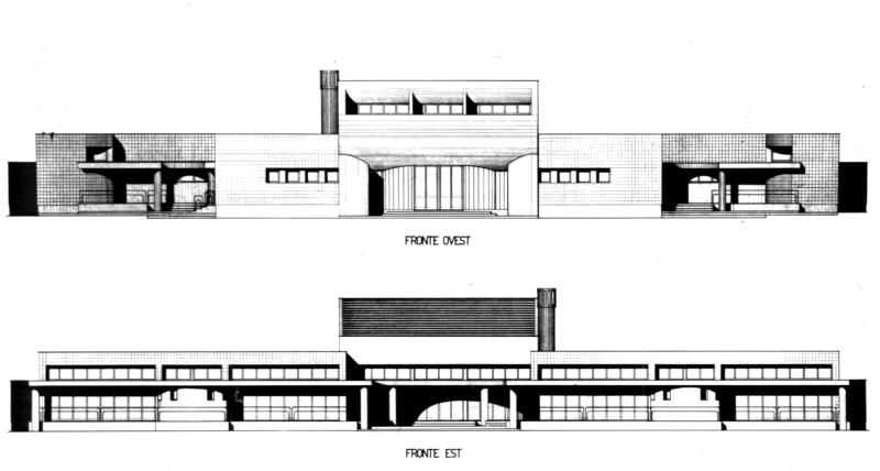 La visiera che scorre per tutto il fronte, sostenuta da pilastri tondi in cemento armato, spezza l’incidenza dei raggi solari e consente le attività libere en plein air anche in caso di maltempo. Il grande salone centrale rappresenta il fulcro della scuola. Una leggera rampa, sottostante la gradonata (capace di 184 posti a sedere), immette nell’atrio delle attività libere, sfruttabile come palcoscenico, che disimpegna l’intero complesso e l’uscita all’aperto.