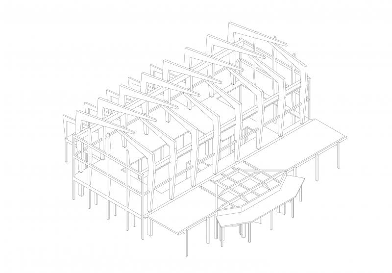 La struttura della sala macchine è risolta da portali a tre cerniere accavallati in chiave. Il particolare disegno del telaio consente di ricavare, nella parte centrale della copertura, un’asola di luce. I telai a sezione variabile, innestati sui pilastri del piano terra con eleganti cerniere lasciate a vista, ritmano anche i prospetti longitudinali. Su di essi, due fasce di aperture consentono la piena illuminazione della sala. All'esterno il calcestruzzo lasciato a vista dell’ossatura è accostato a pareti di tamponamento rivestite di piccole tessere vetrose quadrate di colore chiaro.