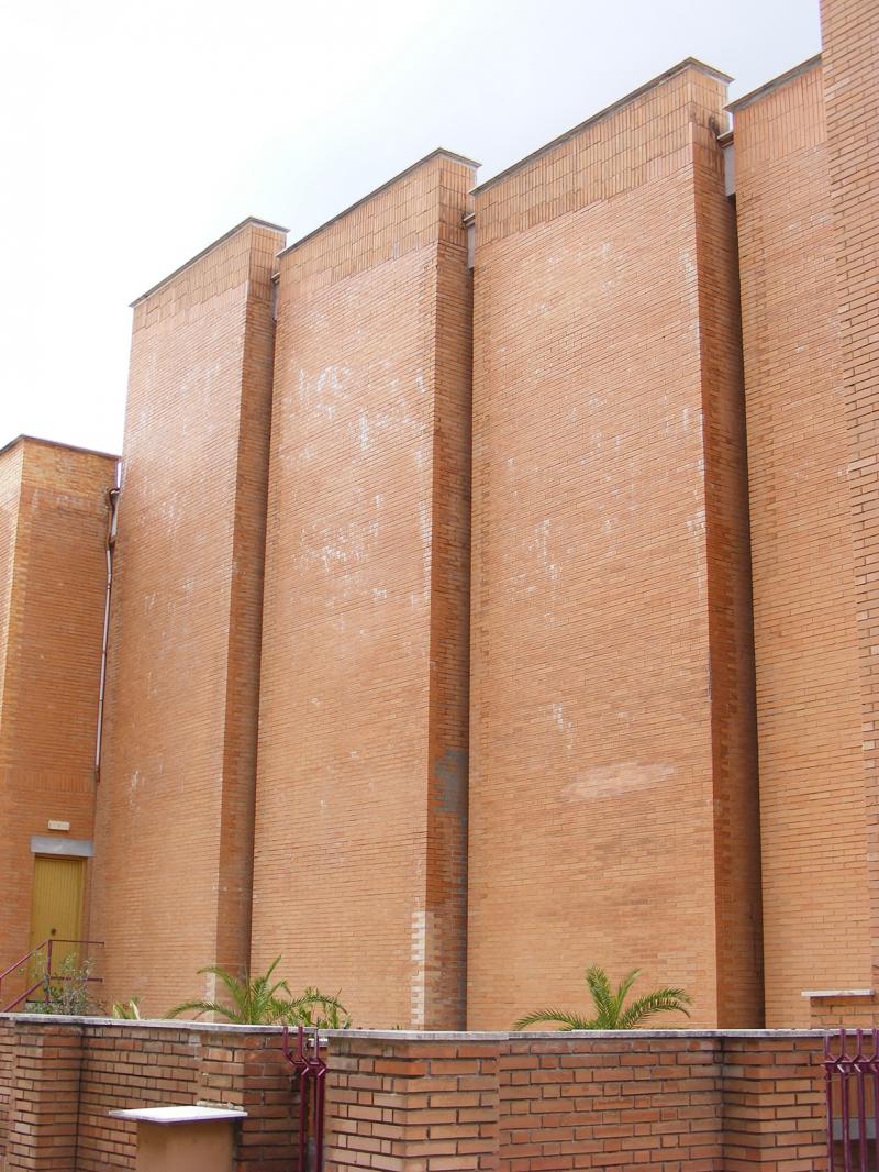 I pannelli, in cemento armato e rivestiti in cortina di mattoni su entrambe le facce, leggermente distanziati tra loro, formano alte e strette fessure finestrate che fanno entrare una luce morbida lungo l’unica navata, il battistero e l’altare maggiore ai lati dell’ingresso. La tensione spaziale è prodotta anche dall'accentuazione della inclinazione della superficie rigata della copertura man mano che si procede verso l’altare che è segnalato come fulcro della composizione dalla luce naturale che provenendo dall’alto, da una grande apertura nascosta, accresce la sacralità del luogo.