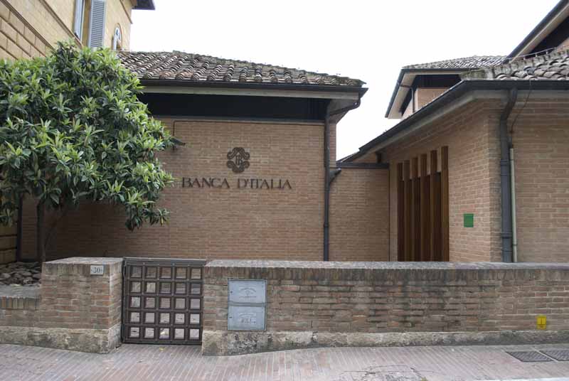 Il complesso architettonico, molto articolato nella planimetria e nella volumetria, è costituito dall'assemblaggio di tre corpi di fabbrica che concatenano le funzioni della Banca. L'edificio s'inserisce nel tessuto edilizio mediante un sistema di rampe e gradinate che mettono in comunicazione i due dislivelli su cui il lotto insiste e risolve in modo efficace il rapporto tra nuovo e antico, grazie alla cura minuziosa del dettaglio e all'uso magistrale del mattone. La cortina muraria, che presenta una massiccia plasticità, è tema formale e compositivo che qualifica l'opera.