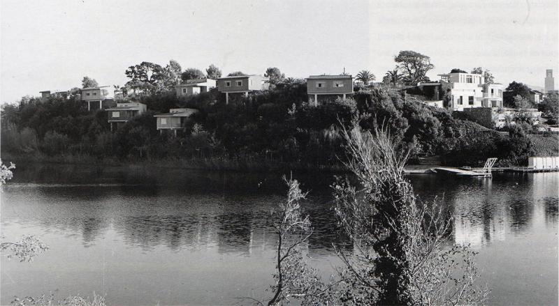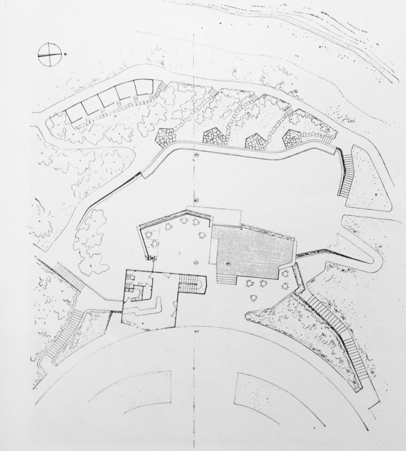 Il piccolo edificio, destinato originariamente a bar, ristorante e sala da ballo, è inserito in un terreno scosceso verso il lago che il progetto rimodella in una serie di terrazze, rampe, ripiani fino alla spiaggia. Interessante esempio di un tipo edilizio che si sviluppa in questi anni, rappresenta il fulcro di un piccolo villaggio turistico composto, in una originale visione, di minuscoli alloggi per vacanza impostati su palafitte e nascosti tra la vegetazione (che verranno realizzati qualche anno dopo). L’edificio, sensibile allo straordinario contesto paesaggistico, è giocato su un disegno planimetrico caratterizzato da lievi cambi di direzione delle pareti e su una configurazione spaziale animata da sfalsamenti di quota che articolano l’unico grande ambiente arricchito da maioliche di Leoncillo e da pavimenti in marmo, cotto e ceramica di Vietri. Raffinati e moderni l’accostamento e la combinazione di materiali diversi: i blocchi di pietra calcarea locale a vista per il muro grezzo incassato nel terreno, il calcestruzzo martellinato dell’ossatura portante, i vasti campi vetrati aperti verso il suggestivo paesaggio del lago, i sottili pilastrini metallici della leggera struttura sommitale, l’unica parte visibile dalla strada.