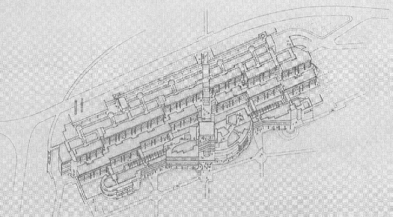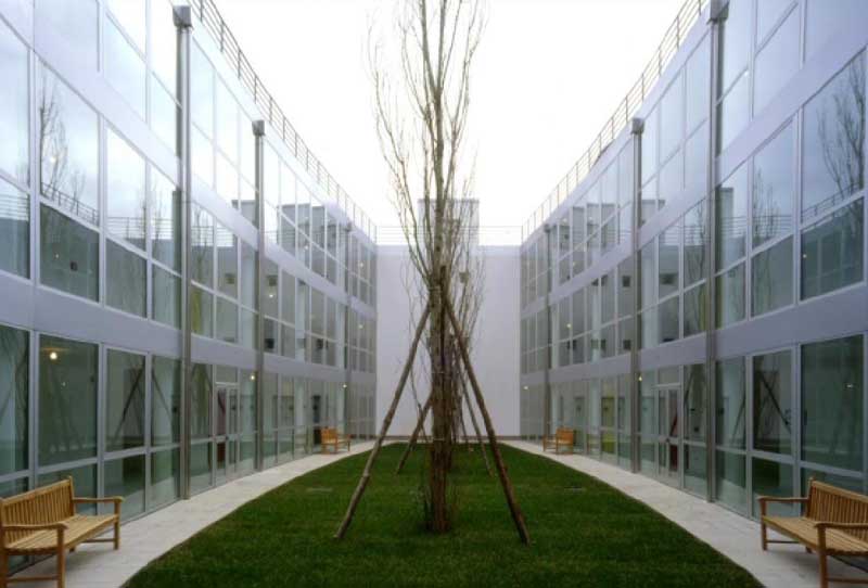 Interessante soluzione tipologica e compositiva, articolata sul collegamento di volumi con valenze formali diverse, valorizzando la socialità.