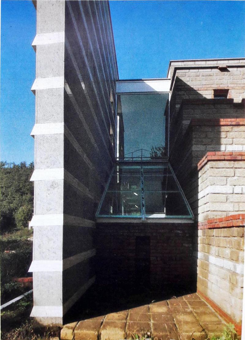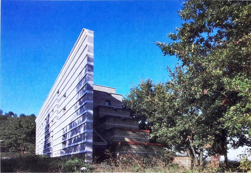 Il setto verso la valle, aperto alla vista del lago, è, invece, rifinito su entrambe le facce da lastre di peperino con ricorsi di masselli di travertino ed è forato da aperture che inquadrano il suggestivo paesaggio lacustre. Unica eccezione nella rigida impostazione è costituita da una solitaria e stretta loggetta a sbalzo protesa verso il lago. I materiali e le tecniche costruttive locali sono reinterpretati in chiave moderna e apparecchiati in modo da valorizzarne le qualità materiche e cromatiche.