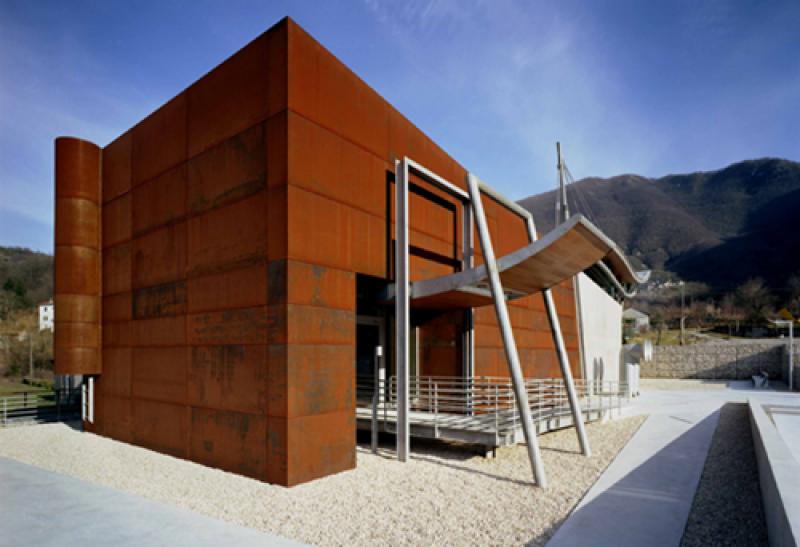 - Coperture: copertura inclinata rivestita in acciaio Corten; pensilina curvilinea in tubolari di acciaio rivestita in laminato di rame (TECU-Zinn)