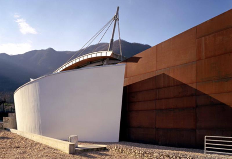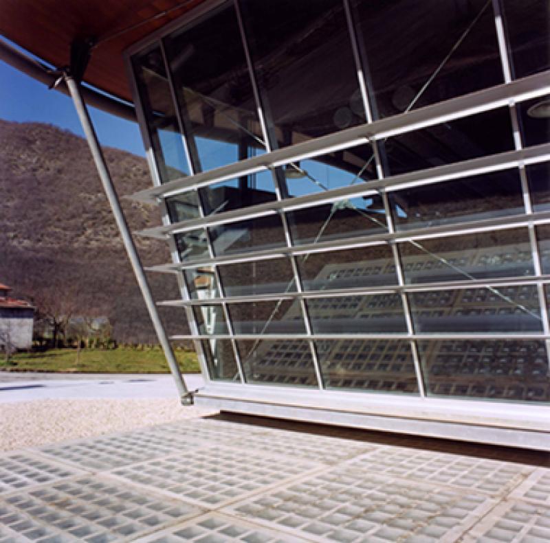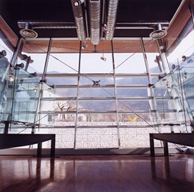 La preesistenza viene inglobata e trasformata in un volume rivestito in pannelli di acciaio corten; al volume, tagliato diagonalmente per imprimere dinamismo all’insieme, è accostato un secondo corpo in cemento a vista, concluso da una vetrata aperta sulla campagna e coperto da una pensilina curva in laminato di rame, sostenuta da due pennoni e da tiranti. La scala e l’ascensore di collegamento con il piano interrato di servizio sono contenuti in un volume curvo accostato a quello principale.