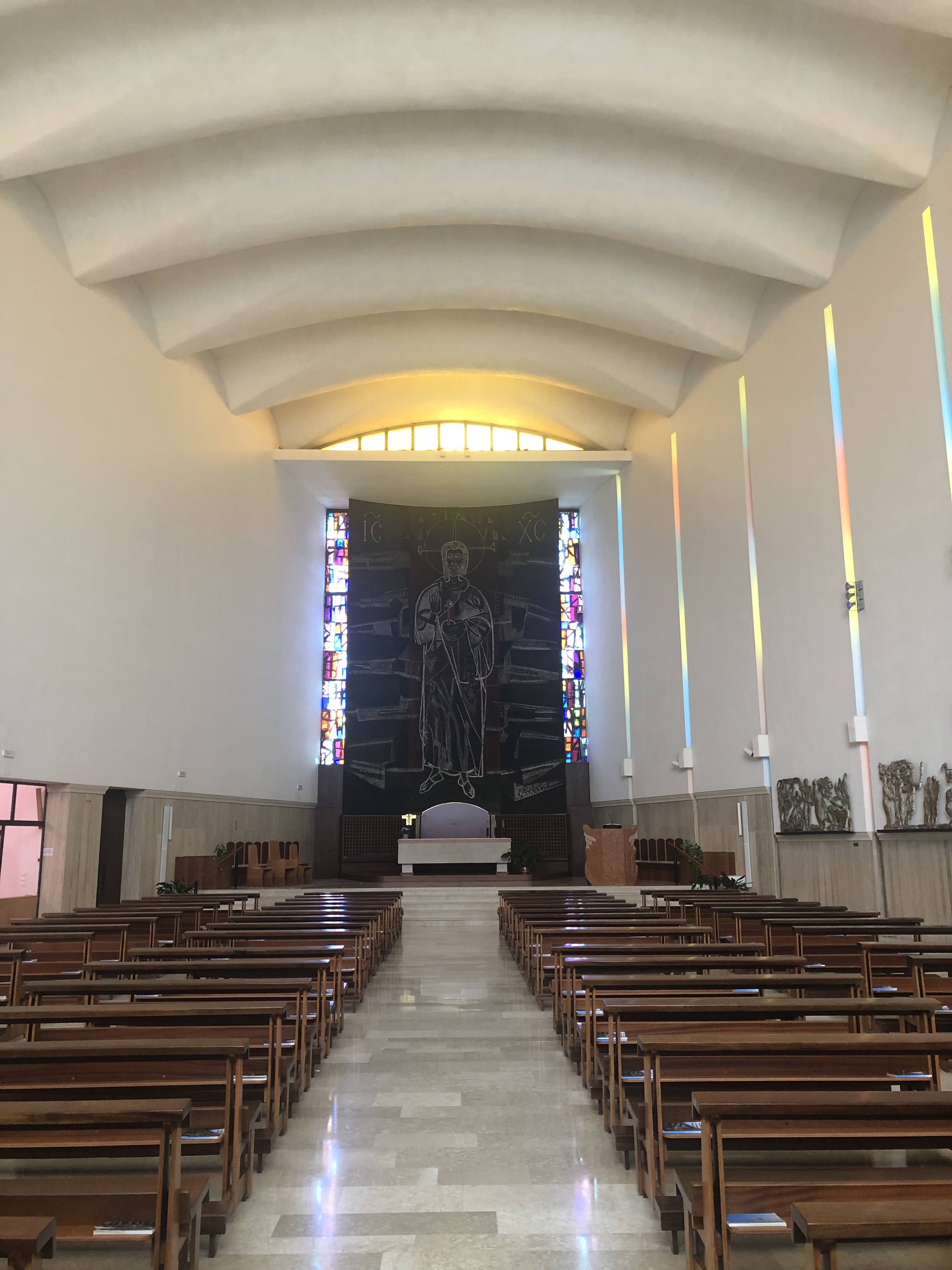 L'edificio di culto, libero su tre lati, si affaccia sull'omonimo ampio piazzale adibito a verde pubblico, mentre il fronte est è chiuso dal corpo di fabbrica destinato alla parrocchia. La facciata principale è caratterizzata dall'ampia vetrata di forma rettangolare, che ne occupa quasi l'intera luce tra due montanti, uno rivestito di conci di pietra calcarea mentre l'altro è lasciato a calcestruzzo faccia vista. La parte basamentale è rivestita di marmo travertino con al centro il portale d'ingresso decorato con formelle fuse in bronzo. Al rigore lineare del prospetto principale si contrappone l'andamento curvilineo delle facciate laterali. Il progetto di Marino Meo occhieggia all'architettura navale e sviluppa due fronti curvilinei che rimandano, in pianta alla forma della chiglia di una nave. In linea con la prima stesura l'esecuzione lascia da un lato la struttura in calcestruzzo armato a vista a sud, lungo via Santa Chiara, mentre a nord usa un rivestimento in conci di pietra calcarea bocciardati. Il rivestimento lapideo enfatizza con bordi in rilievo i tagli verticali che scandiscono il ritmo del prospetto nord, così come i giunti metallici segnano le medesime linee nel prospetto sud in calcestruzzo. Lo spazio interno a navata unica è sormontato da un soffitto voltato con un andamento ondulato, dato dalle costolonature in calcestruzzo armato. Il travertino del basamento della facciata è ripreso internamente e sul lato sud e riveste ugualmente le pareti del battistero, delle cappelle della Madonna e del Sacramento e della cappella feriale, con abside semicircolare. La parete nord è scandita da tagli verticali che lasciano entrare all'interno lame di luce filtrate da vetri policromi. La zona presbiteriale invece ha un soffitto piano ribassato ed è chiusa sul fondo da una vetrata che riprende i profili di quella del fronte d'ingresso, sebbene tamponata da un pannello decorato con l'immagine di Cristo Pantocrator. Sul lato a mezzogiorno si innalza la torre campanaria di 40 metri con un fronte curvilineo coronato da una teoria di tagli verticali digradanti dal centro verso i lati.