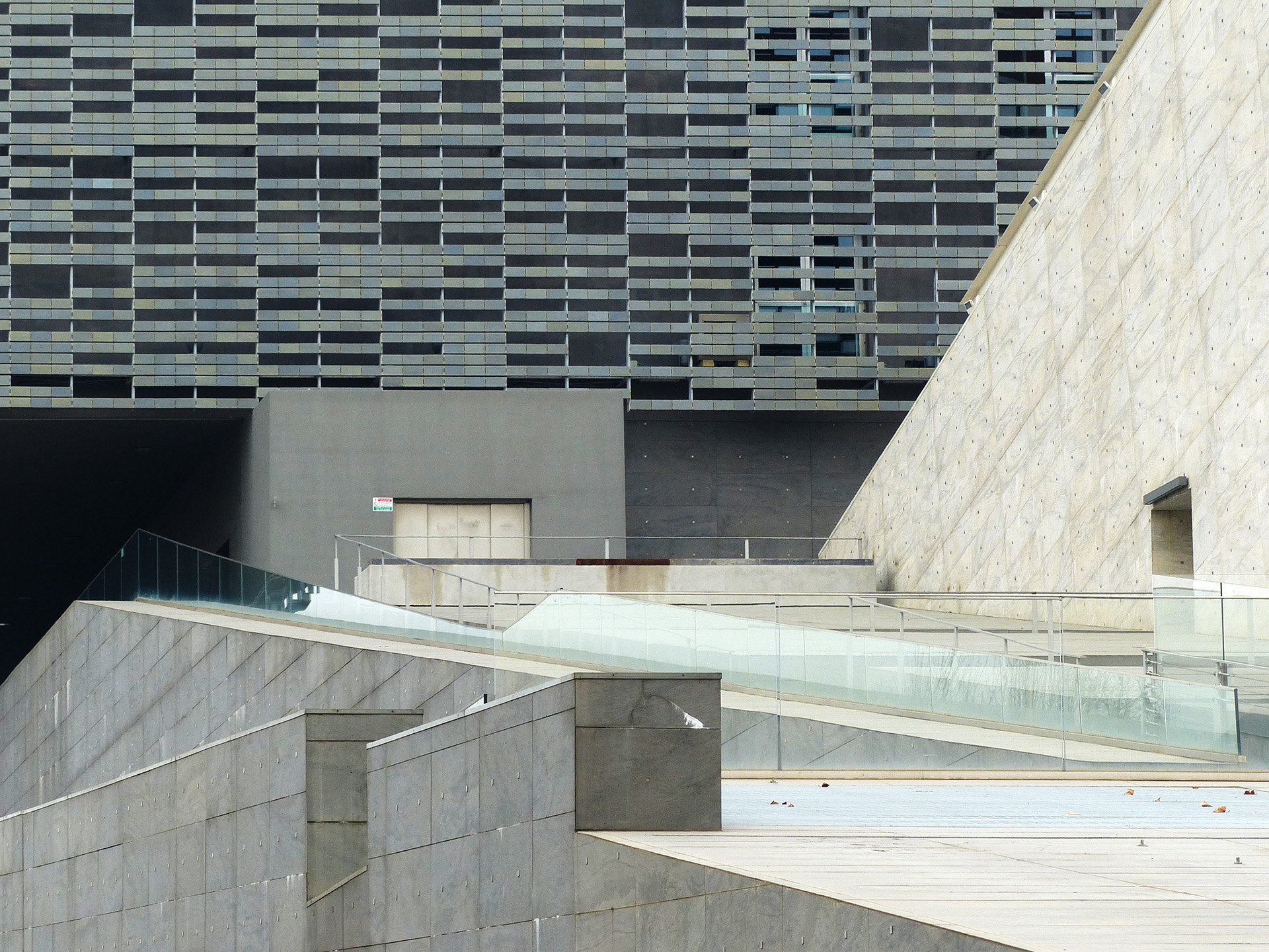 L’avveniristica architettura si compone di un basamento dal quale emerge il plastico volume inclinato che contiene le due sale da musica e il corpo della torre scenica. La grande sala lirica a pianta ellittica con capienza di 1800 posti ha pareti interne rivestite da una fitta rete metallica che ne ottimizza l’efficienza acustica e nel contempo conferisce all’ambiente un particolare effetto materico accentuato dalla tinteggiatura dorata delle superfici sottostanti. Una cavea esterna di oltre 2500 posti è ricavata sul piano inclinato di copertura. Il complesso teatrale sarà dotato inoltre di una sala sinfonica minore a pianta rettangolare di 1000 posti.