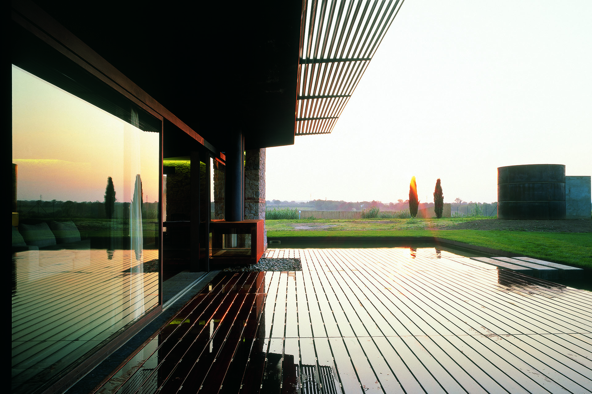 Il nuovo intervento consiste nella ristrutturazione integrale e la parziale ricostruzione di uno dei casali preesistenti, il "Podere 43", che su richiesta della committenza è stato adeguato a abitazione privata. La casa si compone di due nuclei, uno principale di maggiori dimensioni, ad uso dei proprietari, realizzato ripristinando il vecchio fienile e uno riservato agli ospiti ricavato in uno degli annessi agricoli. L’ampia vetrata continua del soggiorno, lo specchio d’acqua antistante e l’uso prevalente di legno e pietra contribuiscono a annullare il concetto di limite tra costruito e il paesaggio naturale circostante. Nell’insieme il complesso si caratterizza per l’essenzialità delle linee architettoniche e per la scelta dei materiali impiegati che conferiscono unitarietà tra preesistenze e nuovi volumi edificati.