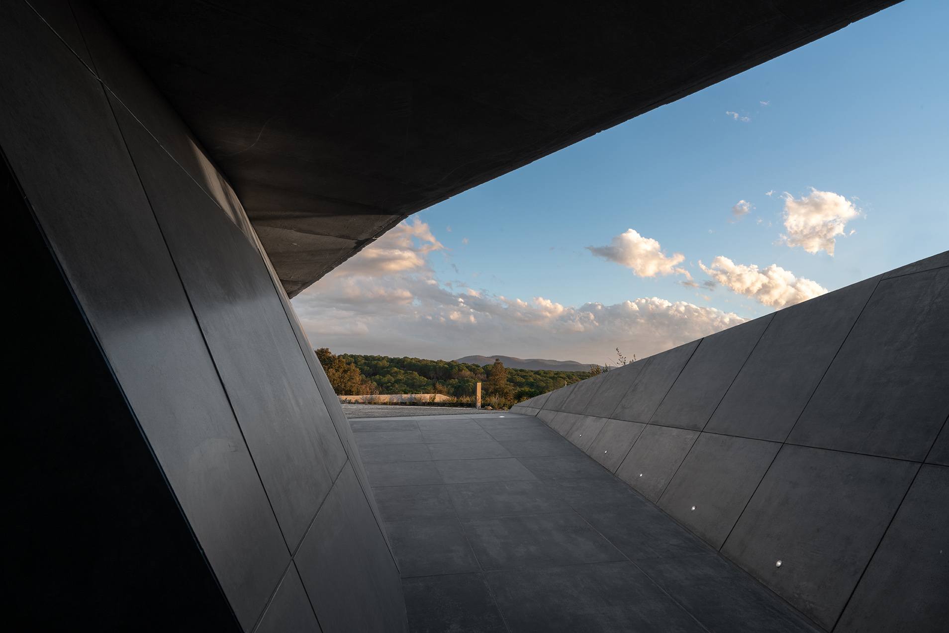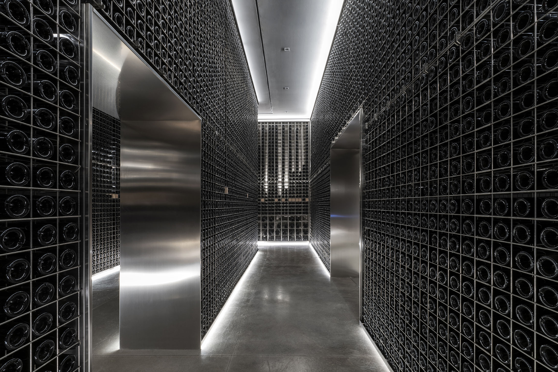 La Cantina di Masseto, progettata dallo studio Zitomori a seguito di un concorso europeo ad inviti promosso dalla famiglia Frescobaldi nel 2012, è situata nel territorio di Castagneto Carducci in località Ornellaia. Le motivazioni, che hanno guidato i progettisti nella scelta di un edificio ipogeo ricavato dallo scavo nella collina, derivano dall’esigenza funzionale di realizzare un impianto produttivo a gravità e dall’intento di mitigare l’impatto del costruito sul paesaggio circostante. I soli volumi fuori terra sono il corpo destinato alla ricezione del raccolto e la preesistente casa padronale recuperata preservandone l’aspetto originario. Una lieve pendenza introduce il fruitore all’interno della cantina che si sviluppa su due livelli interrati, collegati tra loro da una scala in cemento armato. Il primo livello ospita, celato da una parete in acciaio, un piano sospeso deputato alla fermentazione del vino in tini appositamente progettati. Al livello inferiore la sala degustazione è ricavata all’interno di un cubo vetrato posto all’estremità di una delle barricaie. Si susseguono altri ambienti che conducono al caveau, vero cuore della cantina, dove le bottiglie si conservano sospese tra le trame di una maglia di acciaio. Le fasi di sbancamento del terreno sono rievocate nel trattamento delle pareti interne in cemento a vista caratterizzate da scanalature irregolari e superfici rugose. Su una delle pareti, due squarci lasciano intravedere la naturale consistenza del terreno composto da strati della cosiddetta “argilla blu”, elemento peculiare del luogo che nella sua formazione a massi dà origine al nome della cantina.