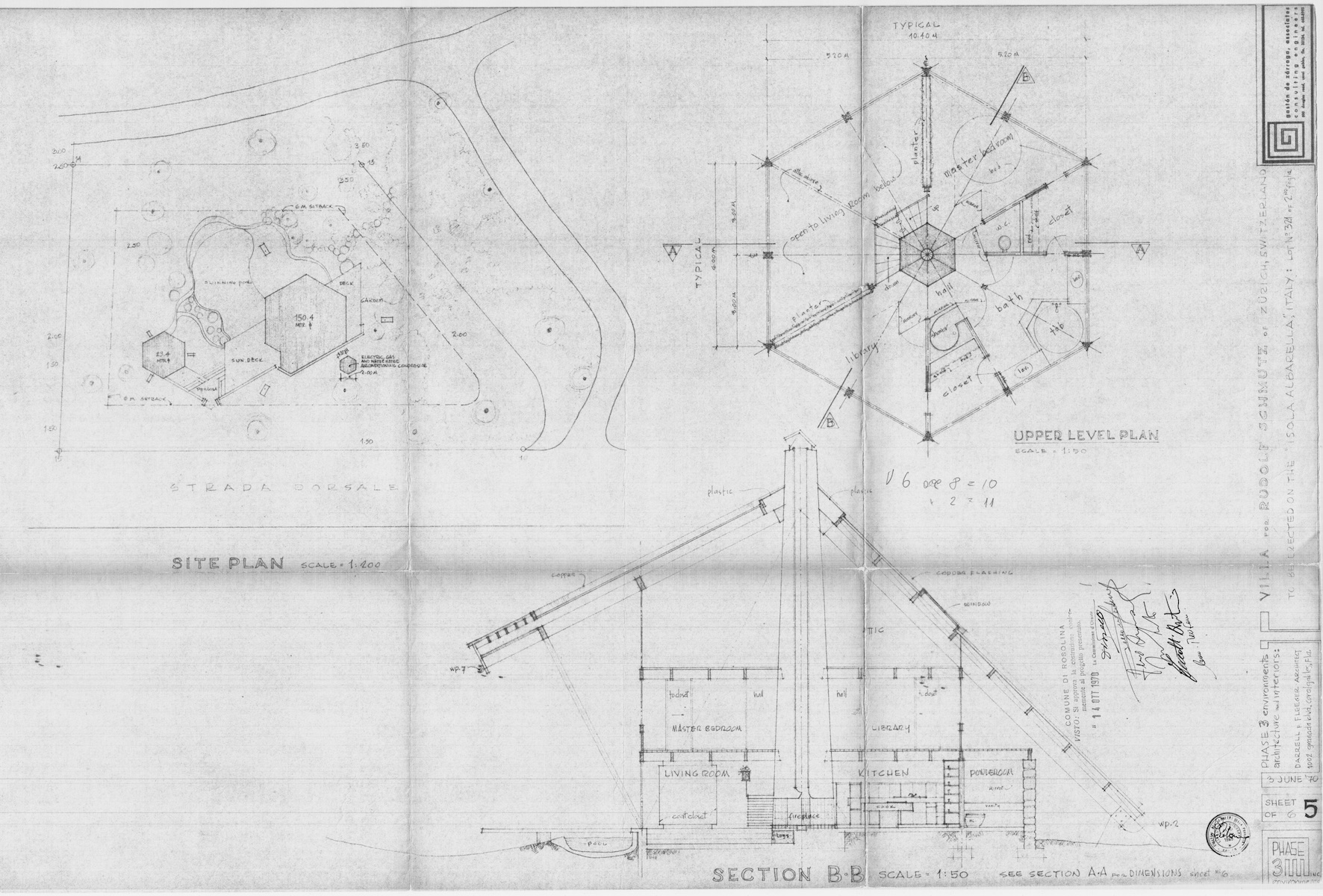 Il distributivo del piano terra vede comporsi in sequenza gli ambienti della zona giorno, organizzati rispetto agli spicchi dell'esagono in senso orario: l'ingresso, il salotto, il foyer aperto verso il solarium sulla piscina, la sala da pranzo e infine la cucina con gli ambienti di servizio, a sua volta comunicante con l'ingresso. Il secondo livello, raccordato dalla scala centrale con un doppio attacco dall'ingresso e dal foyer verso la piscina, si articola rispetto alla stessa logica, disponendo il salotto privato mansardato, la biblioteca aperta verso la terrazza coperta, la camera da letto padronale, divise dove necessario da setti murari dal guardaroba e dalla camera da bagno articolata in ambiti secondo i diversi usi. Infine il terzo livello attico raccordato dal medesimo sistema di scale si affaccia sull'ambiente del salotto privato al piano sottostante.
