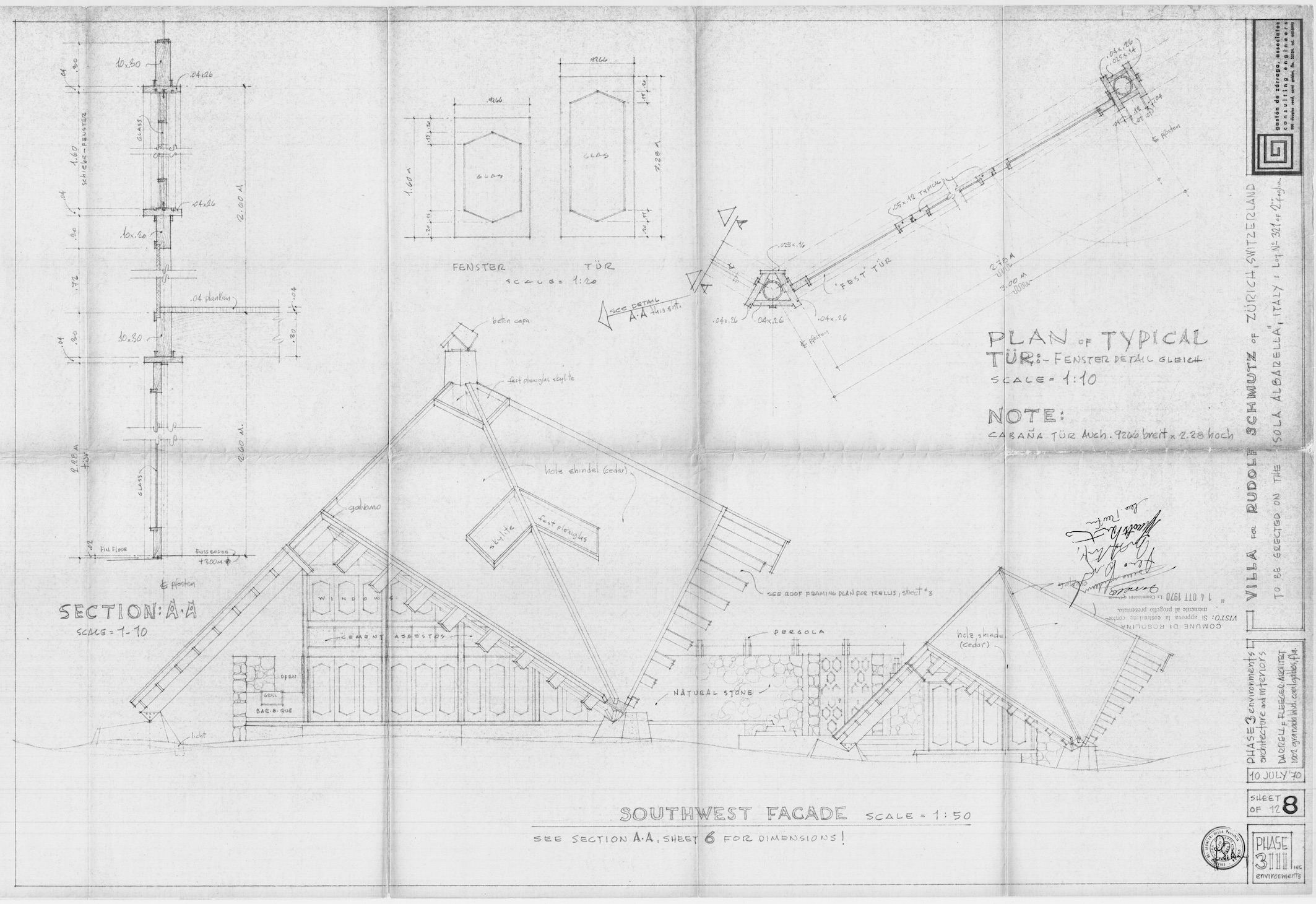 Un muro perimetrale in conci di pietra raccorda i due blocchi a est verso la strada, funge da schermo per i residenti e segna il varco di accesso. Diversamente il fronte interno a ovest si apre verso il giardino e la piscina con pareti vetrate realizzate con infissi in legno che riproducono la cifra compositiva dell'esagono.