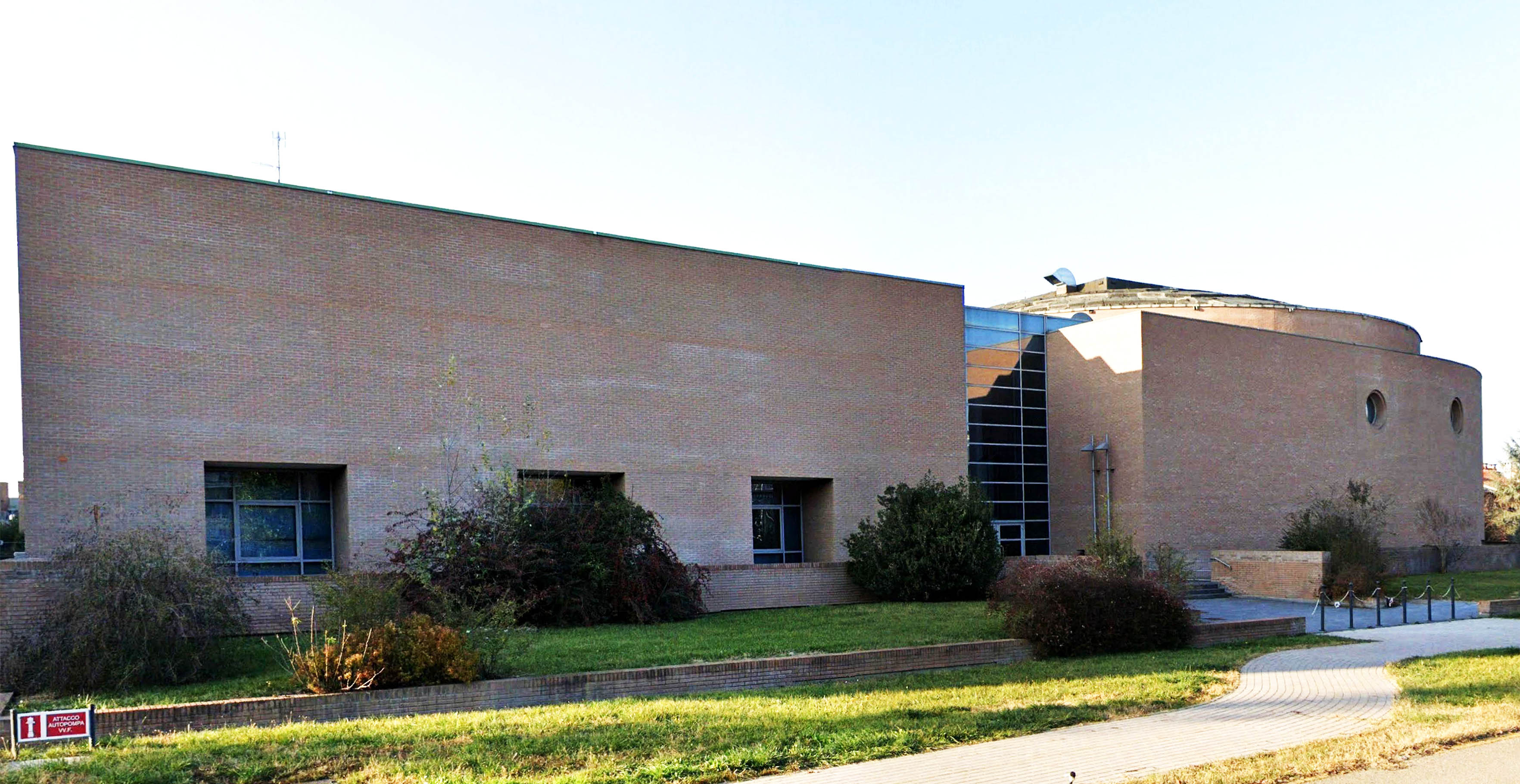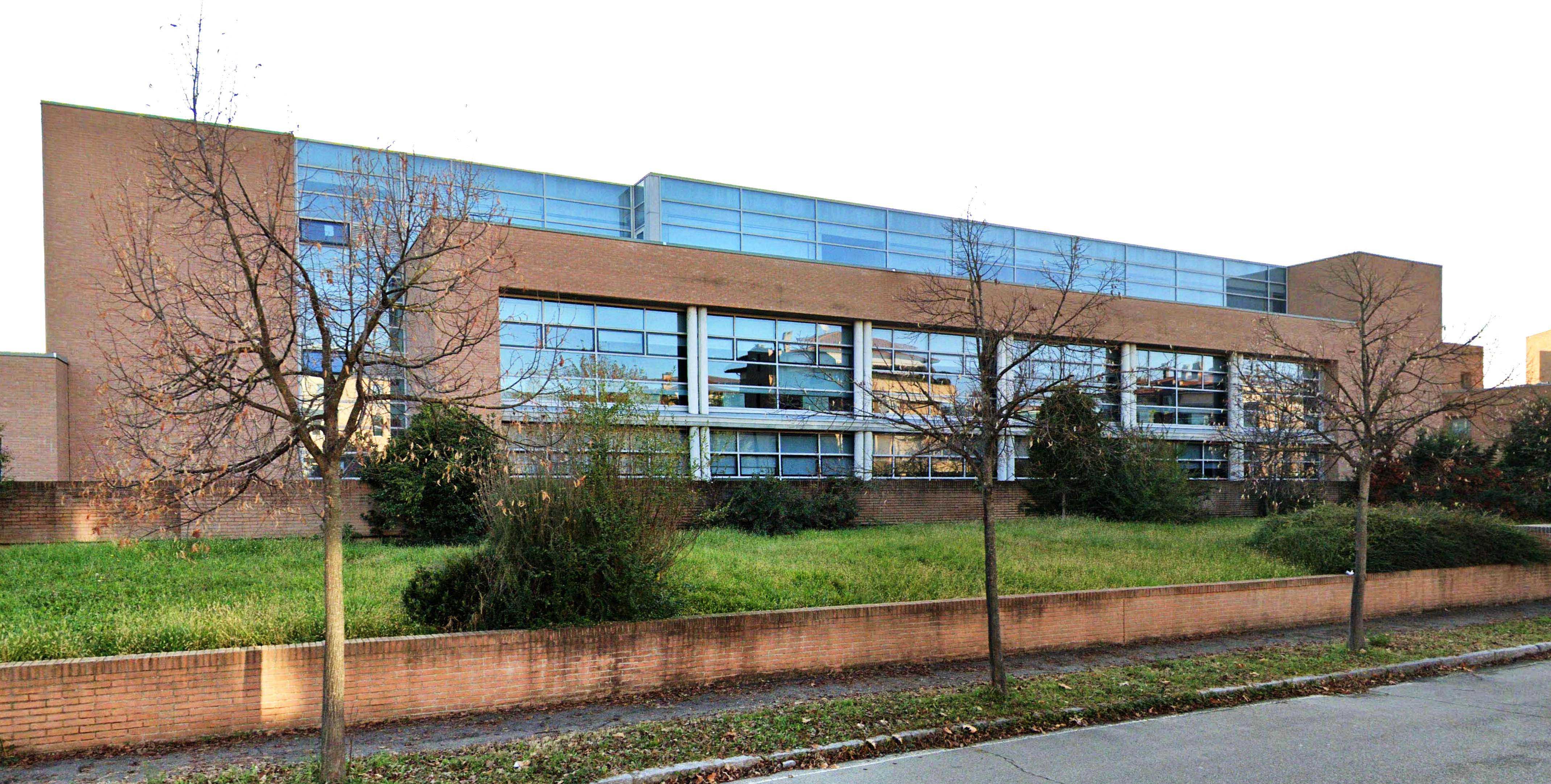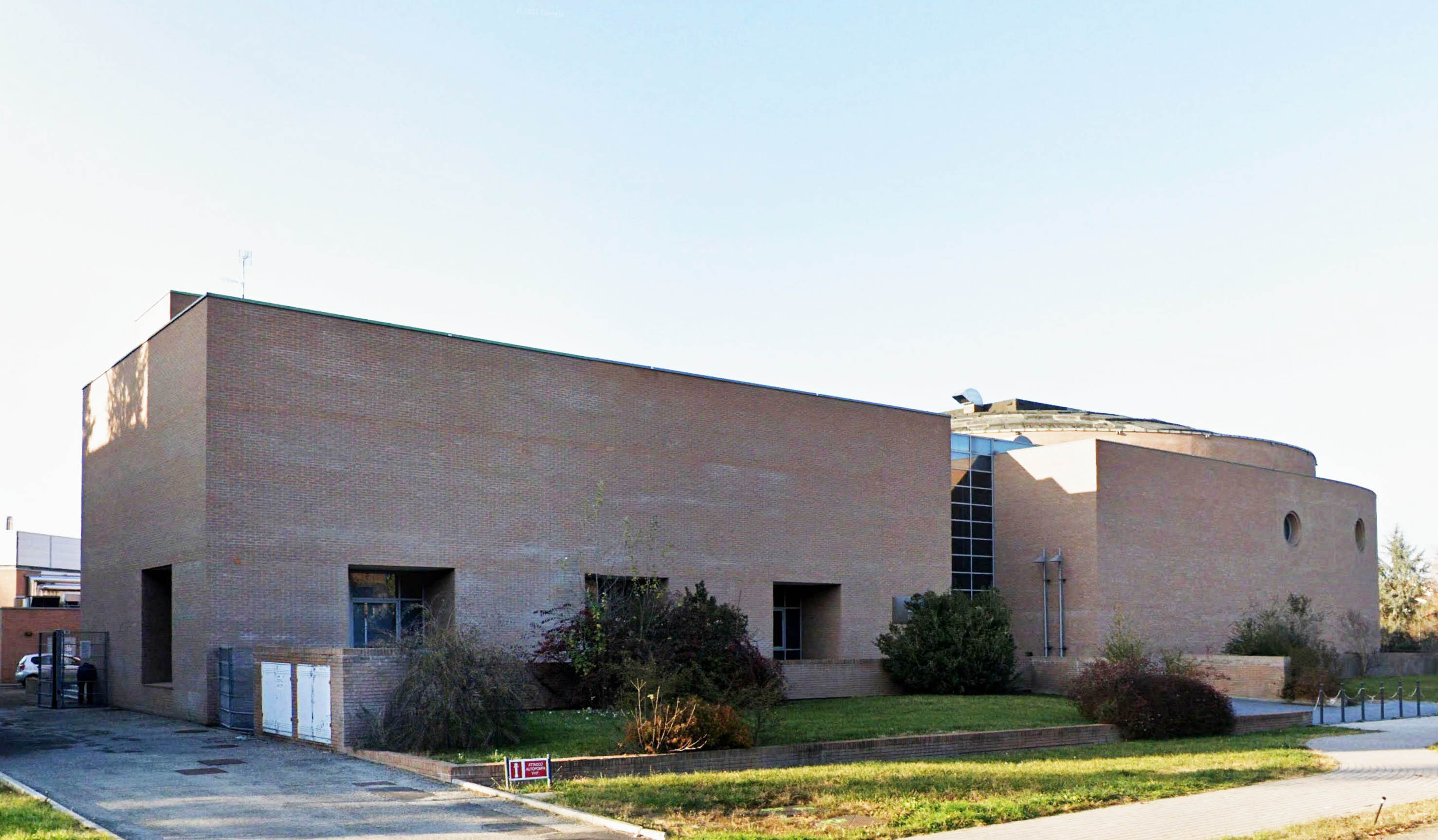 Inoltre, all’esterno il volume di quest’ultimo si carica maggiormente di valenze rappresentative, anche in considerazione della sua collocazione, in angolo fra viale Galilei e via Aristotele. Attraverso il tema dell’angolo, infatti, i progettisti sottolineano l’aspetto propulsore di tale elemento che, contrariamente al resto del complesso, mostra un’architettura massiva, in cui è predominante il mattone faccia a vista. Si configura così un volume a pianta circolare, la cui parete curva nel lato visibile da strada, nonostante sia aperta da grandi “oculi”, è sostanzialmente cieca.