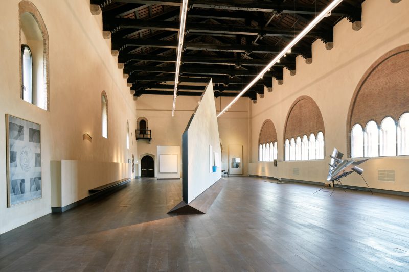 Le scelte museografiche hanno cercato di evitare la rigidità della “scatola nella scatola”, favorendo la reversibilità, la percezione dell’architettura e una libera collocazione delle opere, per far sì che siano in dialogo soprattutto con lo spazio, più che tra loro. Un allestimento, che pur attraversato da un filo conduttore, si declina di volta in volta assecondando le situazioni architettoniche nelle quali si colloca.