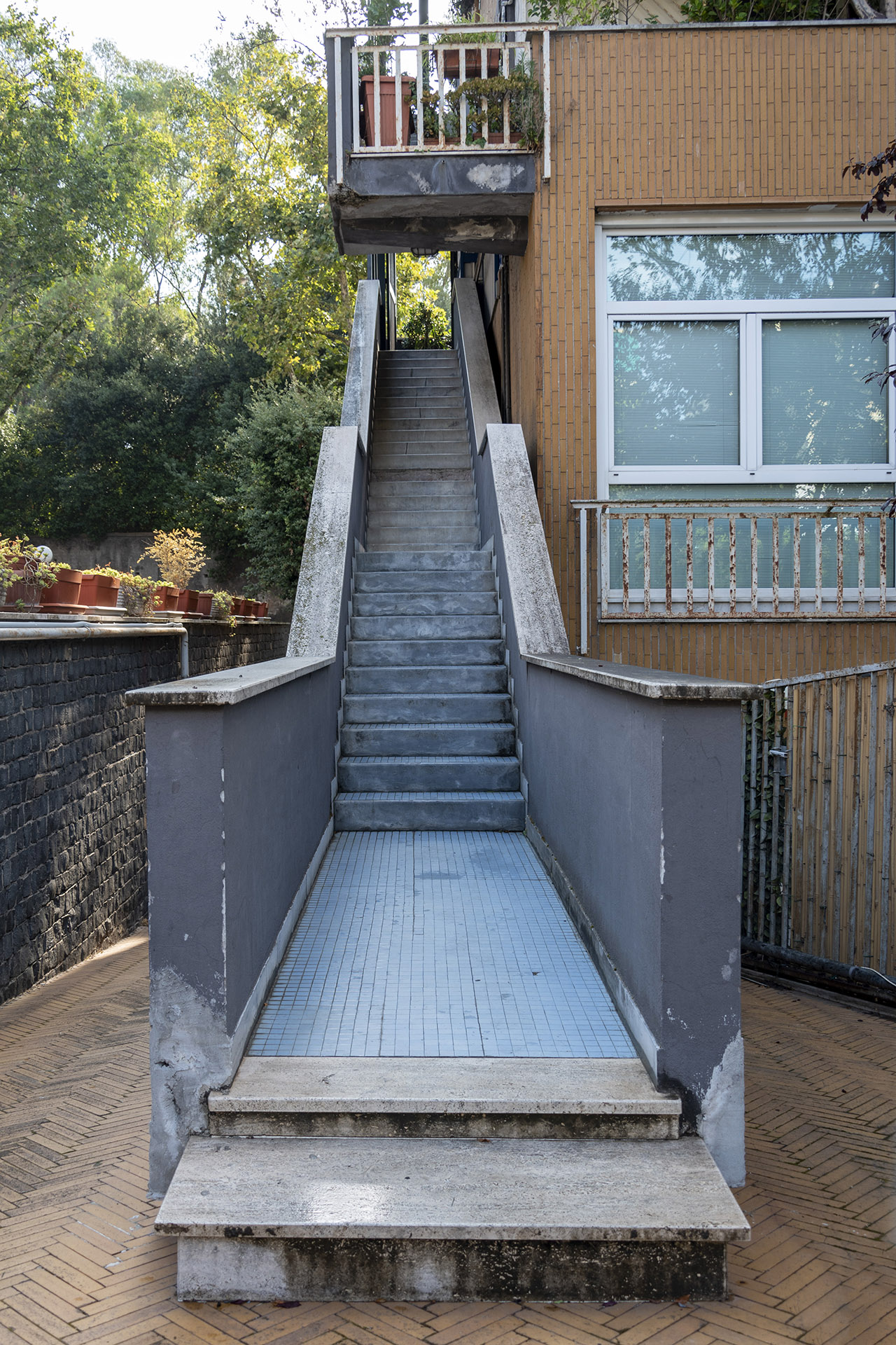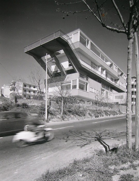 L'opera si trova ai bordi del costruito residenziale sul fianco sud-est della collina di Monte Mario. Le forme dell'isolato e l'andamento discendente del terreno determinano l'orientamento dell'edificio che si sviluppa longitudinalmente in direzione nord-sud, assecondando le curve di livello. Costruita per una committenza alto-borghese (la proprietà apparteneva a famiglie di magistrati), la palazzina è stata sin da principio concepita come un'architettura ben riconoscibile nel contesto urbano, caratterizzata da elementi fortemente connotativi e dall'impiego di materiali e finiture di lusso. L'opera, infatti, denominata "la nave" si distingue per il grande balcone aggettante impostato su travi inginocchiate che volge verso sud, con una vista panoramica su tutta la città. L'edificio si compone di sei livelli di cui uno completamente interrato adibito a cantine, servizi e autorimesse. Tutti gli altri piani ospitano cinque appartamenti duplex e tre simplex, dotati di doppi e tripli servizi e ampi ambienti di rappresentanza. Nella scelta dei materiali impiegati all’interno delle unità abitative prevale l’utilizzo di marmi e legni pregiati. Gli appartamenti al piano terra godono di giardini e parcheggi privati. La graduale parcellizzazione degli ampi appartamenti, avvenuta nel tempo a causa di successive suddivisioni di proprietà, ha comportato forti alterazioni tra cui la realizzazione di superfetazioni e la chiusura delle terrazze a verande, nonché la parziale occupazione del piano intermedio, un tempo destinato a terrazzo comune. Queste modificazioni hanno compromesso l’immagine dell’edificio e nascosto le eleganti ed armoniose linee del progetto originario.