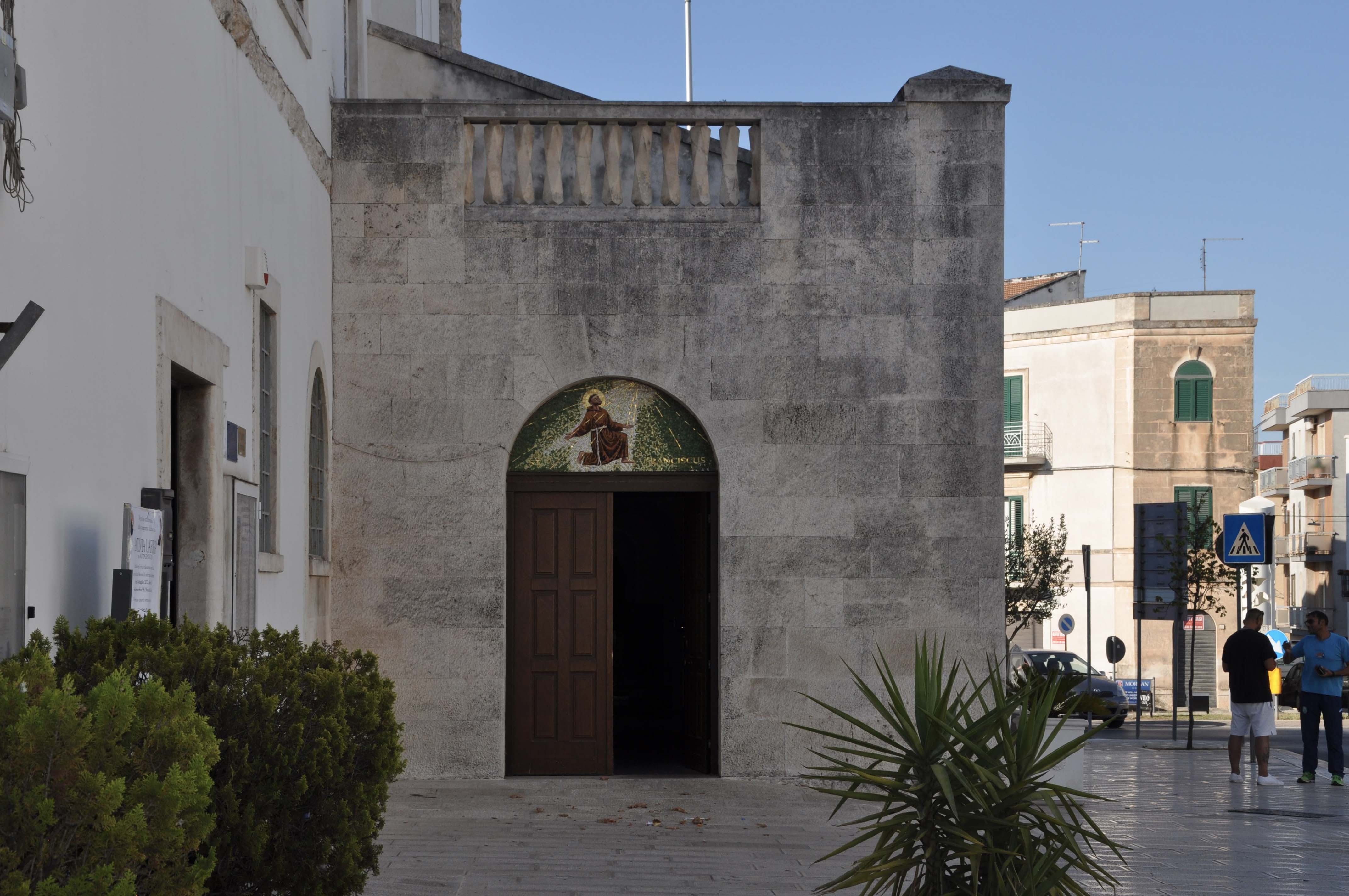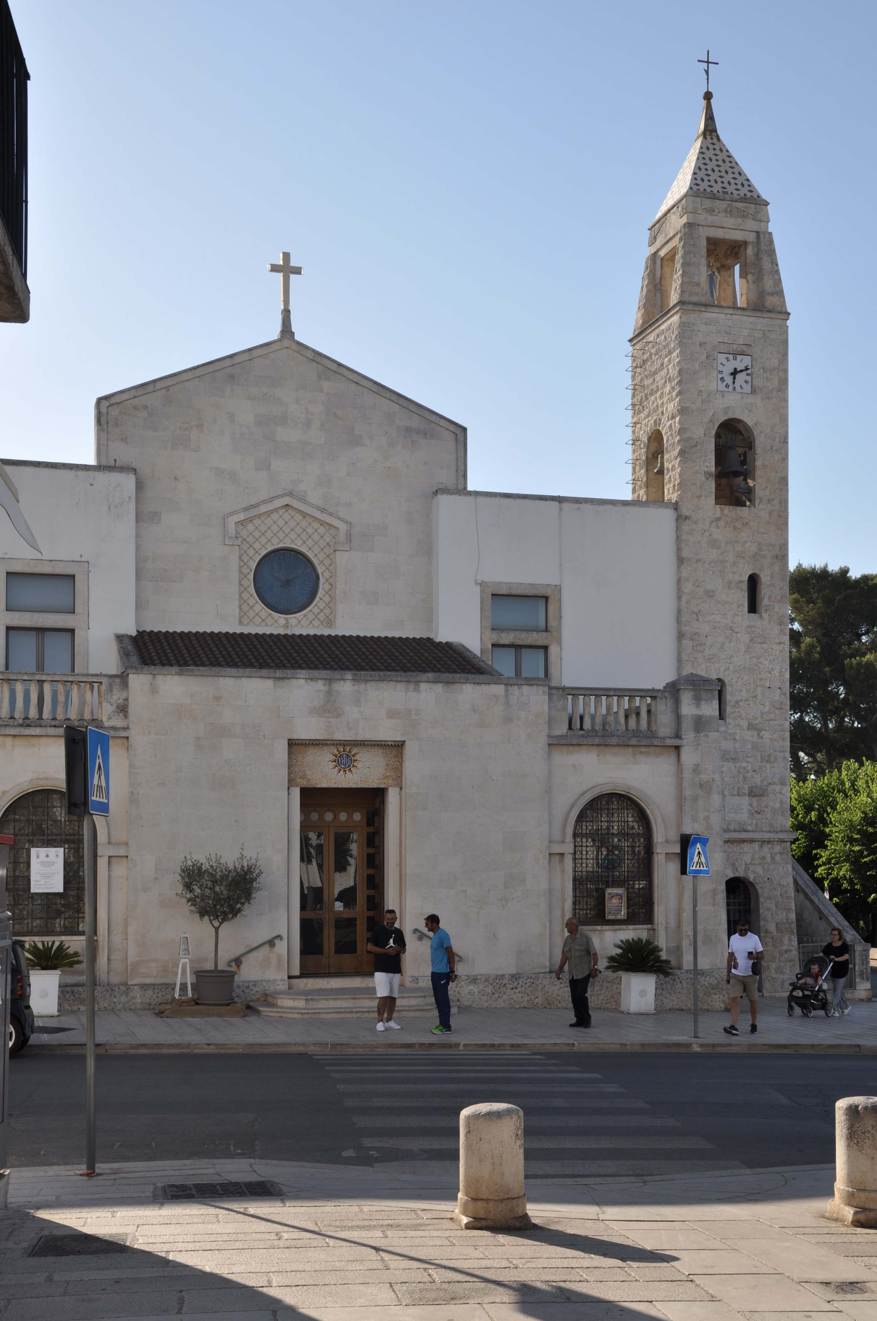 Nei primi anni cinquanta, il parroco don Anastasio Amatulli incarica l’arch. Pasquale Carbonara di intervenire sul preesistente convento cappuccino, costruendo dei nuovi e funzionali locali attigui alla chiesa dedicata al SS. Nome di Gesù dotandola così di elementi edilizi utili alle varie attività dell’erigenda parrocchia. Si tratta dei locali disposti su due piani che fiancheggiano la chiesa e si affacciano su via Tommaso Siciliani, dell'avancorpo che è costituito da un vestibolo addossato all'esterno della facciata principale e della torre campanaria. I corpi laterali sono a copertura piana e con struttura in muratura portante completamente intonacata. Nella facciata si aprono al primo livello finestre ad arco e nel secondo finestre incorniciate da eleganti elementi verticali e da architrave in pietra locale. Lo pseudo-nartece invece è tripartito. La porzione centrale, eretta in corrispondenza della facciata della preesistente chiesa, è completamente rivestita in blocchi di pietra e presenta una copertura a falda unica. Nella parte centrale ospita il portale di accesso principale. I due corpi laterali presentano, invece, una copertura piana praticabile con balconata. Hanno in facciata due finestre a tutto sesto e dei portali di accesso sul lato ortogonale alla facciata. Il campanile, posto sul lato destro della facciata, è rivestito con bugne rustiche e presenta una sequenza di piccole finestre a tutto sesto che seguono l'andamento delle scale interne. Nella parte superiore quattro aperture a tutto sesto incorniciano la campana e sono sormontate da un elemento terminale cuspidato. L'intero intervento dell'architetto Carbonara assume carattere di interesse sia rispetto la reinterpretazione e l'aggettivazione dello spazio liturgico, sia per la sensibilità di legare il linguaggio degli elementi moderni con le preesistenze.
