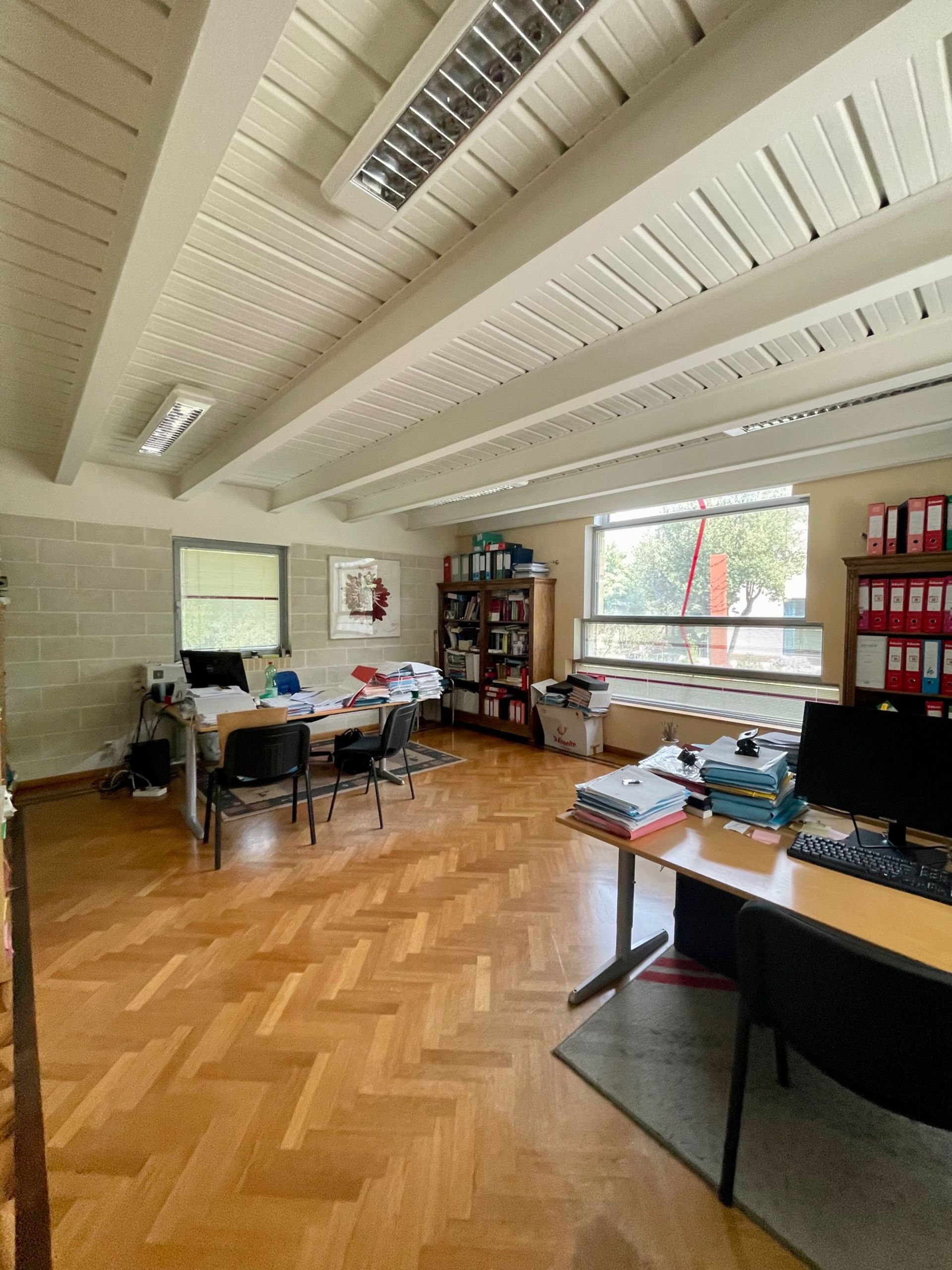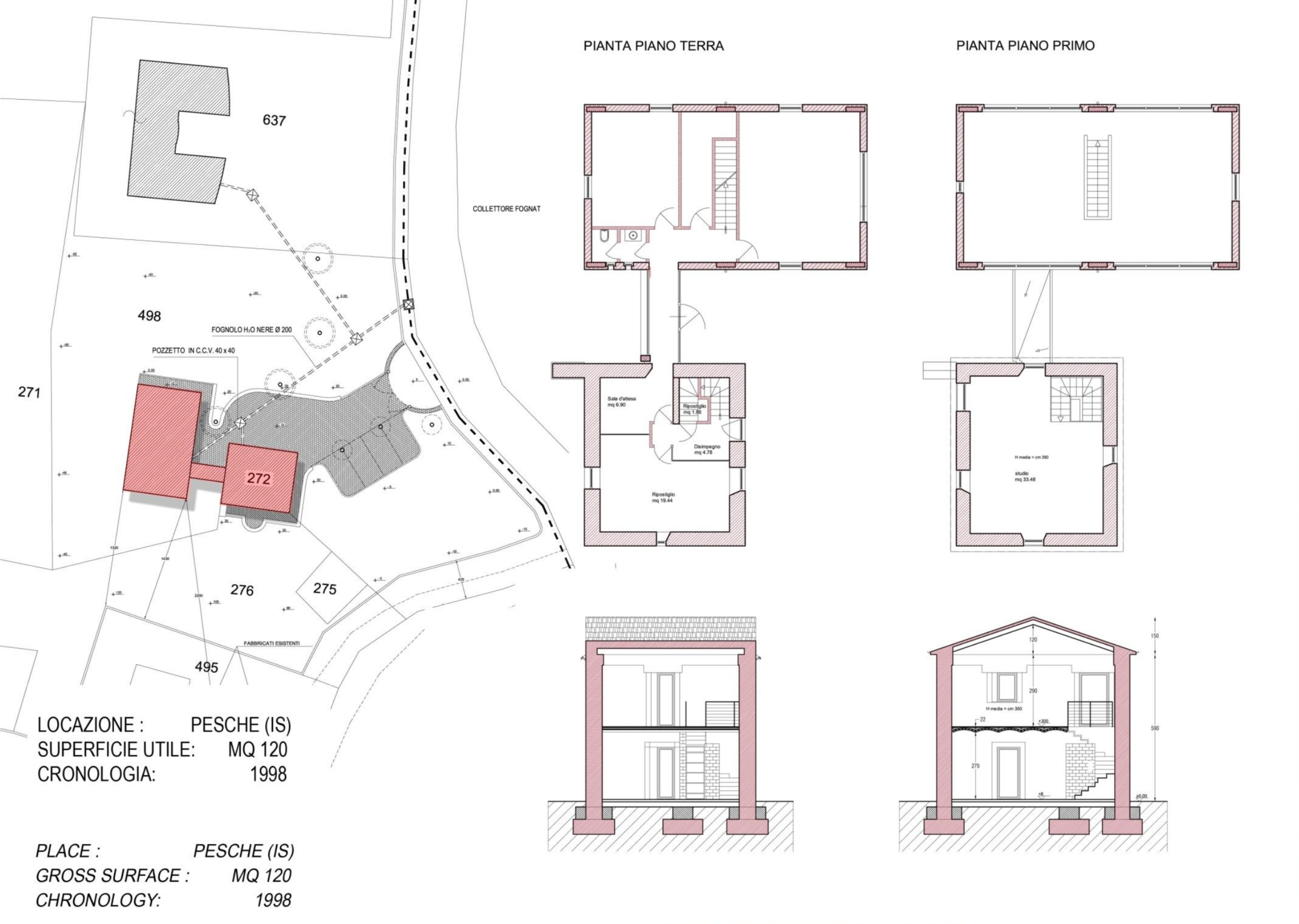 L'area su cui è posto il fabbricato è localizzata nella parte bassa del territorio comunale di Pesche (IS) nella zona a valle del centro abitato, dove nell’ultimo trentennio si è maggiormente sviluppata un'edificazione intensiva. L’edificio è ubicato ai margini di un insediamento produttivo di medie dimensioni ed a ridosso di un bosco di querce secolari, di particolare pregio. L’edificio, destinato a studio di progettazione, dista circa 20 m dall’abitazione dell’architetto, ed a pochi metri da un casolare in pietra, tipico delle case rurali degli anni ’40, completamente ristrutturato. La ristrutturazione del fabbricato esistente ha comportato alcune variazioni nella disposizione delle tramezzature, che hanno consentito un miglior inserimento delle funzioni previste. In tale contesto la scelta linguistica adottata, è volutamente di contrasto con l’architettura presente, con la finalità di creare due unità distinte nel pieno rispetto della tradizione, ma con uno sguardo rivolto verso un’architettura che raccoglie le istanze del nuovo millennio. Per cui è stato ipotizzato di realizzare un volume distaccato di ml. 4,00, che tenesse distinto il fabbricato esistente, il tutto unito da un percorso interamente vetrato. La scelta di distanziare i due corpi di fabbrica e di realizzare il collegamento vetrato è stata adottata anche per minimizzare l’impatto volumetrico complessivo, oltre che per generare di fatto uno cono visivo sul terreno retrostante ricco di vegetazione di particolare pregio. L’edificio di nuova realizzazione si presenta come un volume puro a pianta rettangolare di dimensioni in pianta pari a mt 7,00 x 12,00 e un’altezza di mt 5,36. Le due quinte murarie poste sui lati minori di testata di altezza poco superiore al colmo di copertura con tipologia a capanna, vanno a scandire il volume sui due prospetti minori, oltre a mascherare le pendenze del tetto. Il particolare taglio della vetrata va ad incorniciare la visione sul centro storico di Pesche (IS), all’interno una traccia di colore rosso segna la parte vetrata, così da sottolineare l’asse di simmetria e la verticalità della bucatura piramidale. La struttura in c.a. ha solai in acciaio e lamiera grecata a vista per il piano 1°, mentre il tetto a capanna è composto da travi in legno e pianali in legno, con tiranti in acciaio a vista, il tutto di colore bianco. Le pareti esterne in tavolato in c.c.v. 50x12x20, di colore giallo ocra, è scandito con ritmi variabili, da ricorsi in mattoni di laterizio pieno. Sotto l’aspetto distributivo, al piano terra troviamo un disimpegno che apre su un vano adibito a servizi igienici ed antibagno, e uno studio con sala riunioni, mentre al piano primo troviamo un unico vano che rappresenta la parte operativa. D’interesse è la configurazione della scala bicolore in marmi di carrara e serizzo, ricavata tra due quinte murarie e di ridotta larghezza, che nel percorrerla genera all’arrivo al P1° una sensazione di sorpresa, dato il contrasto con l’ampiezza e la luminosità della sala di lavoro.
