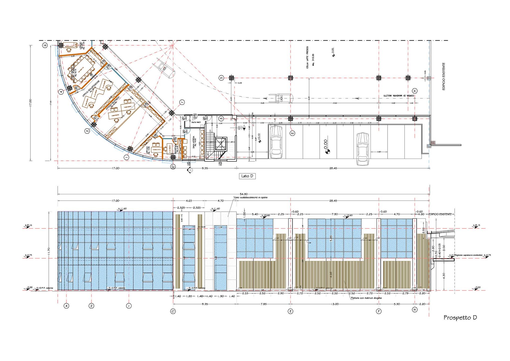 L’opificio industriale si inserisce all’interno di un contesto già ampiamente edificato, nel nucleo industriale del Comune di Termoli. L’area era stata nel passato già oggetto di edificazione infatti il preesistente edificio fu sede dapprima del pastificio Fusco e in seguito sede di Baiardo. Il sito si presenta dal punto di vista altimetrico del tutto pianeggiante, confinante sui lati lunghi con l’area sede dell’azienda Del Giudice e sul lato opposto con un’area a parcheggio, mentre sui lati corti risulta delimitata dalla strada consortile e dalla SS 87. La riflessione iniziale del progettista ha consentito di analizzare due possibili ipotesi d’intervento: la prima soluzione prevedeva un collegamento tra la nuova struttura all’esistente; mentre la seconda soluzione prevedeva una struttura “satellite” ossia organismo separato, ma venne subito scartata in quanto non pienamente rispondente alle necessità del ciclo produttivo, per cui la scelta fu sulla soluzione che connetteva fisicamente il nuovo intervento con all’azienda esistente. La soluzione progettuale prevede un collegamento ad “elle” all’altezza del lato anteriore dove si trovava un locale magazzino, poi demolito per far posto alla prima parte della nuova struttura attraverso una galleria di collegamento per il transito i mezzi di trasposto. Nel raccordo tra questa primo spazio e l’edificio che corre parallelo alla vecchia costruzione vi è posto una cerniera semicircolare su due livelli, all’interno della quale vi si sono inseriti gli spazi rappresentanza, sala attesa, ufficio spedizioni, sala riunione. Uno spazio filtro corre lungo tutto il perimetro dei locali indicati ad evitare in tal modo interferenze tra fasi di lavorazione e personale amministrativo.