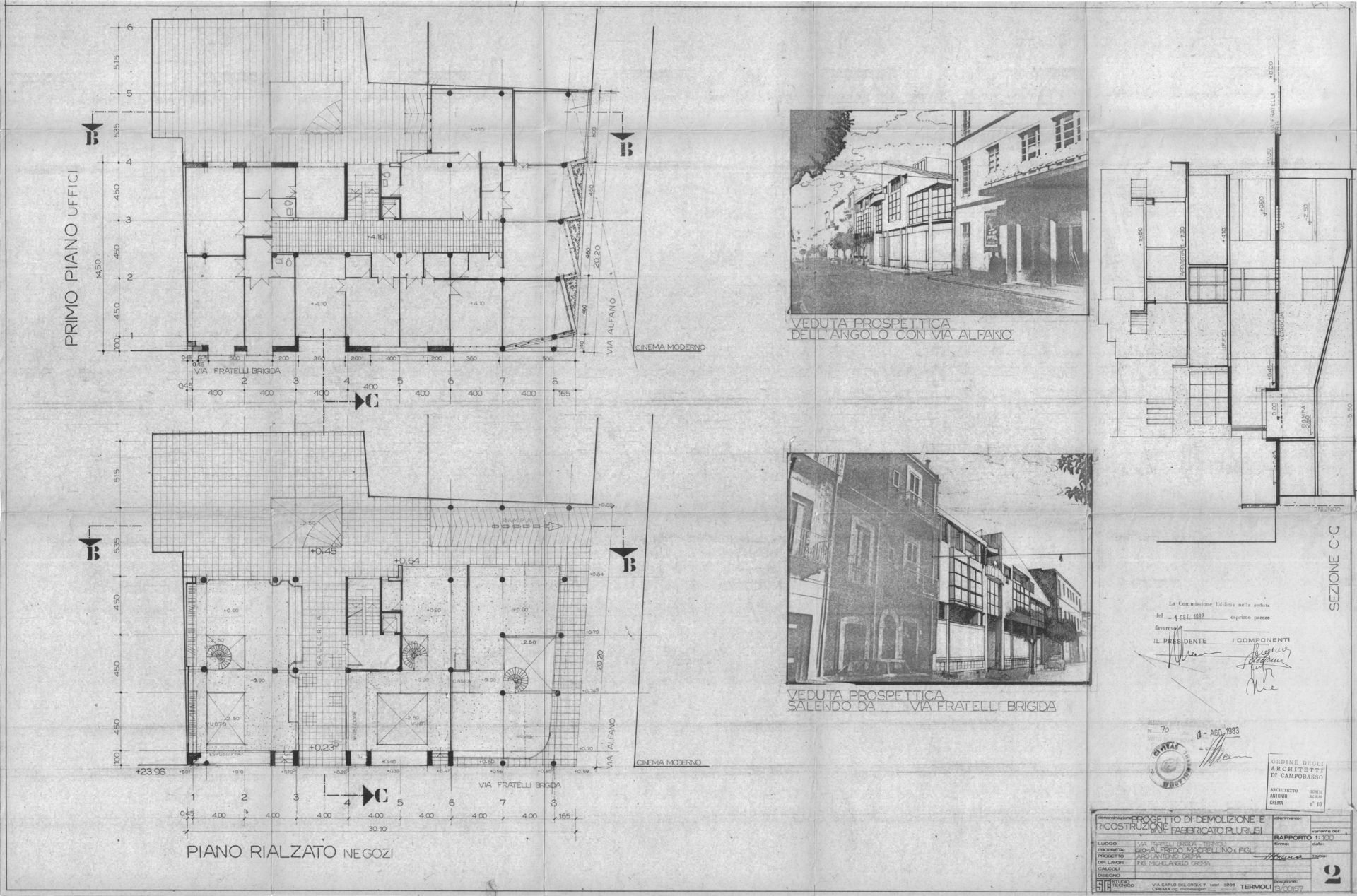 Il progetto del 1982 colloca l’intervento nella categoria della “demolizione e ricostruzione” per un complesso di stabili edificati in periodo diversi e notevolmente dissestati, ricadenti nella parte di fine ‘800 inizio ‘900 nel centro di Termoli. L’autore pur attuando una radicale ridefinizione tipologica, ha inteso conservare la destinazione dell’immobile originario, infatti risultavano insediati organismi adibiti: al piano terreno, ad attività di smercio e di produzione; al piano superiore, ad unità abitative e di rappresentanza commerciale, legate alla predetta attività primaria.