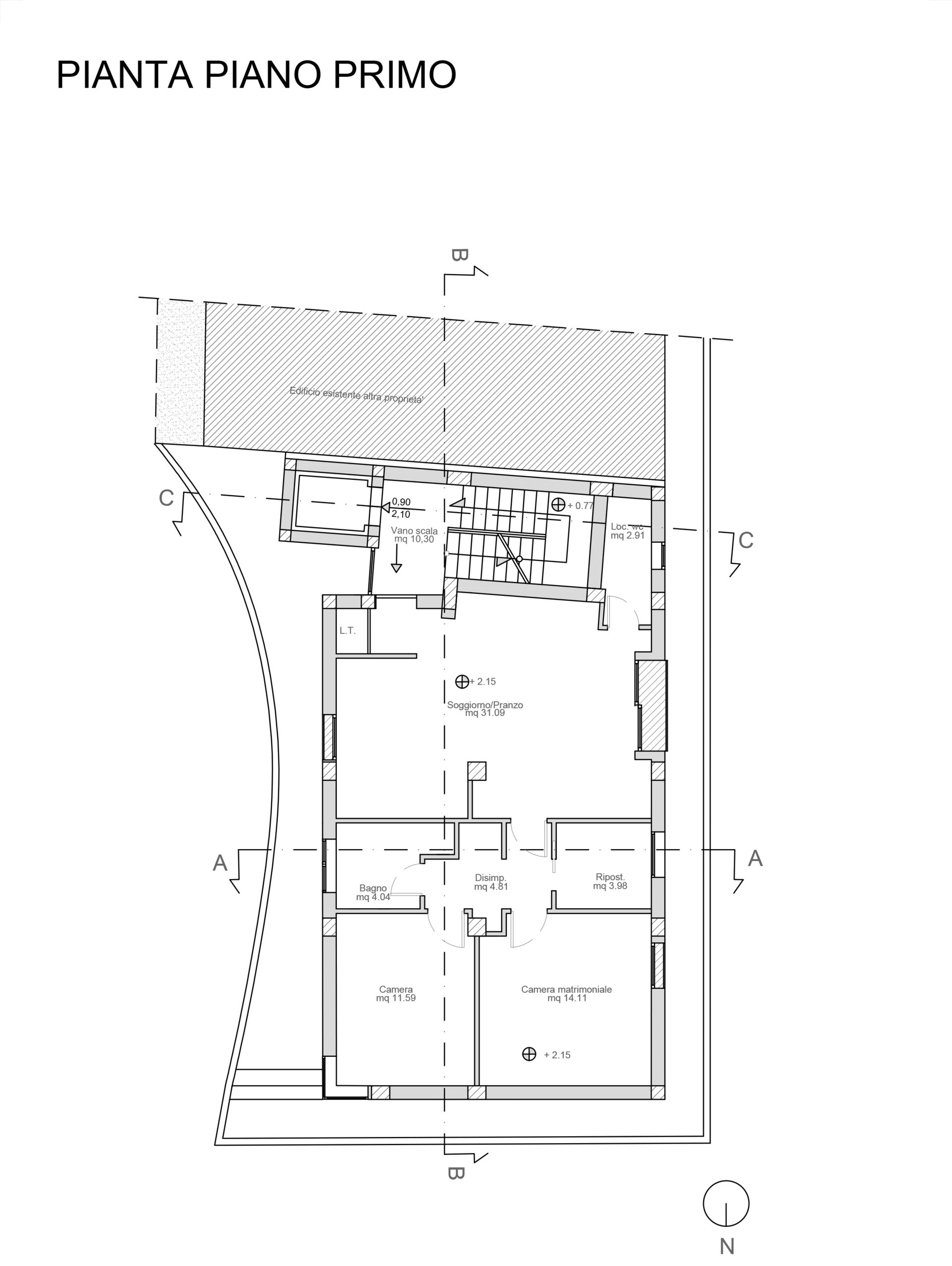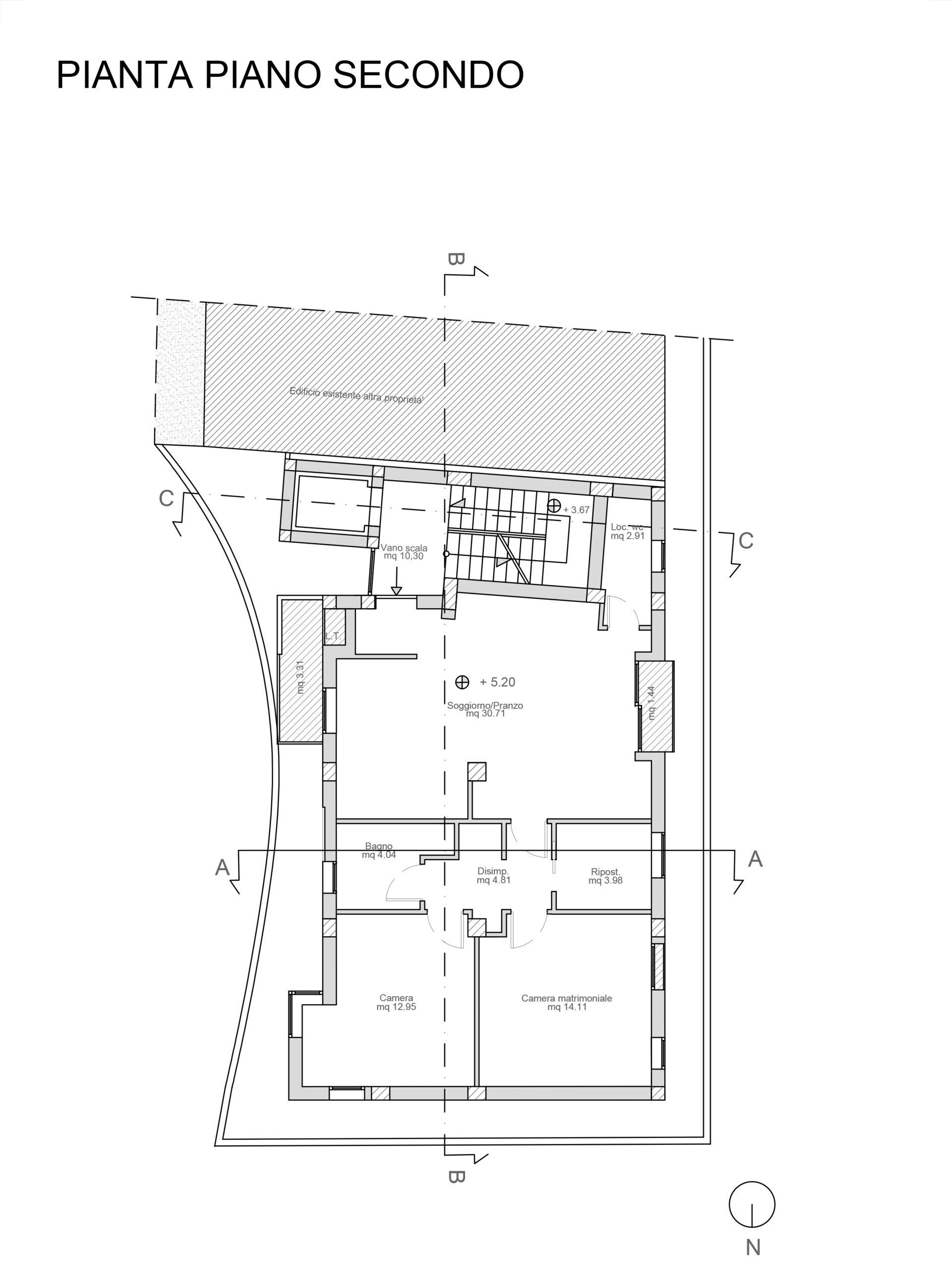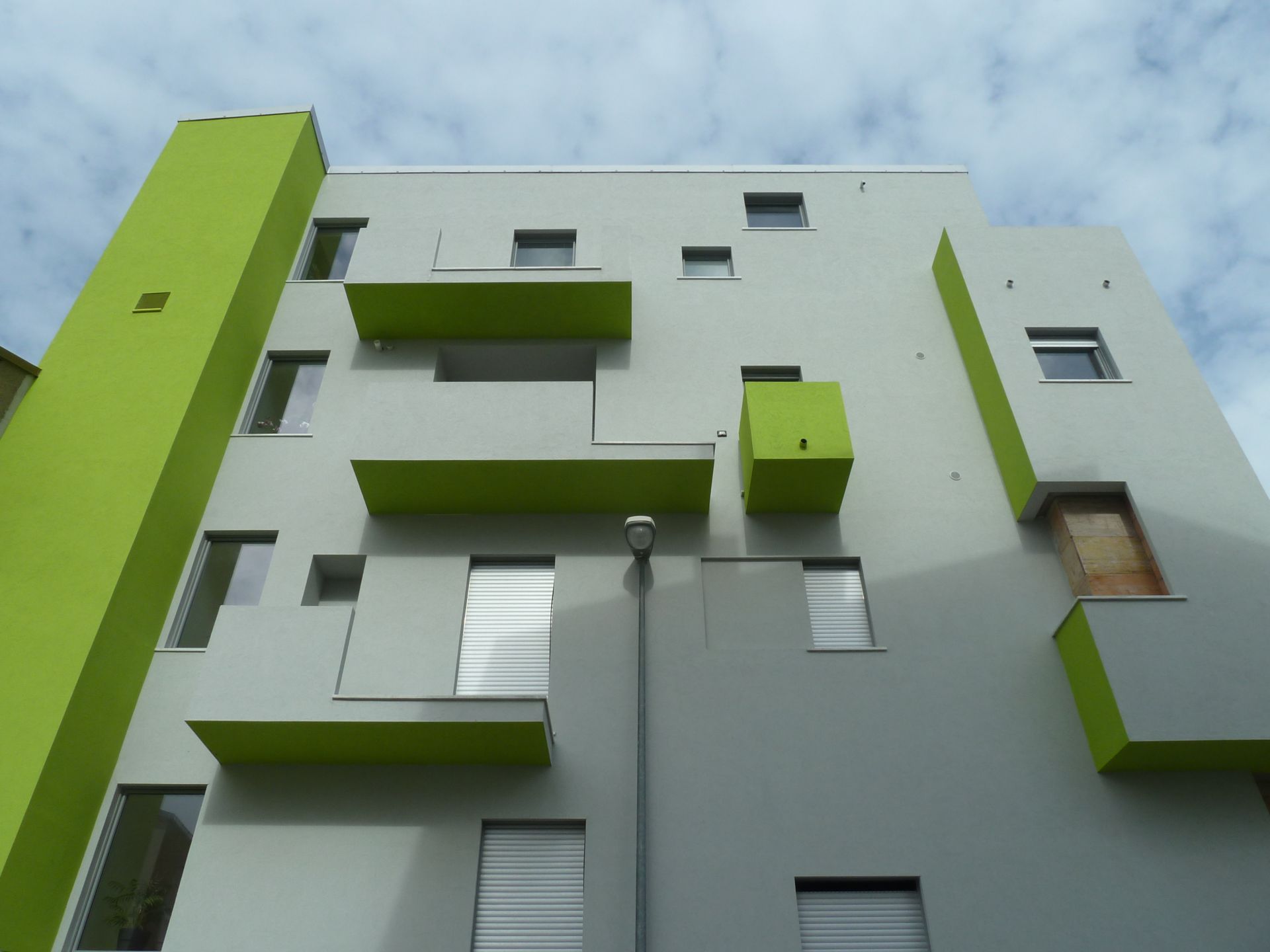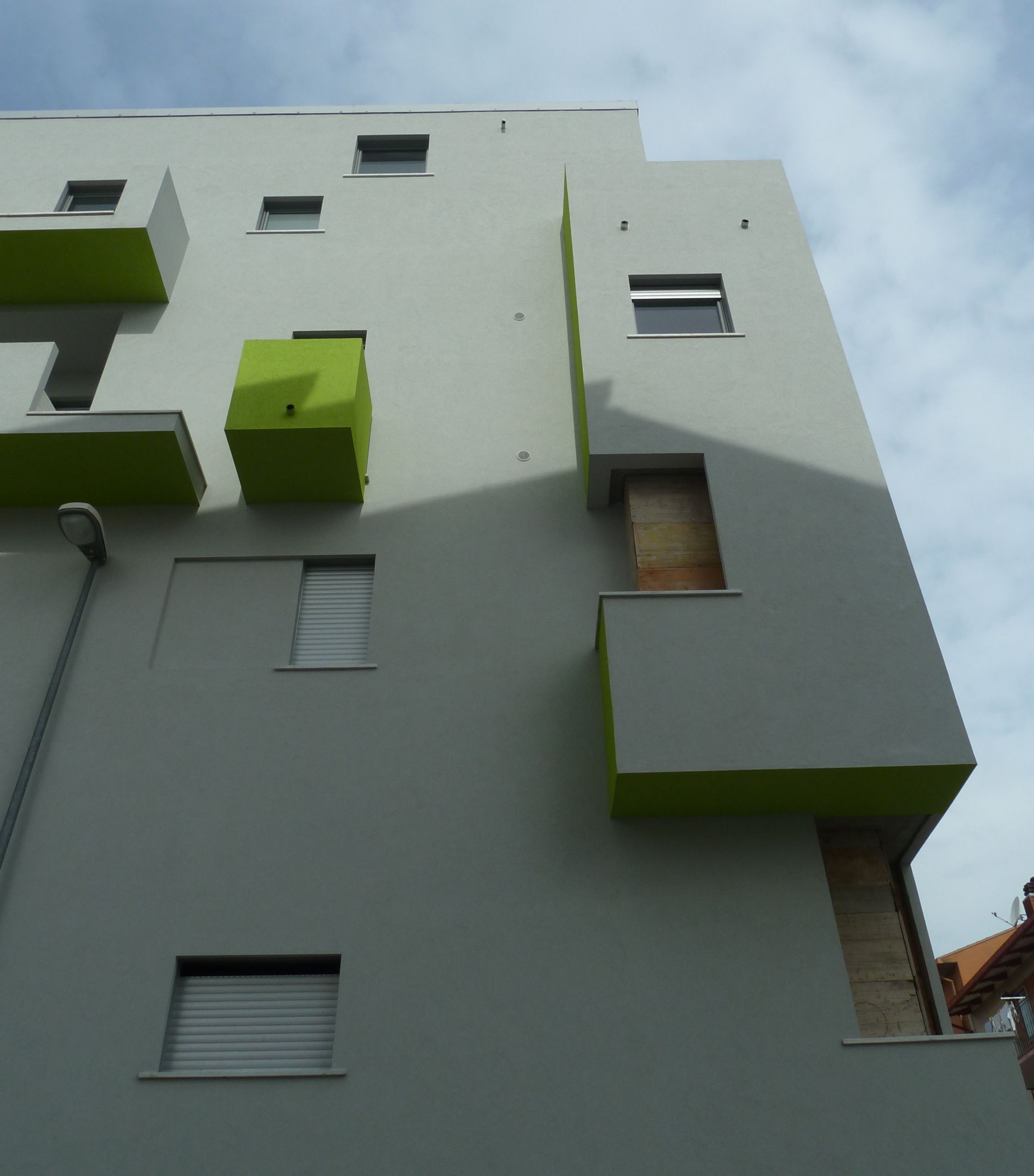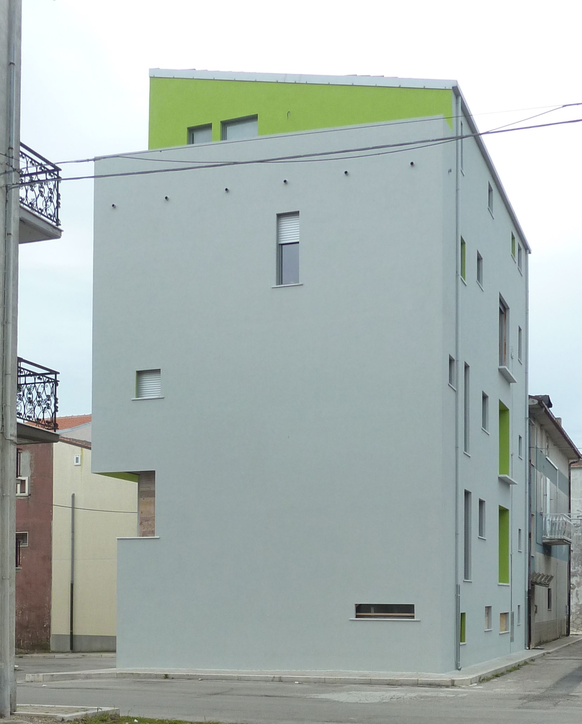 L’edificio in questione è collocato nel comune di Santa Croce Di Magliano (CB) precisamente in Via Germania, è stato realizzato intorno al 2011 su un progetto del 2009 degli architetti Filomena De Maioribus e Roberta Di Benigno, ponendosi in netto contrasto con gli schemi architettonici locali consolidati, rompendo quella staticità e regolarità delle facciate dei fabbricati adiacenti caratterizzati da un cornicione aggettante. Dal punto di vista architettonico è un piccolo edificio residenziale a basso costo realizzato in un piccolo lotto di forma molto strana, con distacchi dai fabbricati di soli 10 mt così come previsto nello strumento urbanistico vigente. Il fabbricato, per sfruttare la volumetria prescritta, insegue il perimetro del lotto, disegnando a tratti un rettangolo non perfetto presenta una struttura regolare in cemento armato travi e pilastri, i solai sono in laterocemento, il tetto è ad una falda e le tamponature sono in laterizio rivestite da un cappotto isolante rifinito ad intonaco colorato con gli infissi in pvc rinforzato da un’anima di fibra di vetro. Dal punto di vista stilistico I blocchi che costituiscono il fabbricato identificano il corpo ascensore tutto colorato di verde con gli alloggi residenziali ed un terzo blocco che sembra voler avvolgere il fabbricato, colorati invece a contrasto con un colore neutro; la stessa scansione dei volumi è caratterizzata dalla compattezza delle pareti rivestite da intonaco. L’edificio si compone di un piano terra adibito a garage e quattro piani adibiti a residenza, di cui il piano terzo e quarto collegati internamente.