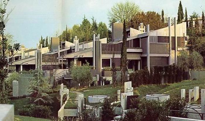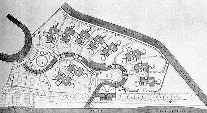 L’insediamento è organizzato in modo da introiettare nelle case non solo queste pregiate visioni del paesaggio, ma da creare una nuova unità di ambiente attraverso precise scelte: quella di disporre le case su due linee curve concentriche e periferiche al lotto; quella di definire un’architettura in grado di adattarsi e di esaltare il dislivello che caratterizza l’area; l’aver utilizzato il fondovalle per la giacitura della strada di accesso veicolare in modo da risultare invisibile dalle case; l’aver disposto l'accesso dei garages dalla strada a fondovalle.