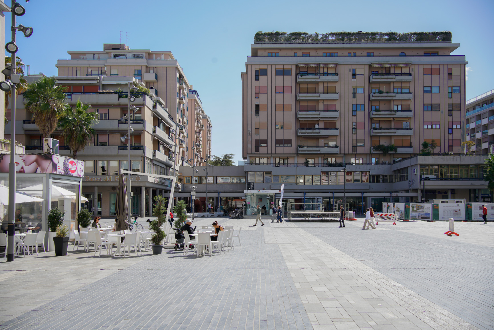 Il complesso residenziale che sorge nel cuore della città è costituito da sei corpi di fabbrica distinti, di cui 4 a torre e 2 in linea. Tutti si poggiano su una piastra, che ospita principalmente uffici, sospesa sopra un piano terra commerciale a doppia altezza, che configura un sistema di portici continuo tra l'esterno e la corte centrale. I diversi elementi compositivi del complesso si distinguono matericamente attraverso l'uso del cemento armato faccia a vista per il basamento e e gli elementi aggettanti dei balconi e le fioriere, mentre lo sviluppo residenziale è finito con intonaco pitturato.