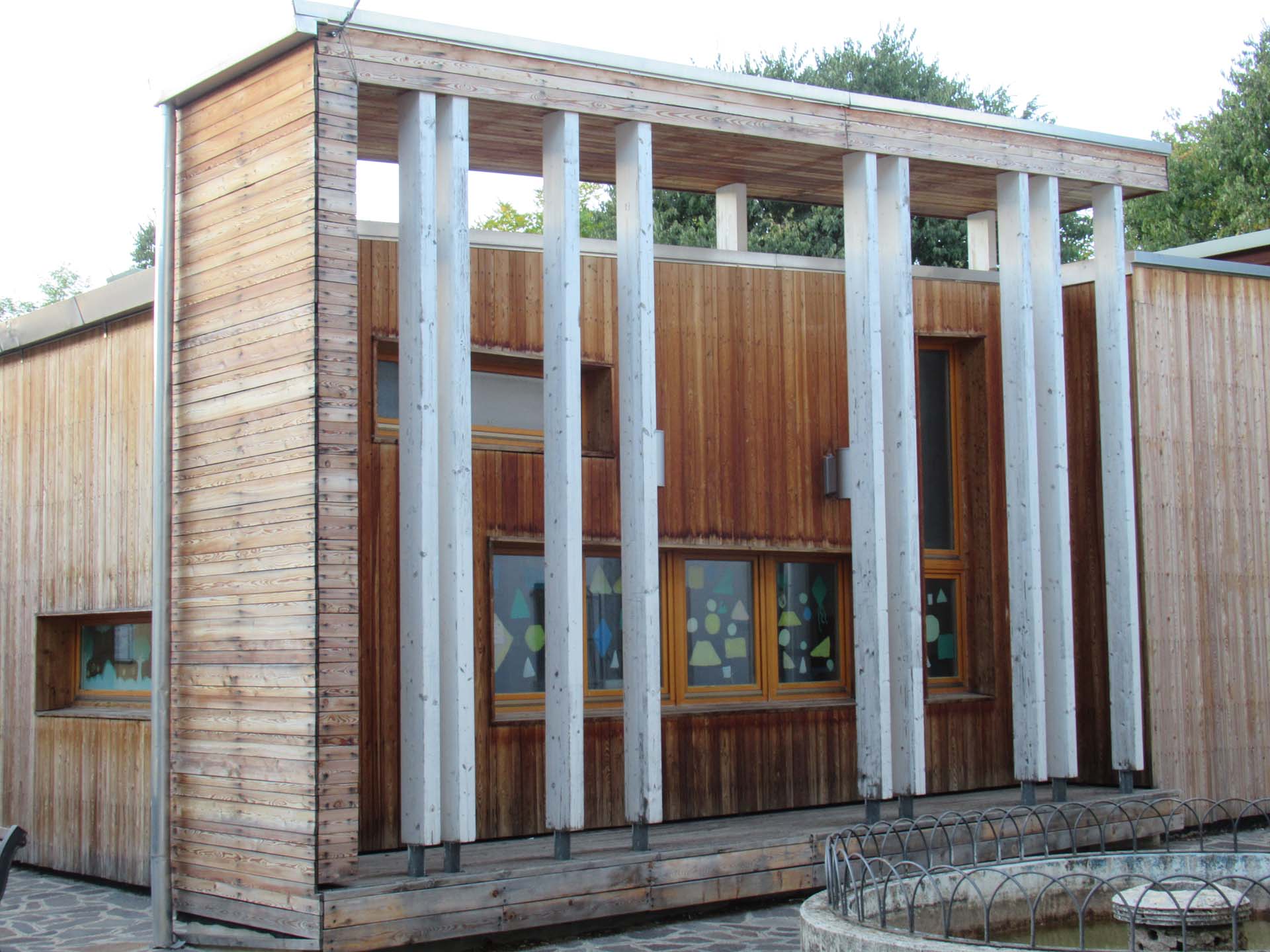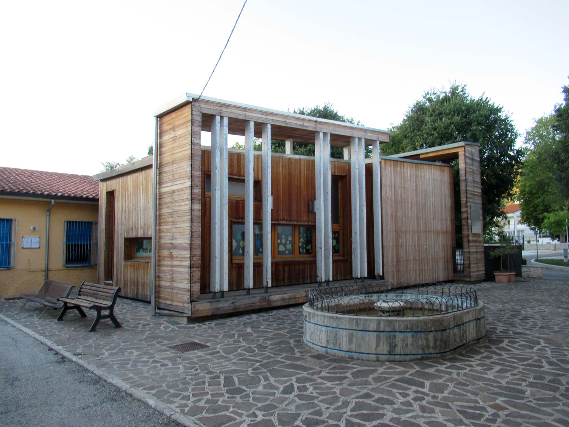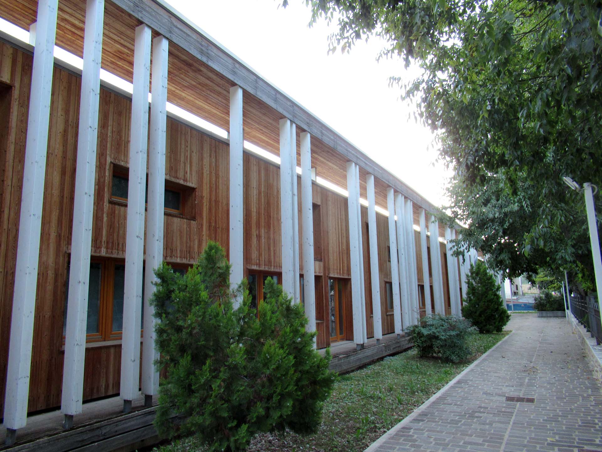 Il volume compatto dell’edificio a sviluppo orizzontale sorge sul sito del precedente plesso scolastico; il portico in legno a passo irregolare e verniciato di bianco dialoga con i filari di platani che fiancheggiano la via Valeria e garantisce l’accesso ai numerosi ambienti distribuiti su un unico piano di circa 800 mq. di superficie rialzato rispetto il piano strada di circa 50 cm.