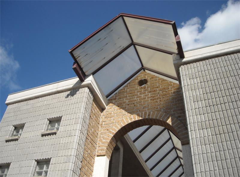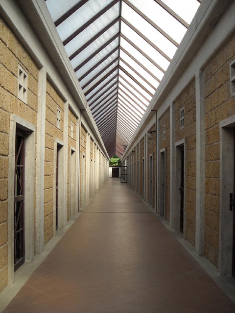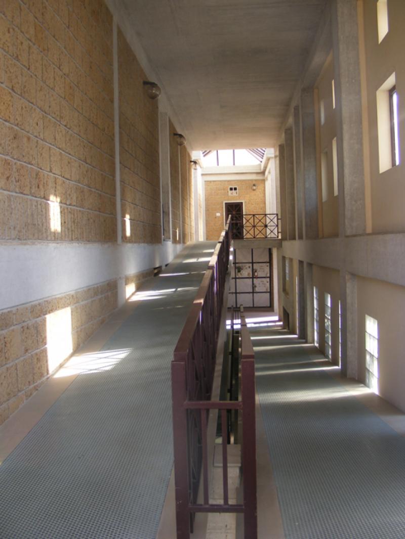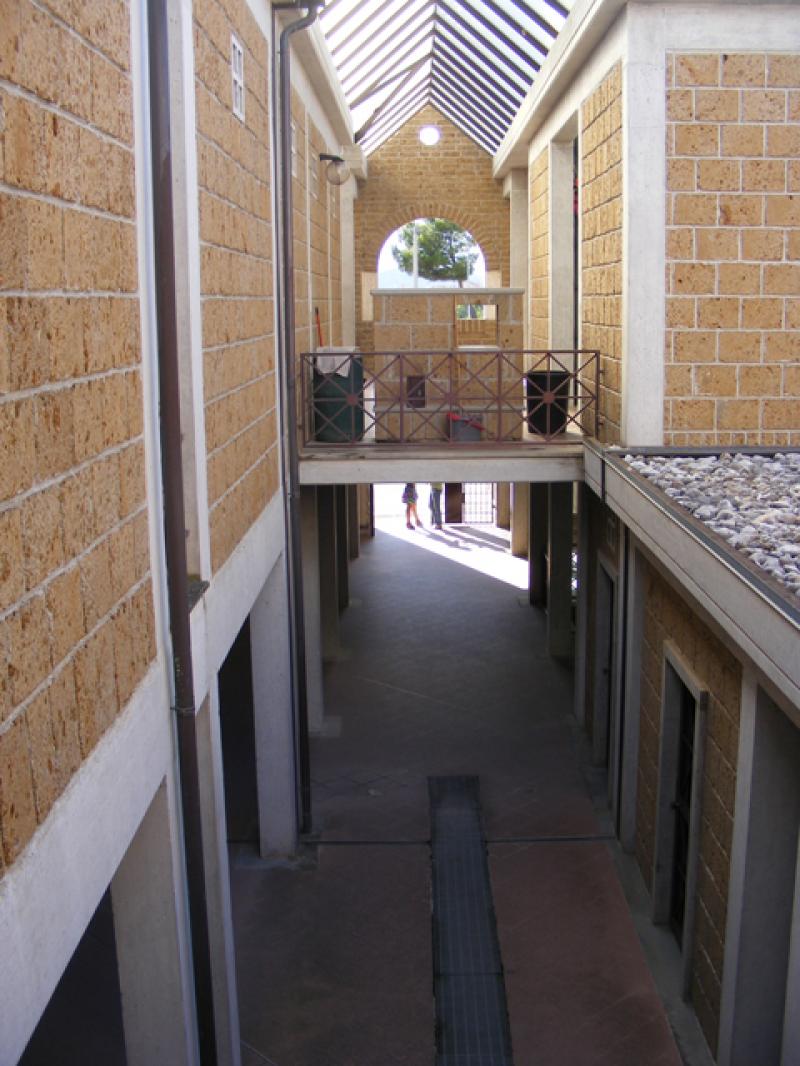 L’ingresso, evidenziato da due corpi sporgenti rivestiti di pietra grigia è costituito da un corridoio principale su cui si innestano quattro blocchi di lunghezze differenti creando alternanza di spazi chiusi e aperti.