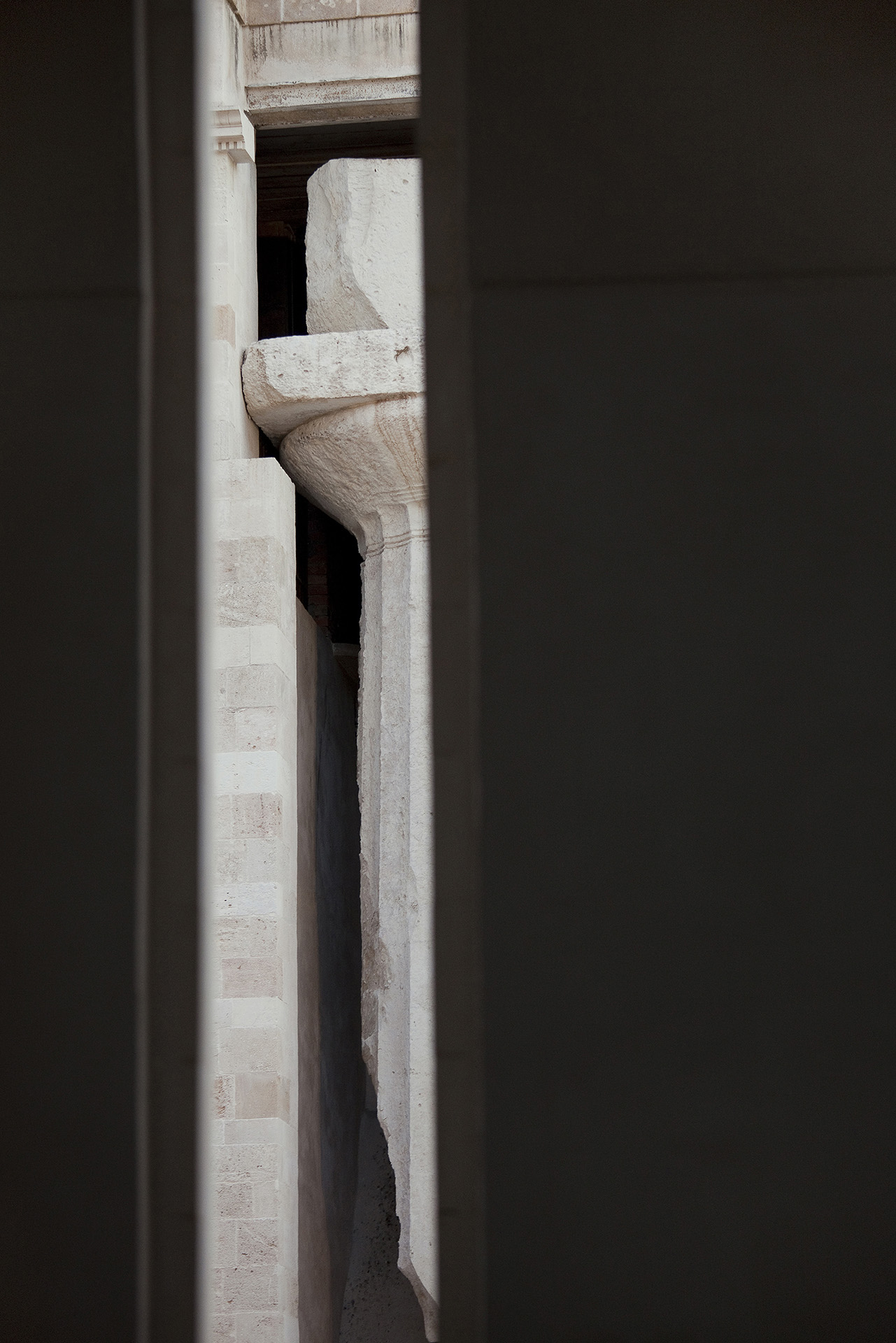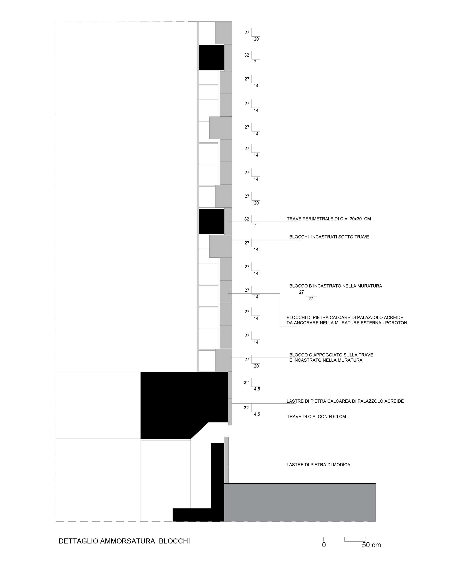 La struttura intelaiata in calcestruzzo del padiglione non poggia direttamente sul sito archeologico ma su smorzatori sismici. Ciò ha richiesto la realizzazione di un giunto perimetrale all’edificio che sottolinea lo stacco dal suolo e conferisce leggerezza alla massa compatta della costruzione.