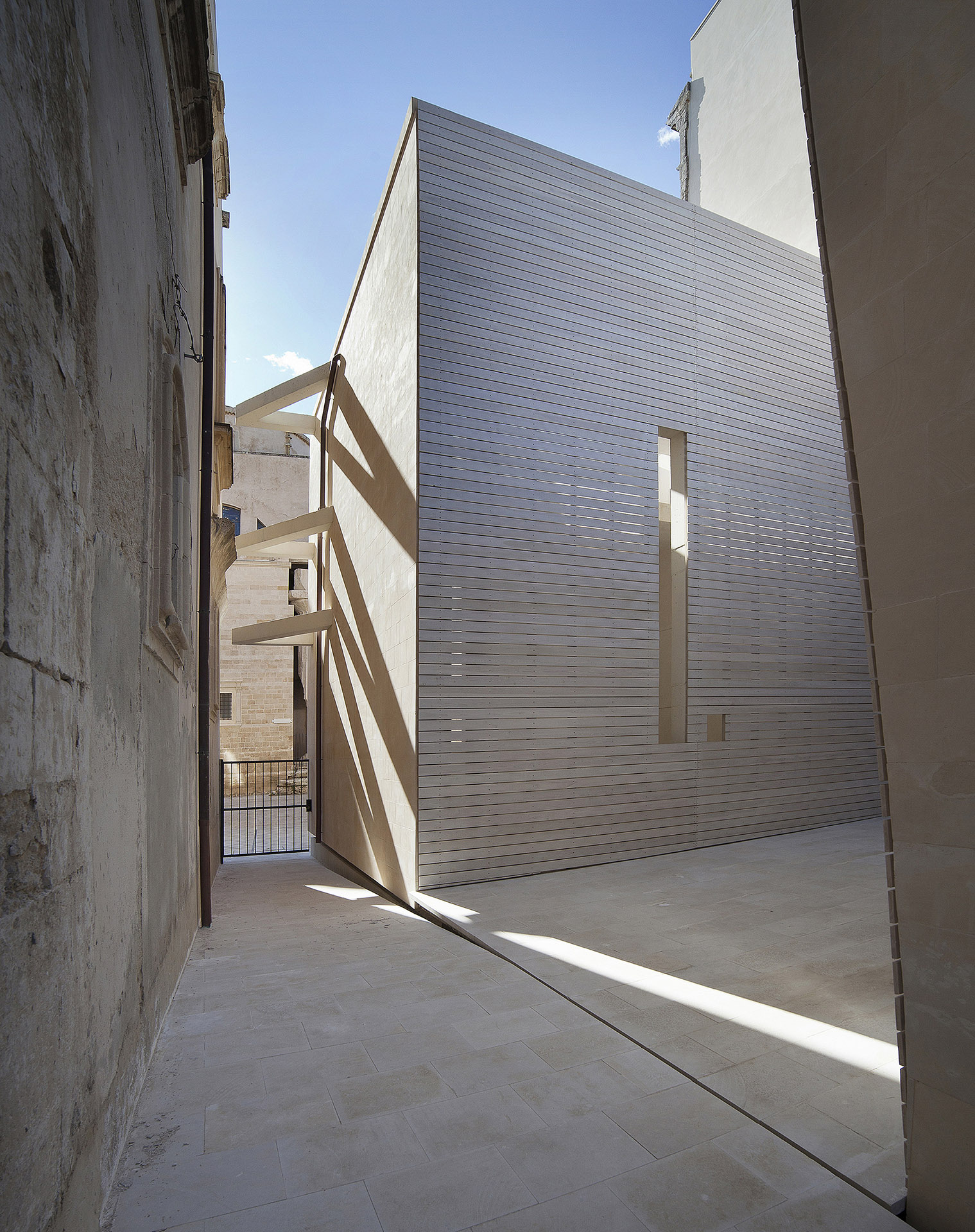 Nel realizzare un collegamento con un’area che custodisce parte della testimonianza millenaria dell’isola di Ortigia, il padiglione costituisce un edificio “silente”, attento alla presenza degli straordinari monumenti limitrofi.