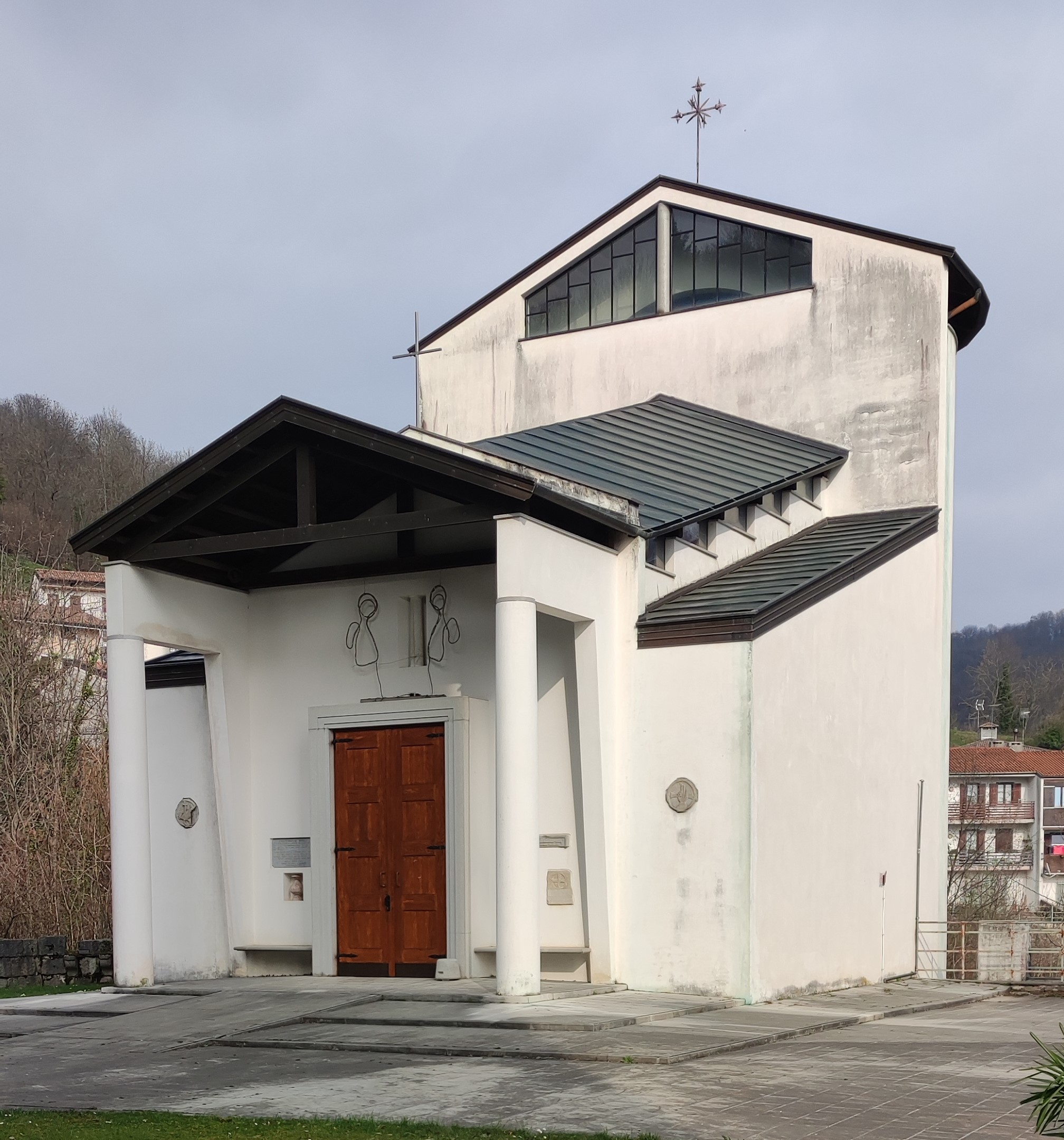 Commissionati dall’Arcidiocesi di Udine sul sito di quelli distrutti dal terremoto del 1976, chiesa e campanile sorgono isolati in un pianoro sulla cima di un colle dominante sul paesaggio boscoso circostante, quasi a vedetta dell’estremo limite dell’omonima piccola frazione del paese di Montenars. Costruiti su un terreno che, dietro la chiesa, scende ripido fino al greto di un torrente, i due manufatti stanno a calcolata distanza tra loro, in ragione della riduzione delle dimensioni della navata della chiesa riedificata rispetto a quella originaria; il campanile invece riutilizza il basamento superstite del manufatto ottocentesco. L’aula della chiesa si riduce in pianta ad un quadrato, e sembra spingere sul volume absidale più alto quasi comprimendosi e innalzandovi contro la struttura della copertura, che si solleva su due slanciati archi “zoppi” che scavalcano paralleli la navata sottostante. Le capriate del tetto a falde poggiano sul profilo superiore a salienti delle due strutture ad arco, e ad una quota più bassa due ali ribassate chiudono i fianchi della chiesa. Tutta l’attenzione dell’osservatore converge così sull’abside, illuminata con luce indiretta da una “finestra-timpano” più alta - non visibile ai fedeli - e composta in pianta da una struttura semicilindrica a doppio guscio con intercapedine accessibile, nella quale sono ricavati il tabernacolo, isolato sul fondo, le nicchie ritagliate come finestre, con le due statue, e le scale alle due logge sottostanti la copertura e, a scendere, alla cappella feriale con il sepolcro dell’arcivescovo, e al vano basamentale. Visto dall’esterno, e in particolare dai fianchi, il volume dell’abside si rivela essere una vera e propria torre a pianta semicilindrica, esterna al limite dello stesso pianoro e fondata alla base della scarpata retrostante, di fronte al greto del torrente. L’abside-torre si coglie da grande distanza - apparizione enigmatica - e insieme con l’alto campanile e gli spalti merlati dei parapetti che limitano il pianoro, richiamano alla mente una fantasiosa struttura castellana. La torre campanaria introduce un ulteriore motivo di sorpresa: al di sopra della poderosa base superstite, la nuova struttura si mostra cava su due lati opposti, rivelando al suo interno, in successione verticale, una sorta di tempietto, un’edicola vuota a sbalzo, fino alla plancia metallica della cella campanaria totalmente trasparente, sospesa sopra una colonna centrale.