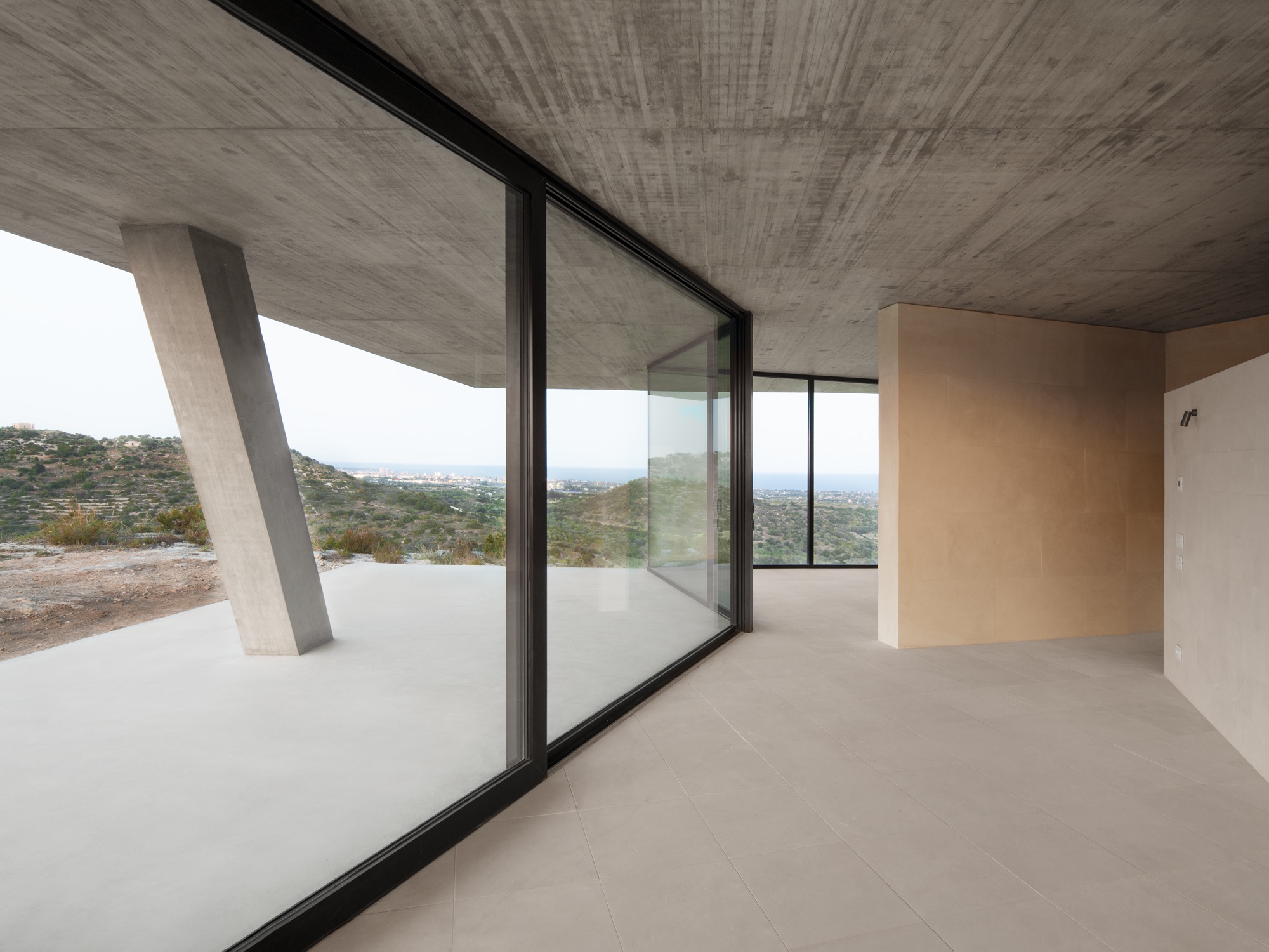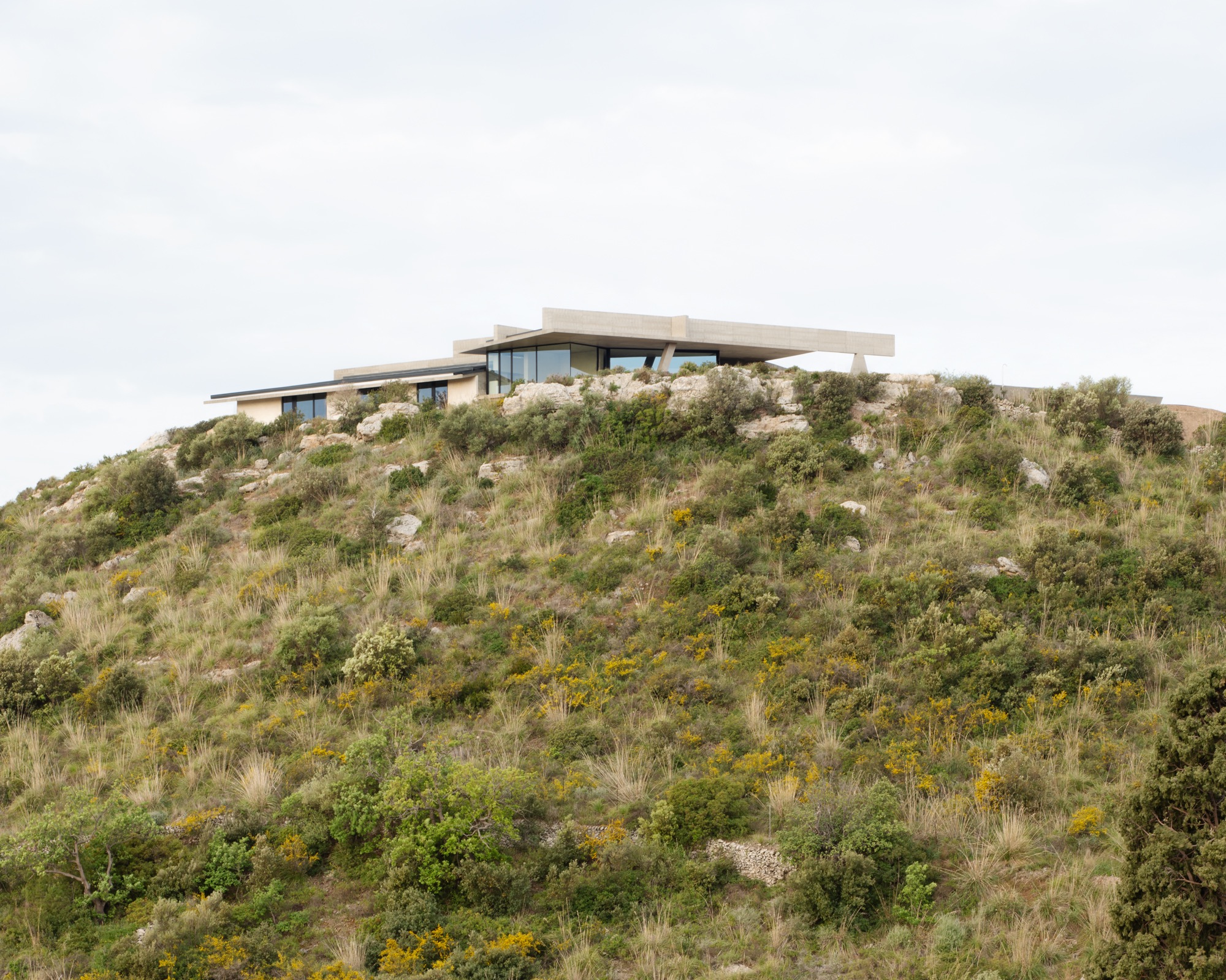 La casa RP01, che si estende su un unico livello e copre una superficie complessiva di 489 mq, viene pensata in parte ancorata al suolo e in parte a sbalzo rispetto all’orografia del pendio.