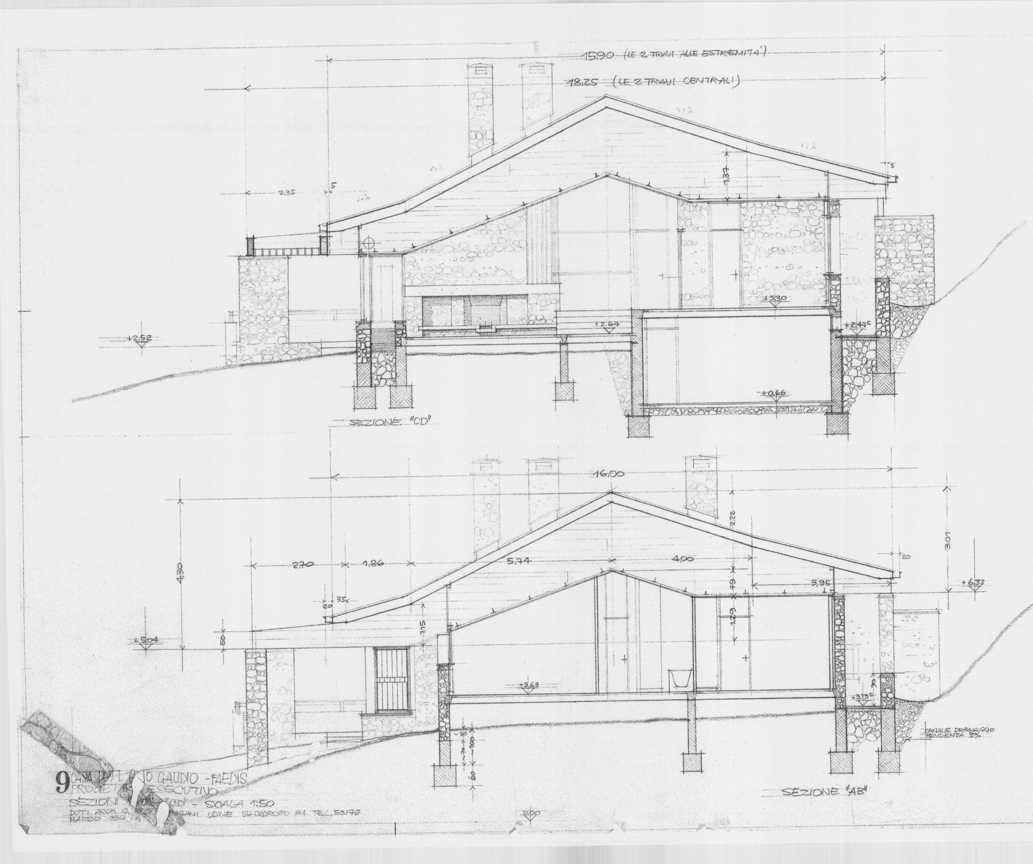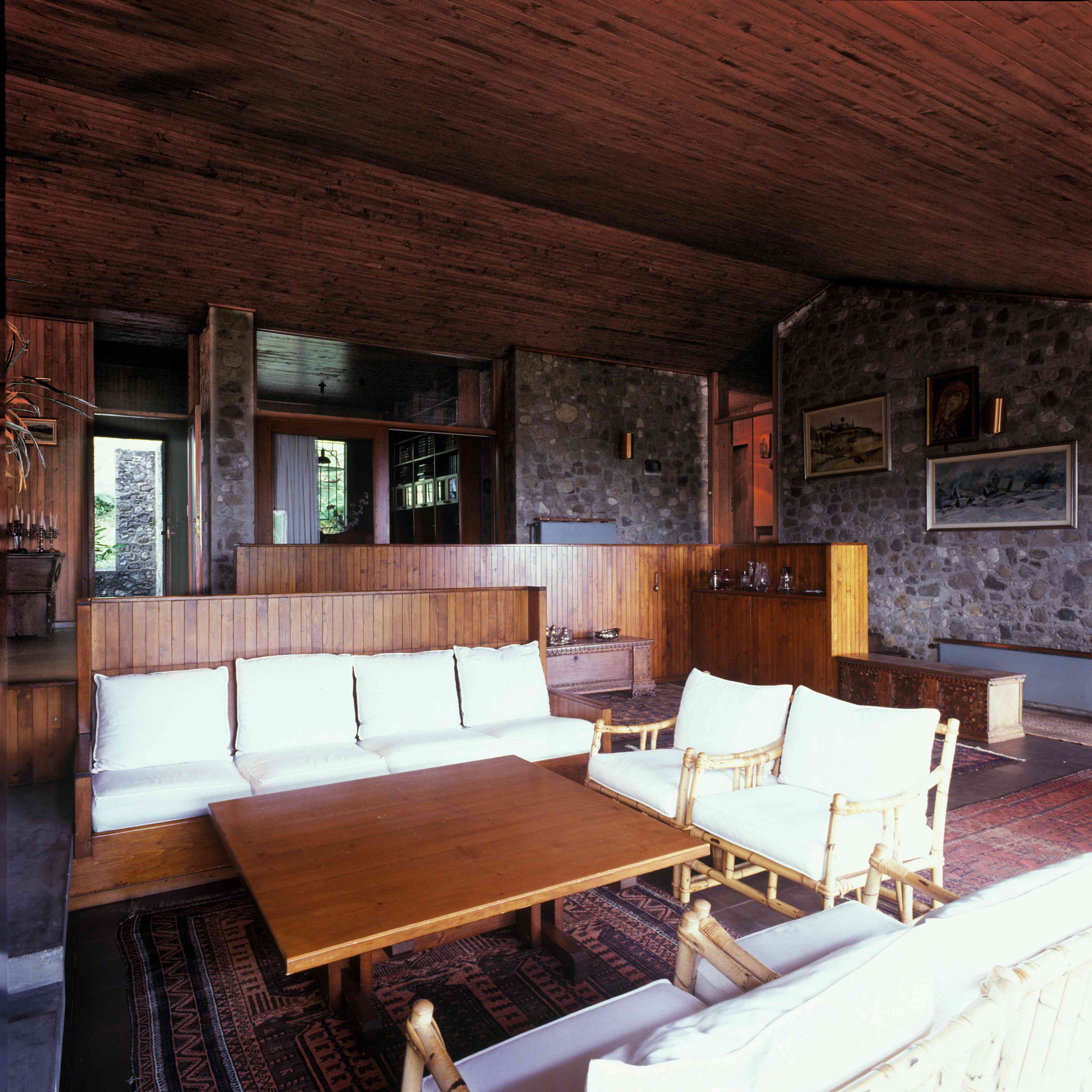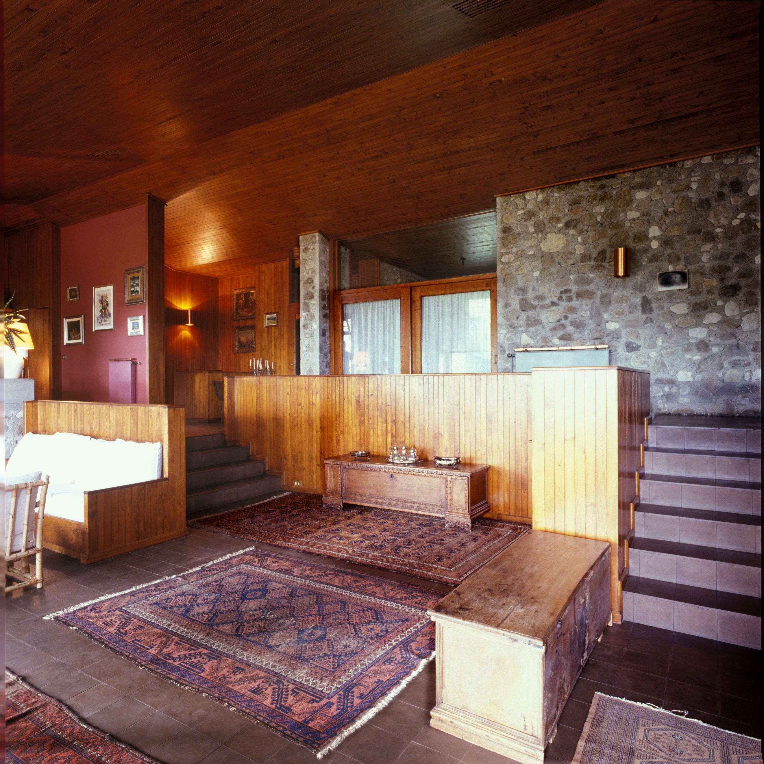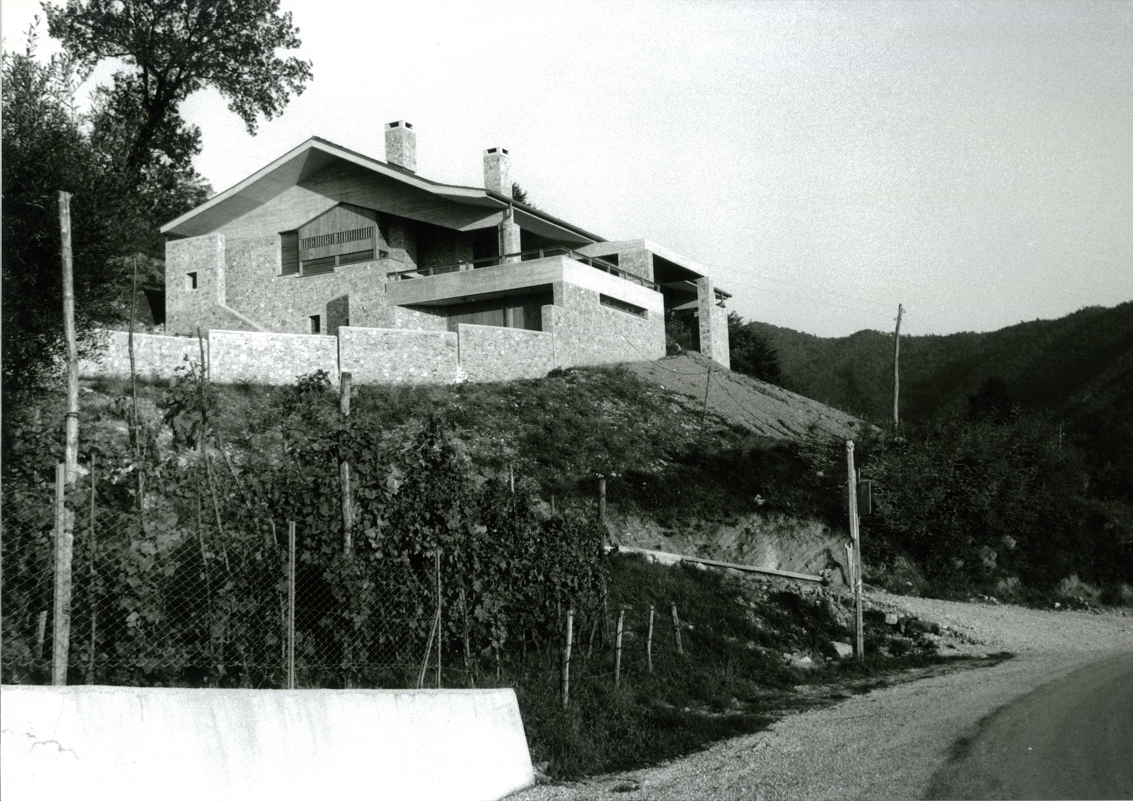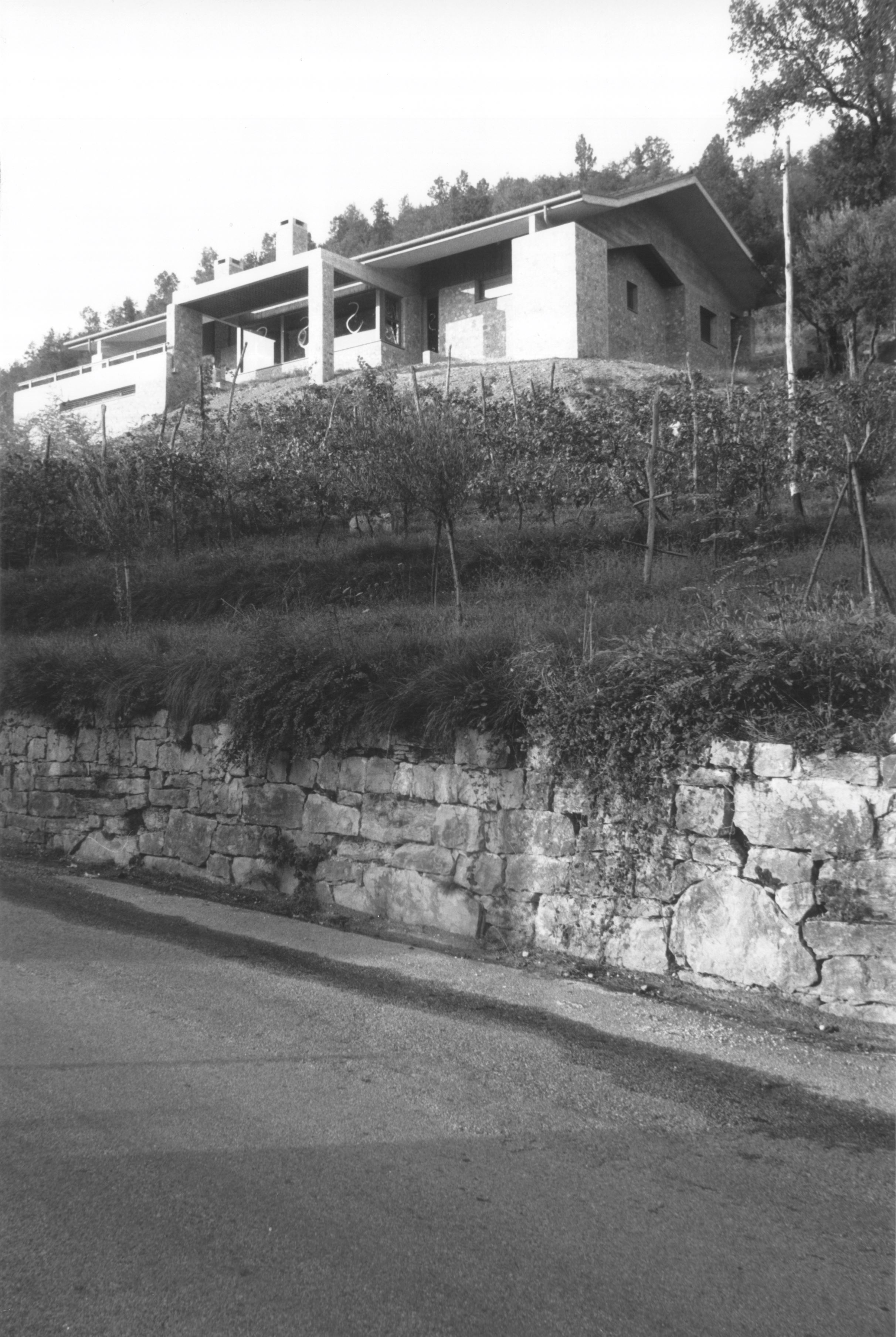 In questa villa, Mangani utilizza per la prima volta il muro cementizio in sasso in un edificio di considerevoli dimensioni. Le larghe superfici scabre in ciottoli legati nel cemento suggeriscono un confronto diretto con l’edilizia storica del paese. La villa si sviluppa prevalentemente su un piano, articolato dal dislivello del soggiorno. Dal piazzale di accesso il fianco dell’edificio si presenta a due piani, con le autorimesse sistemate nel basamento. Un percorso parzialmente in trincea raggiunge, piegando intorno alla casa, l’entrata ricavata sul retro, alla quota più alta, a ridosso del pendio a nord. Varcato l’ingresso, lo spazio principale della casa si coglie in un solo colpo d’occhio. Il ripiano su cui affacciano lo studio e la zona pranzo distribuisce lateralmente da una parte la cucina con i locali di servizio e la taverna, dall’altra la zona notte, più alta di due gradini. Frontalmente, lo stesso ripiano guarda, con un affaccio interno, sull’ambiente del soggiorno, quattro gradini più in basso. Il senso di apertura dello spazio, per chi proviene dallo stretto percorso di “avvicinamento” alla casa, impressiona anche perché lo sguardo può proseguire oltre la grande vetrata sul fondo, in direzione del vasto panorama. L’effetto spaziale dato dalla successione dei diversi piani che dalla zona dell’ingresso scendono al soggiorno e alla terrazza esterna è rafforzato dall’andamento del controsoffitto inclinato, agganciato alle travi in calcestruzzo armato dal caratteristico profilo spezzato. Vista dagli ambienti sottostanti, la copertura a falde produce l’effetto di un grande riparo, simile a una tenda. I percorsi sul perimetro della costruzione, coperti dalla sporgenza del tetto, danno forma a quegli spazi di filtro tra l’abitazione e l’esterno che trovano il loro culmine nella terrazza soprastante al volume dell’autorimessa. Questa terrazza, diretto prolungamento del soggiorno, è collegata anche alla cucina e si sviluppa ben oltre la proiezione della linea di gronda. I muri portanti in sasso proseguono anche all’interno dell’abitazione, accostandosi al legno dei pannelli divisori, degli arredi fissi e dei controsoffitti, in una composizione che pone l’accento sulle qualità visive e sul carattere dei materiali, impiegati senza alcun rivestimento.