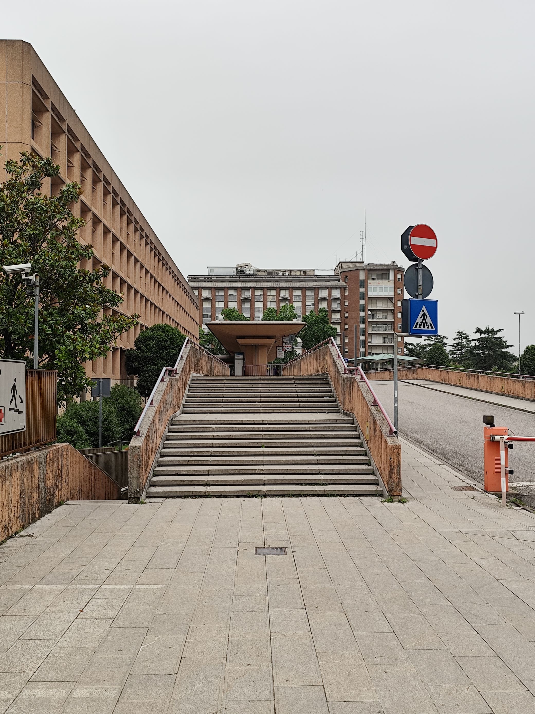 Il padiglione, progettato da Federico Marconi nel 1964-78, funge da accesso all’Ospedale Civile di Udine, quest’ultimo risalente alla fine degli anni ‘20. L’edificio polifunzionale sorge in un’area periferica rispetto al centro storico della città e presenta un corpo parallelepipedo a pianta rettangolare, articolato su sei piani fuori terra. Esternamente, il fronte principale, rivolto verso l’ampio parcheggio antistante, è caratterizzato dall’utilizzo di elementi standardizzati, che formano uno schema modulare a griglia dove ogni livello risulta connotato da una sequenza di finestre arretrate rispetto al filo della facciata e contenute entro delle cornici scatolari strombate: una chiara citazione dell’edificio per uffici Enso-Gutzeit (1959-62) ad Helsinki di Alvar Aalto, con il quale Marconi collabora fra gli anni ’50 e i primi anni ‘60. Da un punto di vista costruttivo, il padiglione presenta una struttura portante in cemento armato con mura di tamponamento in laterizio rivestite da pannellature prefabbricate in calcestruzzo di colore rosa.
