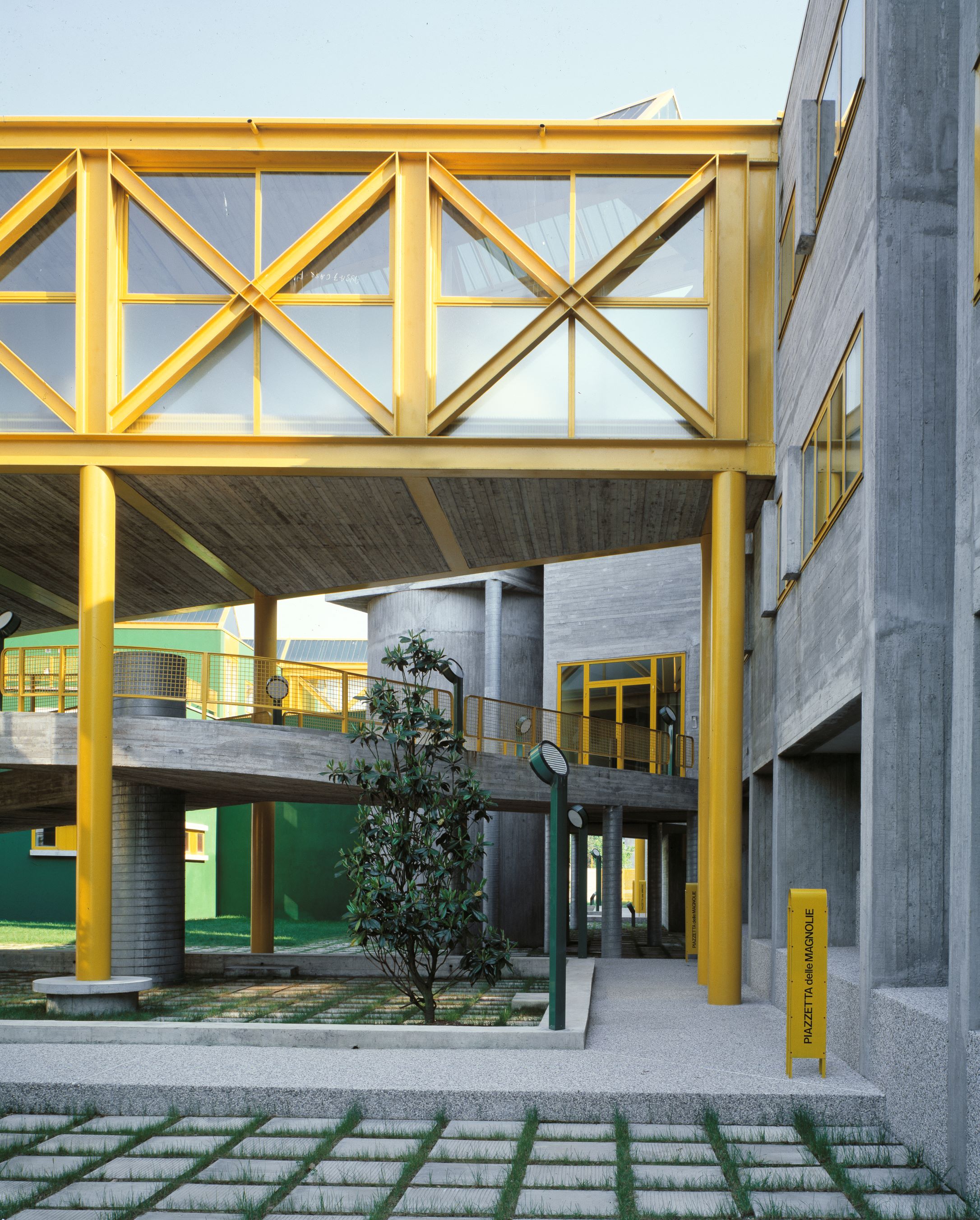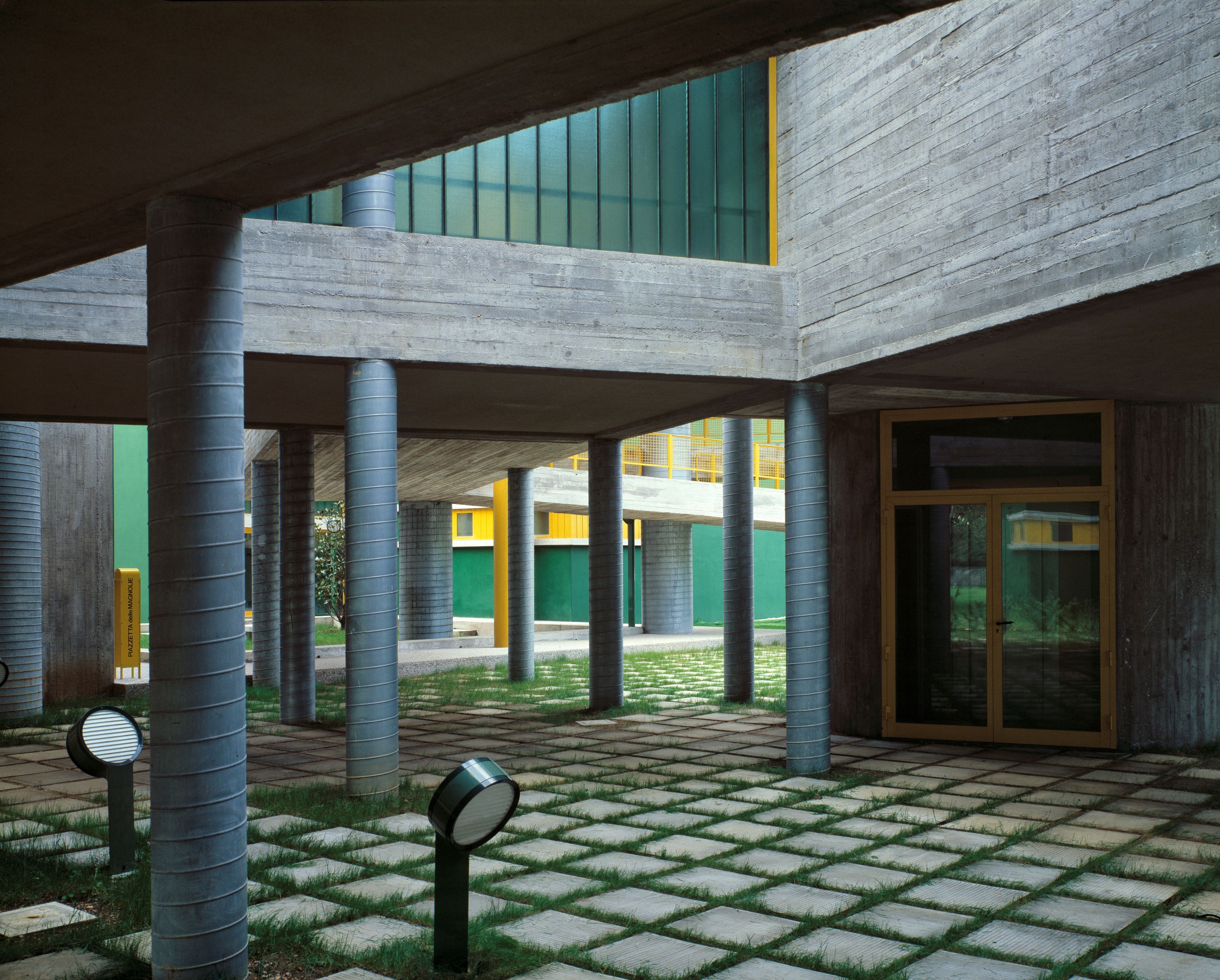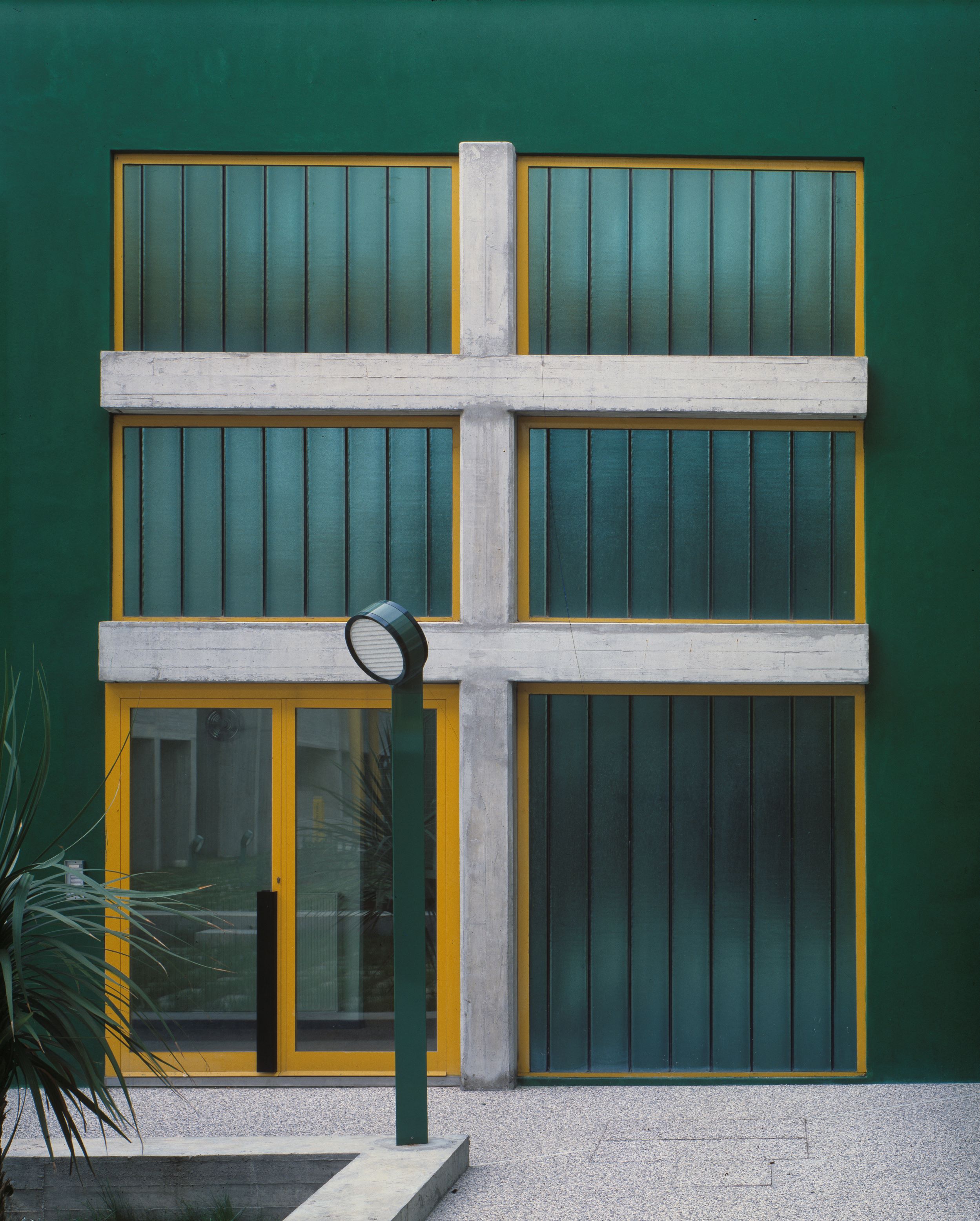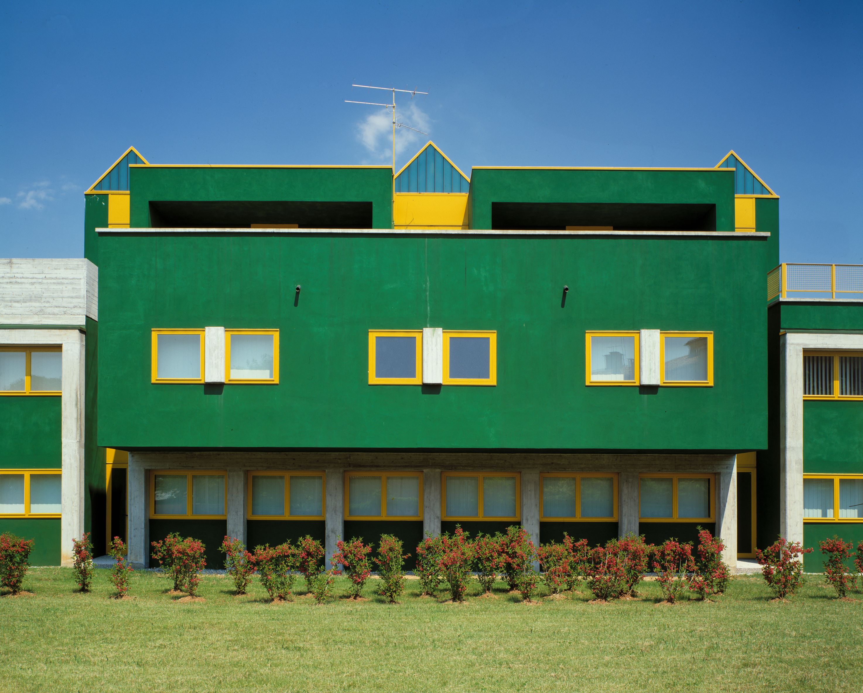 - Materiale di facciata: Cemento armato a vista per il corpo centrale; pareti di tamponamento intonacate di verde per gli undici nuclei-base