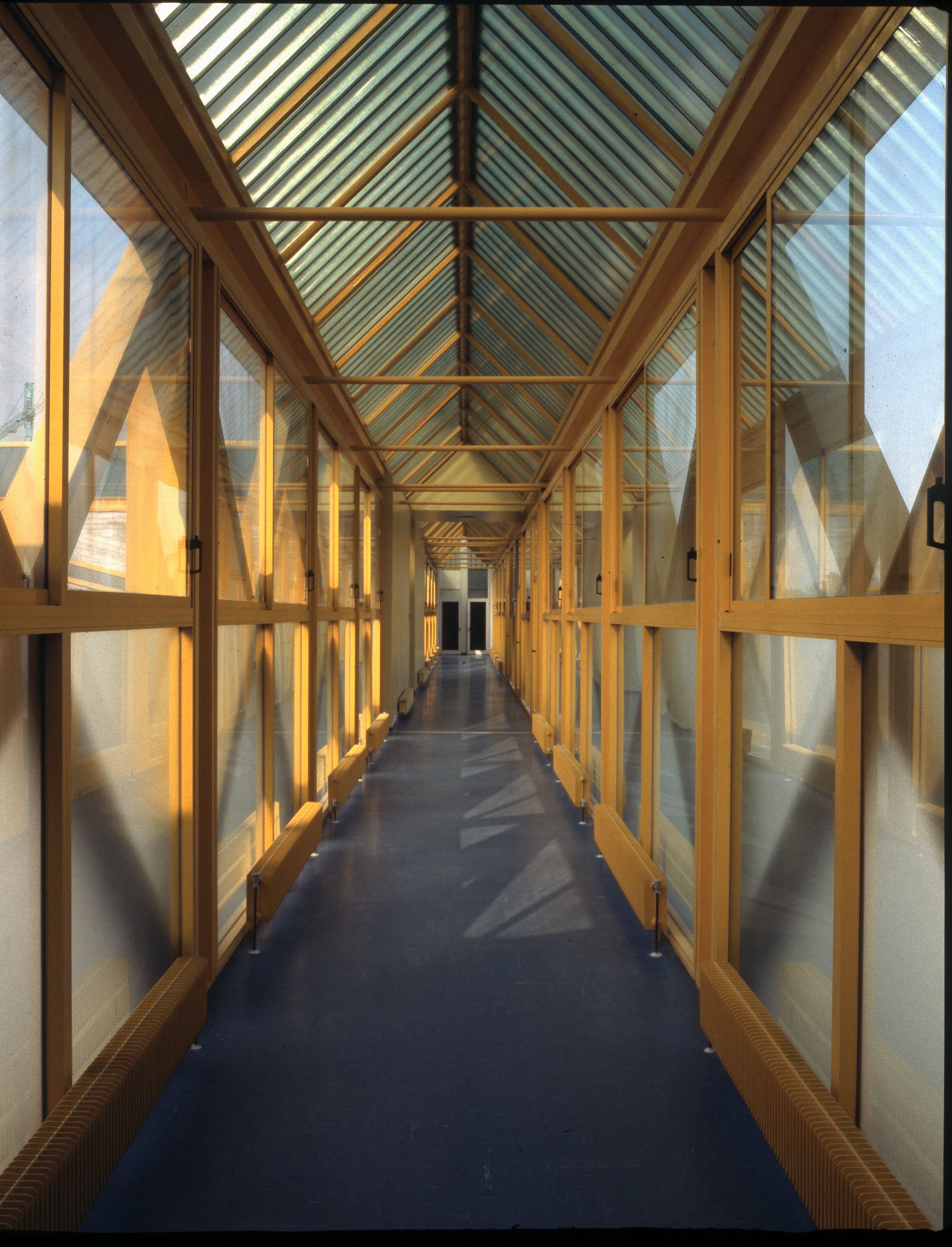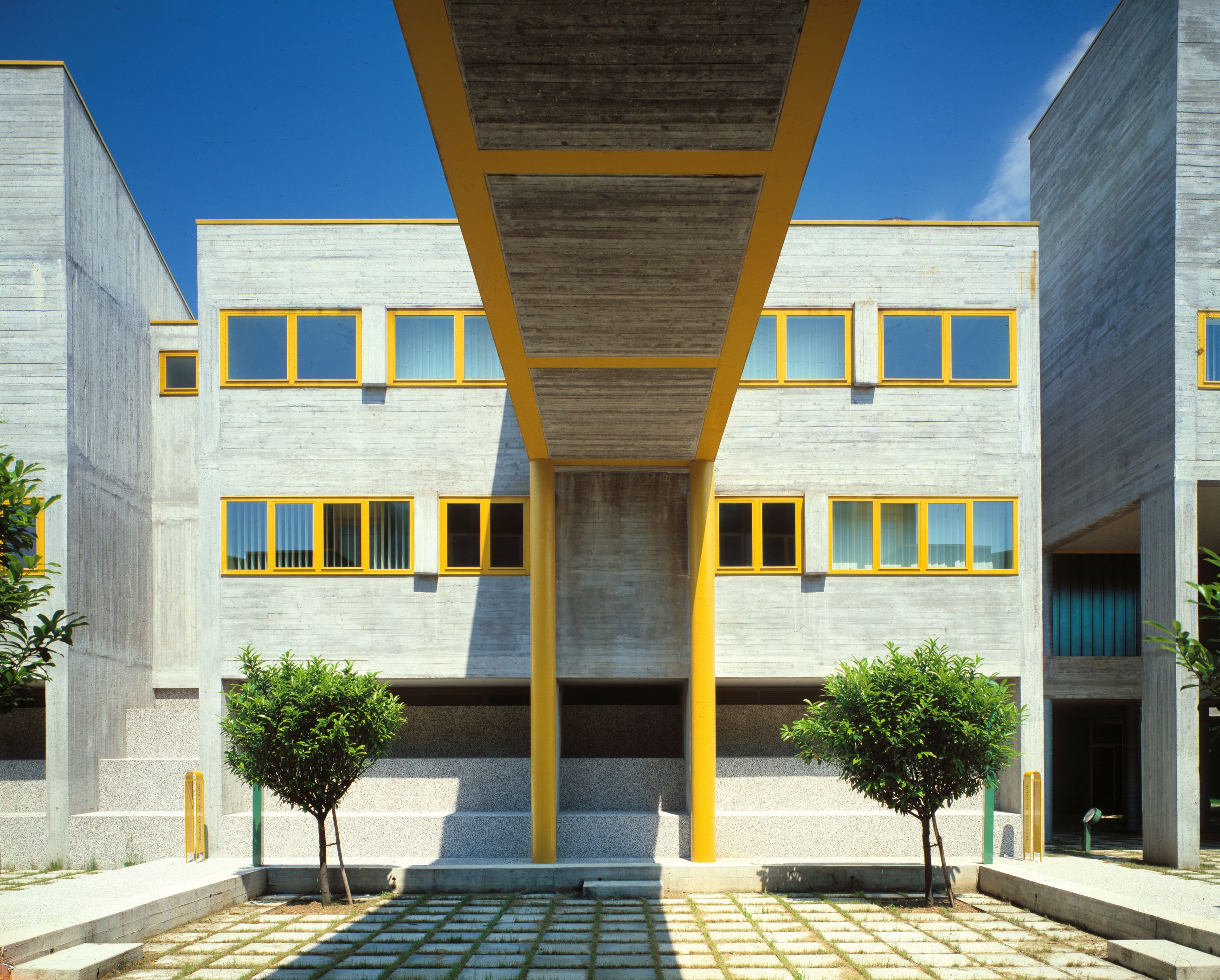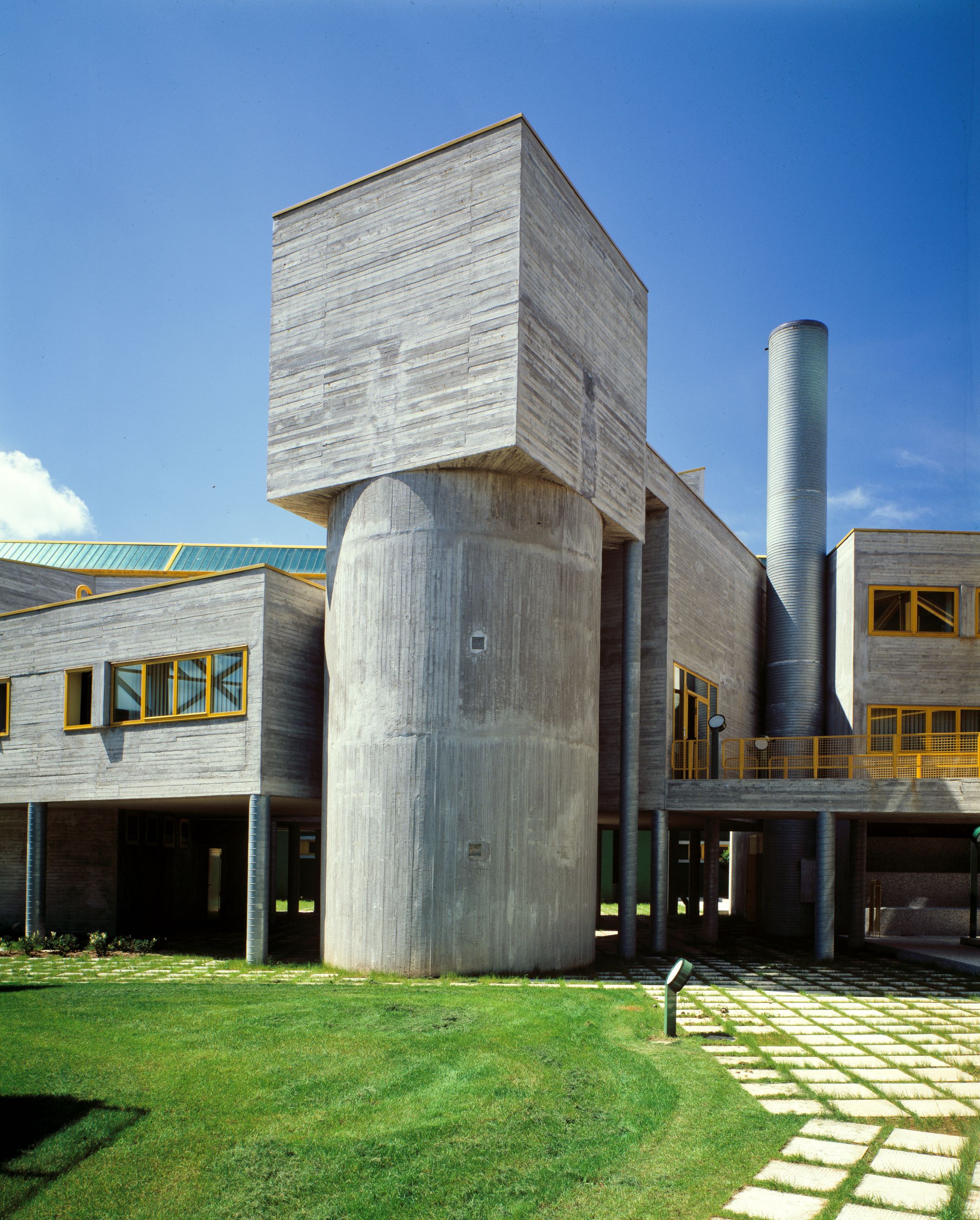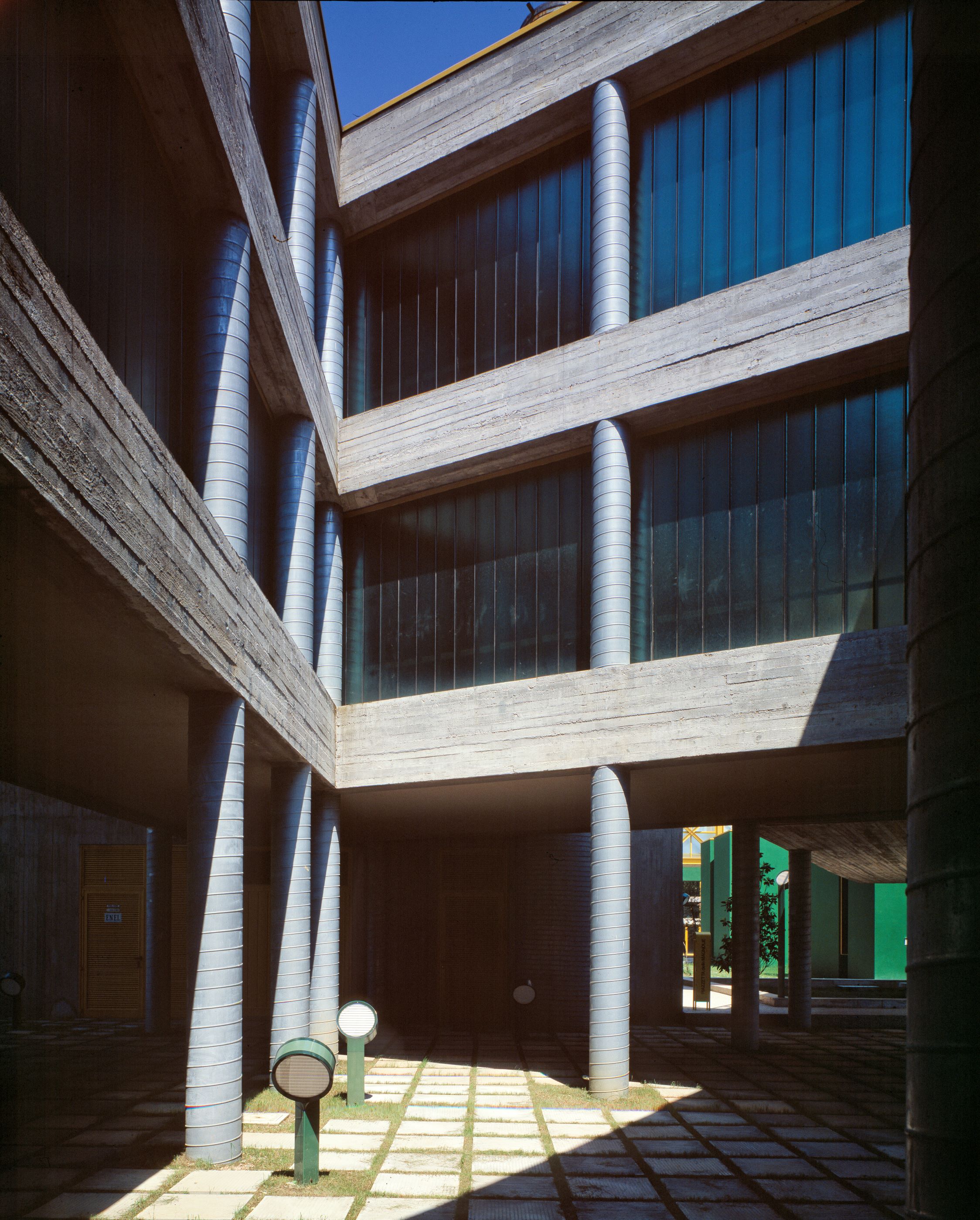 - Materiale di facciata: Cemento armato a vista per il corpo centrale; pareti di tamponamento intonacate di verde per gli undici nuclei-base