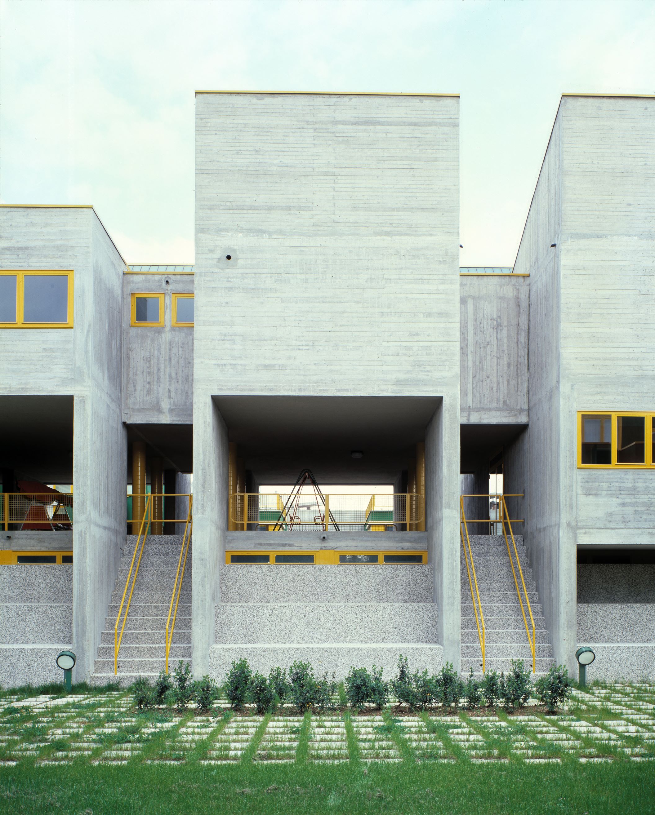La fondazione “Osiride Brovedani”, progettata dallo studio d’architettura Celli-Tognon nel 1976-80, sorge in un’area verde di circa tre ettari, in una posizione suburbana rispetto al centro storico di Gradisca. Il complesso, che assolve ad una funzione educativa ed assistenziale, presenta un corpo centrale sviluppato su tre piani a pianta rettangolare, con i lati lunghi collegati, tramite passaggi in quota coperti da vetrate, a undici blocchi edilizi indipendenti, anch’essi ad impianto rettangolare e articolati su tre livelli. Ciascuno dei nuclei in questione - che assume l’aspetto di una villa con il primo piano aggettante rispetto al filo della facciata e con una terrazza di affaccio verso l’esterno - ospita un’abitazione completa destinata a un educatore e a nove ragazzi, mentre nel corpo principale sono distribuiti gli uffici amministrativi, l’alloggio del custode, i servizi comuni e una sala pluriuso gestita in collaborazione con il Comune. Esternamente, l’edificio centrale in cemento armato a vista è caratterizzato lungo il fronte principale da un volume cilindrico che alloggia i collegamenti verticali e da un’aerea rampa pedonale di accesso sostenuta da pilastri circolari. Le abitazioni, invece, sono connotate da pareti di tamponamento intonacate di verde, animate dai serramenti metallici verniciati di giallo.