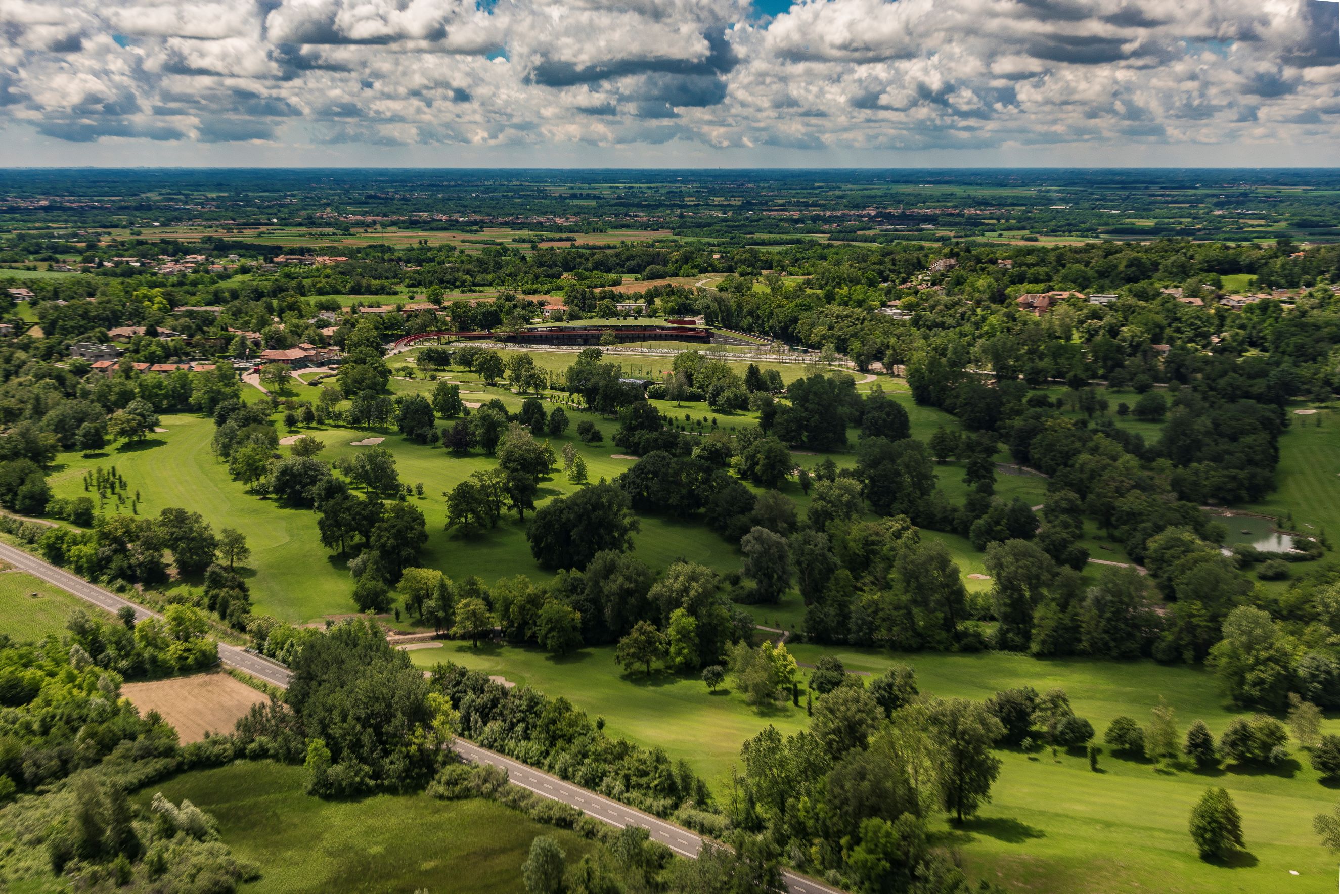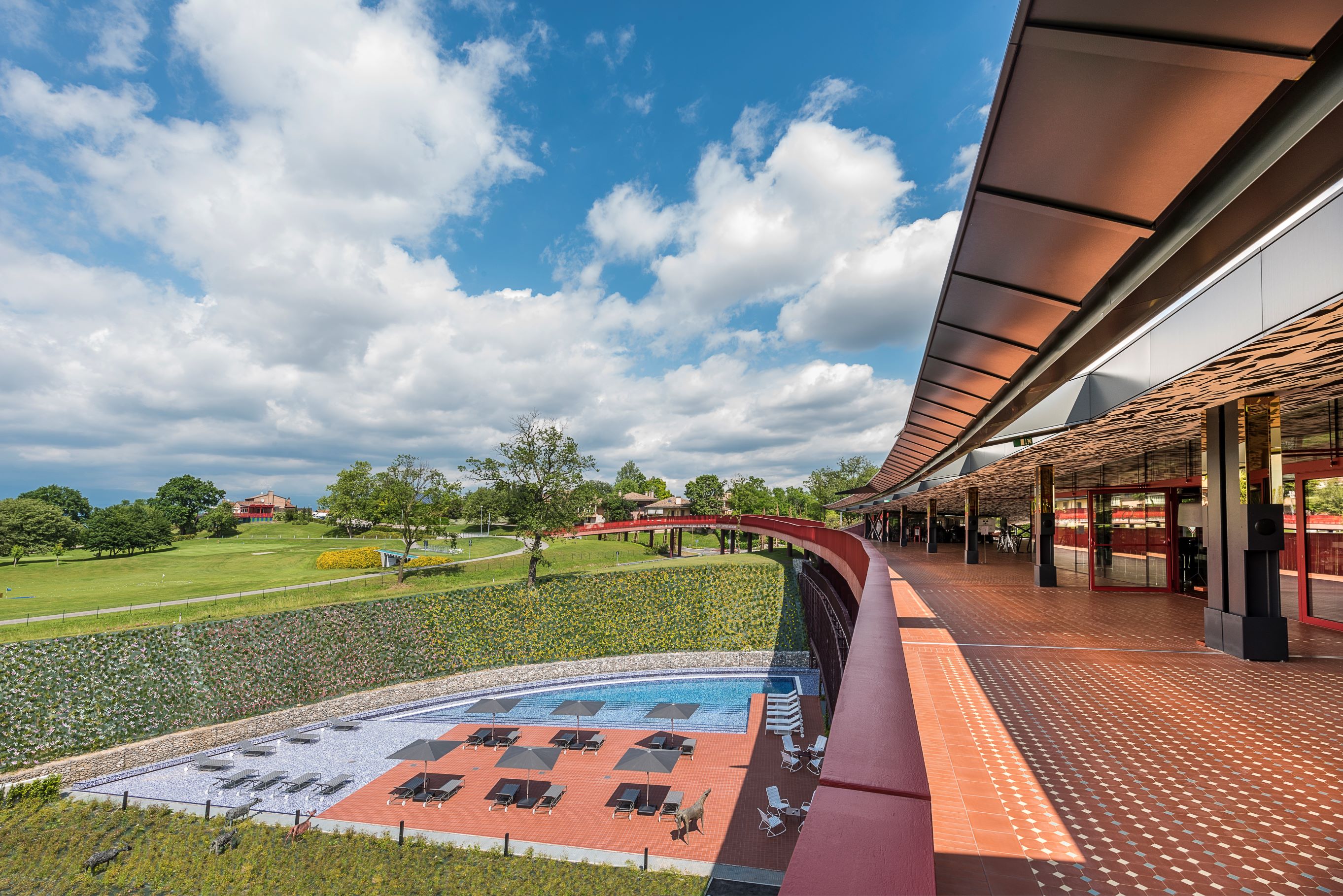 Il Villaverde Hotel&Resort, progettato su commissione dell’imprenditore Gabriele Lualdi da Alessio Princic a partire dal 2010 e terminato nel 2017, sorge in un contesto di particolare qualità ambientale adiacente il campo dell’Associazione Sportiva Dilettantistica Golf Club Udine. L’edificio, caratterizzato da un impianto rettangolare dall’andamento curvilineo articolato su quattro piani, è incassato nel terreno e si sviluppa verso il basso. Al piano terra, posto a livello della strada e connotato da una pavimentazione in piastrelle rosse, sono distribuiti la hall, la reception, il ristorante, il bar e la sala conferenze. Questi ambienti, divisi da delle tende dorate, si affacciano mediante delle pareti vetrate su una terrazza, definita dall’architetto un nastro rosso, che attraversa il paesaggio e, superando la strada di campagna, collega il resort alla Club House del Golf Club Udine. Degna di nota l’ampia copertura degli spazi, disegnata dall’artista contemporaneo Giorgio Celiberti: si tratta di una tela di 2200 mq composta dalla ripetizione di sei pannelli in acciaio con diversi motivi astratti, chiamati “maschere”, disposti casualmente sotto la supervisione dell’autore e dipinti in bianco e nero, colori che simboleggiano la città di Udine.