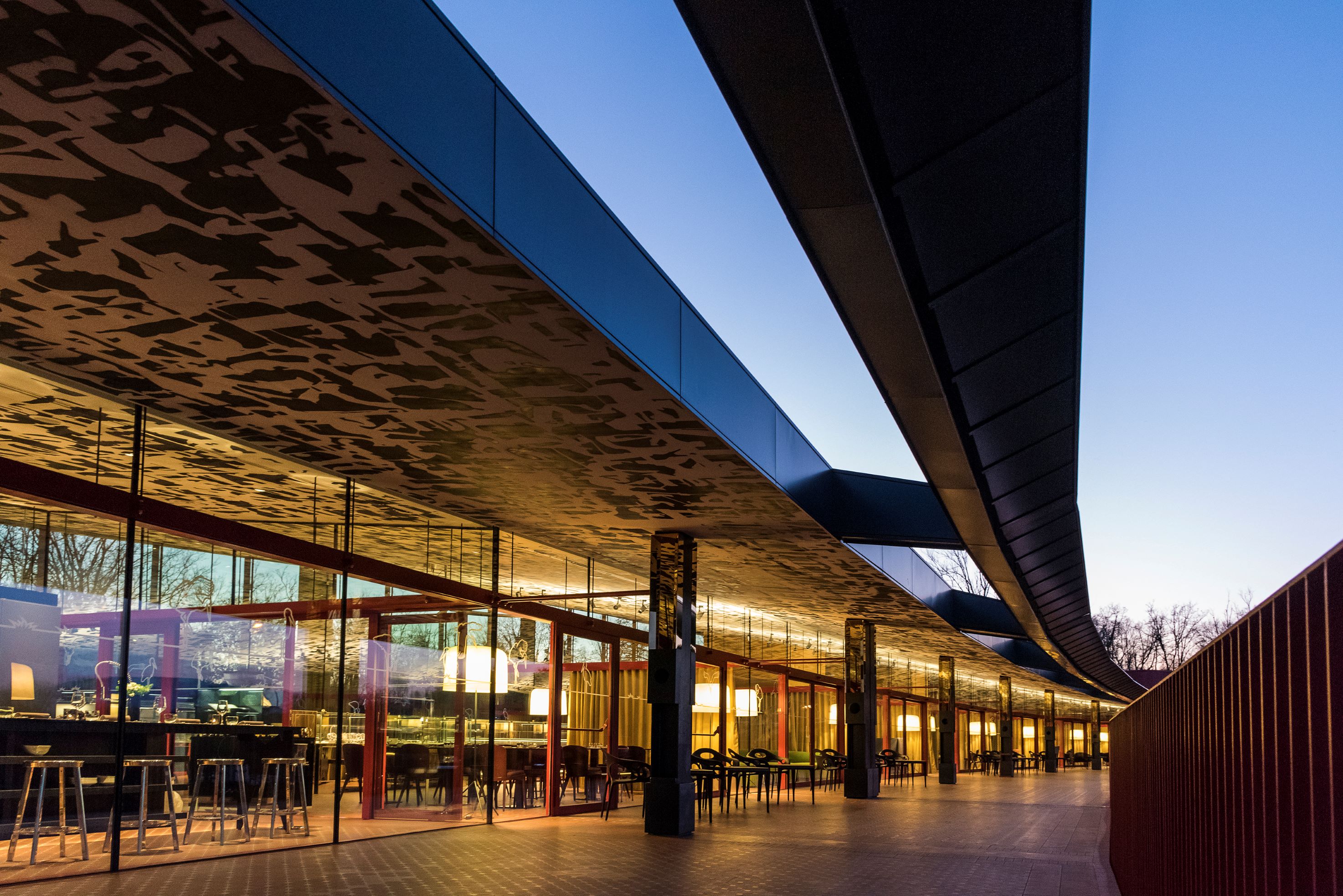 - Materiale di facciata: Pannellature vetrate, elementi metallici verniciati di rosso