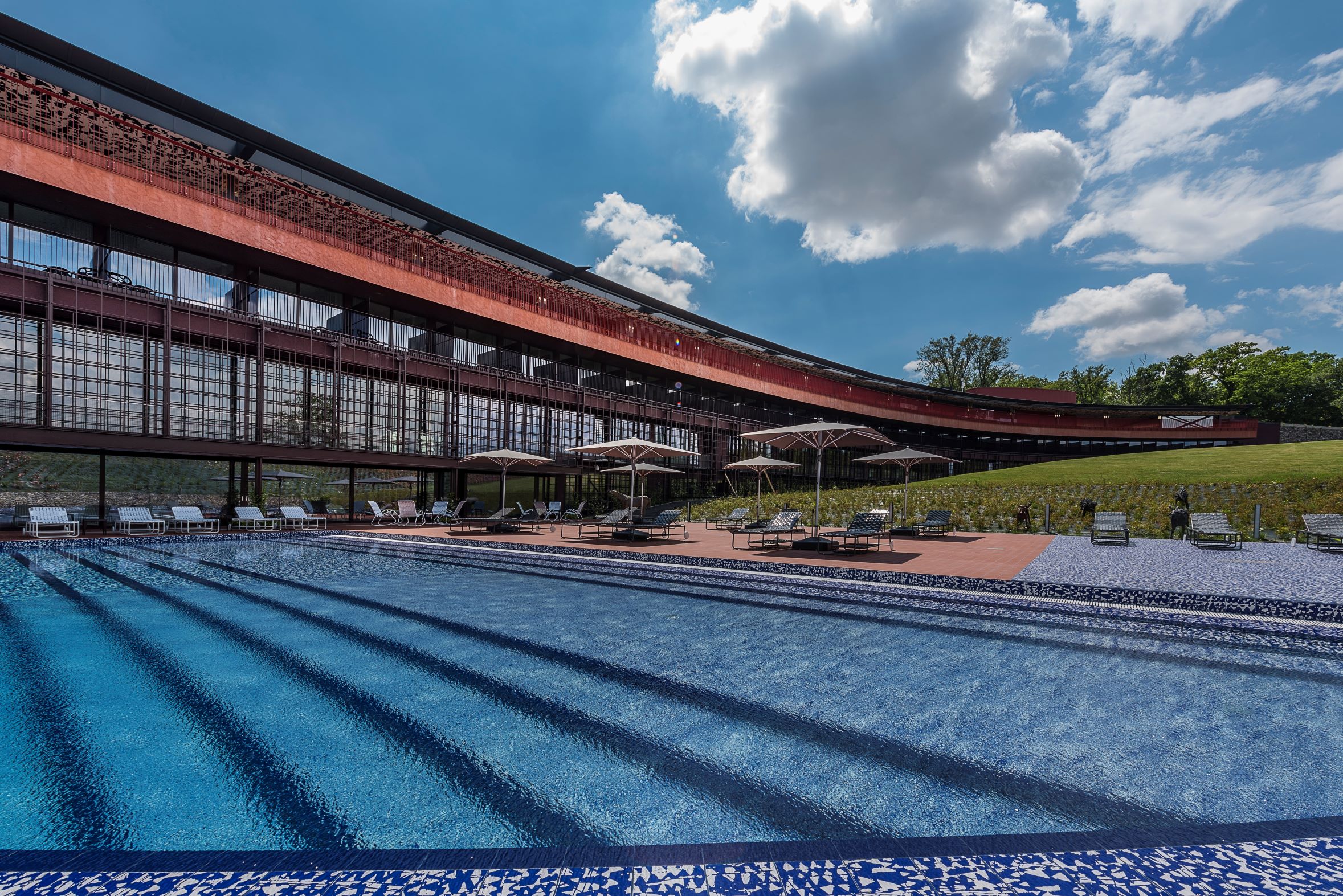 Al piano inferiore sono dislocate le camere dell’hotel (livello -1), ciascuna delle quali munita di un balcone di affaccio verso il paesaggio e di un arredamento accuratamente disegnato: pannelli in Noce Daniela, accessori smaltati inox, una lunga tenda che racchiude la cabina armadio, utilizzata come parete e barriera acustica, e lampade a LED a sospensione, progettate in collaborazione con Karlboxx: Zero1. Nei due piani sottostanti (livelli -2 e -3), invece, sono dislocati gli ambienti della SPA, affacciati su una conca circondata da colline fiorite. Al centro di questo spazio si sviluppa la piscina, dove l’opera d’arte di Celiberti al pianterreno è stata ripresa e tradotta in sette piastrelle di ceramica blu e bianche, stampate da Fiorano, la cui disposizione casuale consente di ottenere un motivo decorativo astratto particolarmente variegato.