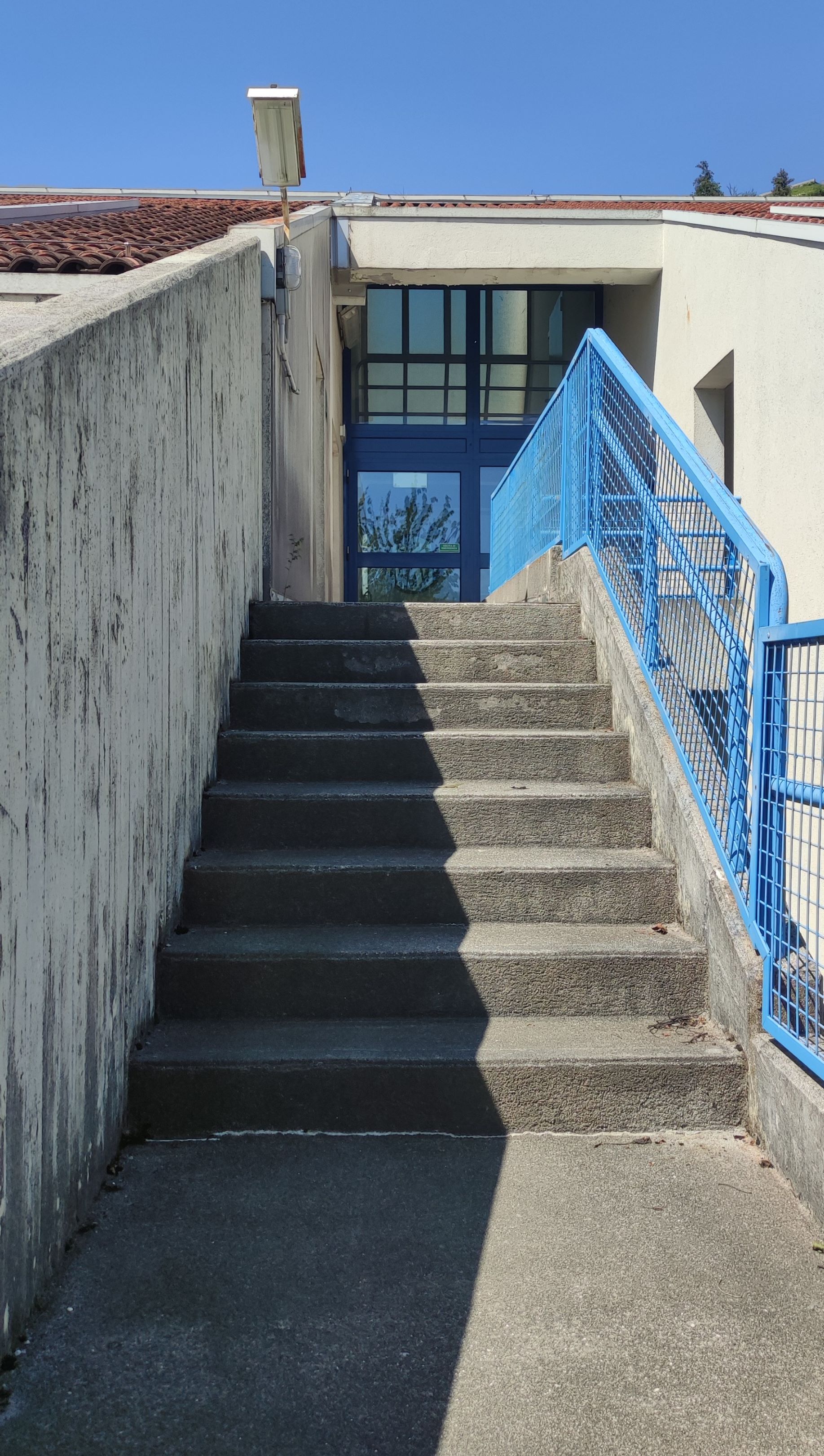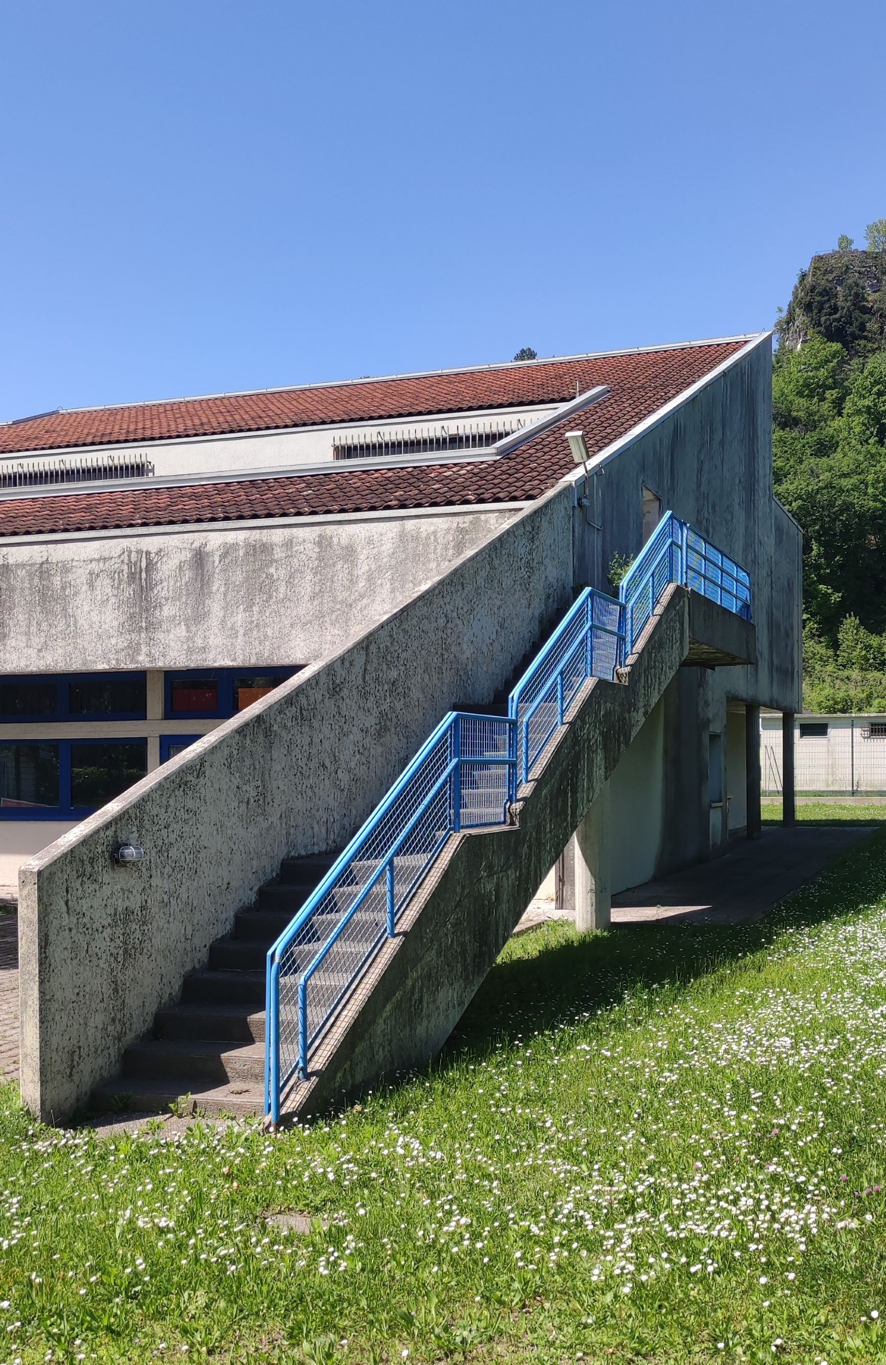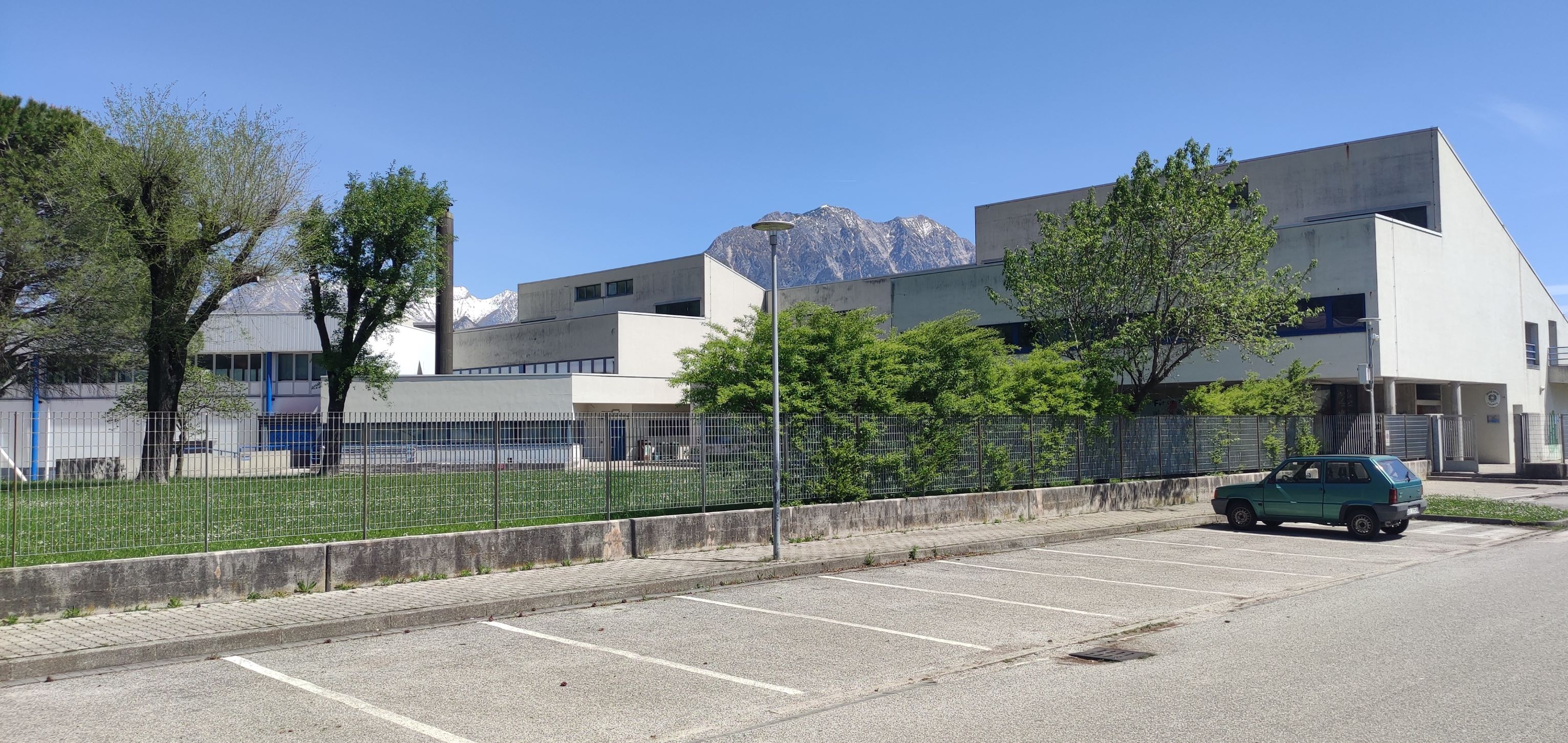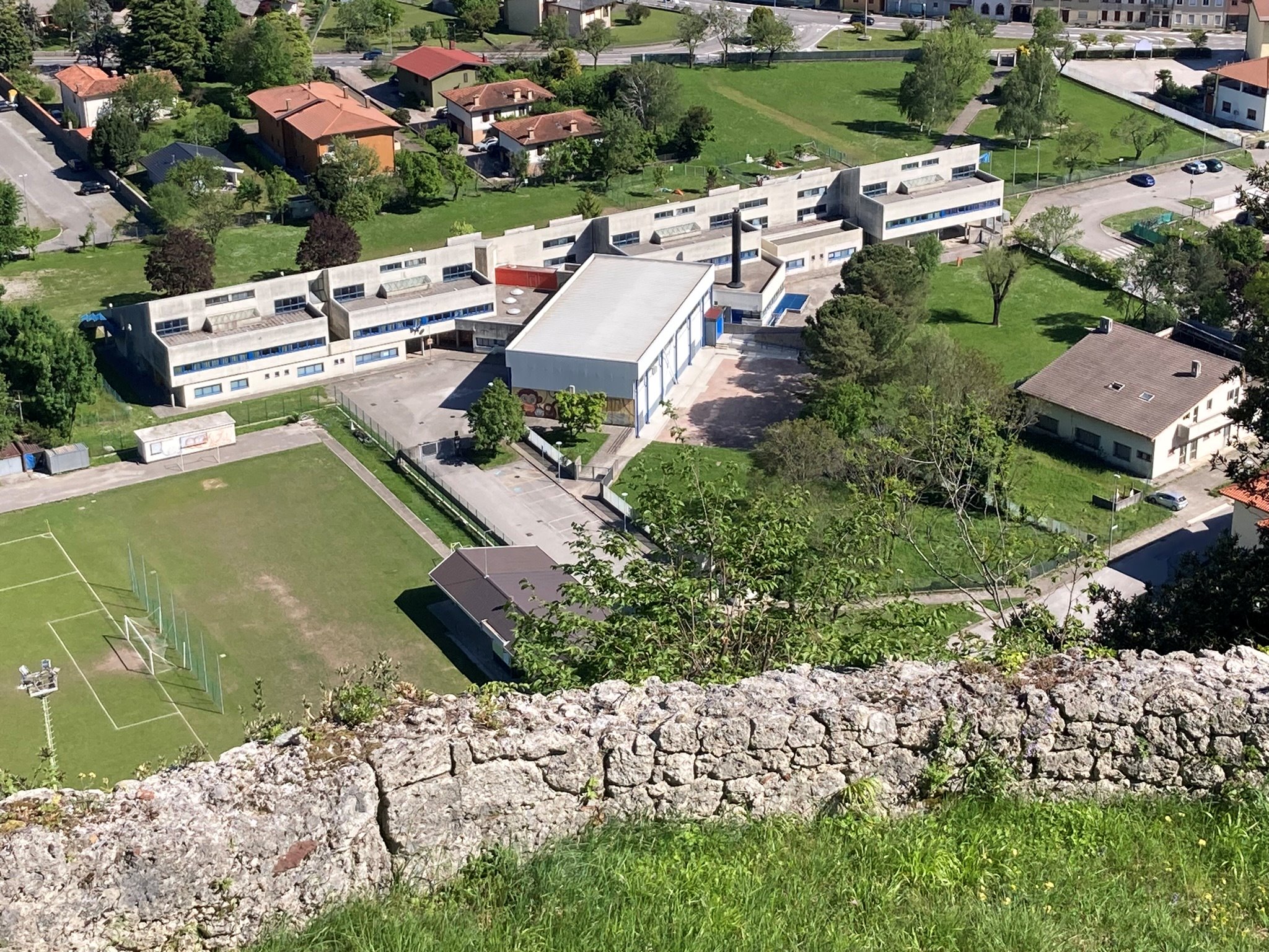 Le nuove scuole, progettate da Giancarlo de Carlo (1919-2005) con la collaborazione di Fausto Colombo (1937-2010) e finanziate dal governo americano all’indomani del terremoto del 1976, si collocano fuori dall’abitato cittadino, in un contesto di particolare qualità ambientale, ai piedi del colle del Forte di Osoppo. L’impianto, a sviluppo longitudinale, con esposizione est-ovest, è organizzato su base modulare costituita dallo spazio aula-tipo. Il profilo triangolare, accentuato visivamente dalla serie di rampe nel fronte sul giardino, rende manifesta la sezione digradante caratterizzata da un piano terrazzato a interruzione dei volumi coperti da falde inclinate. Le aule sono concepite come luoghi complessi in grado di assecondare in maniera versatile combinazioni multiple per gruppi variati di studenti e prendono luce non solo dalle facciate vetrate, ma sono rischiarate anche in profondità da lucernari in corrispondenza di spazi aggiuntivi di lavoro. Scompaiono i corridoi tradizionali a vantaggio di spazi di connessione variamente configurati come luoghi di socializzazione dotati di prolungamenti a cielo aperto nella serie di terrazze al primo piano, a loro volta direttamente connesse attraverso le rampe di scale esterne al giardino antistante. Visto da questo ampio spazio scoperto, l’edificio si mostra sullo sfondo del colle boscoso con il suo profilo scalato che ne stempera l’impatto volumetrico, a tutto vantaggio di un virtuoso inserimento ambientale. L’edificio si mantiene in ottime condizioni di conservazione.